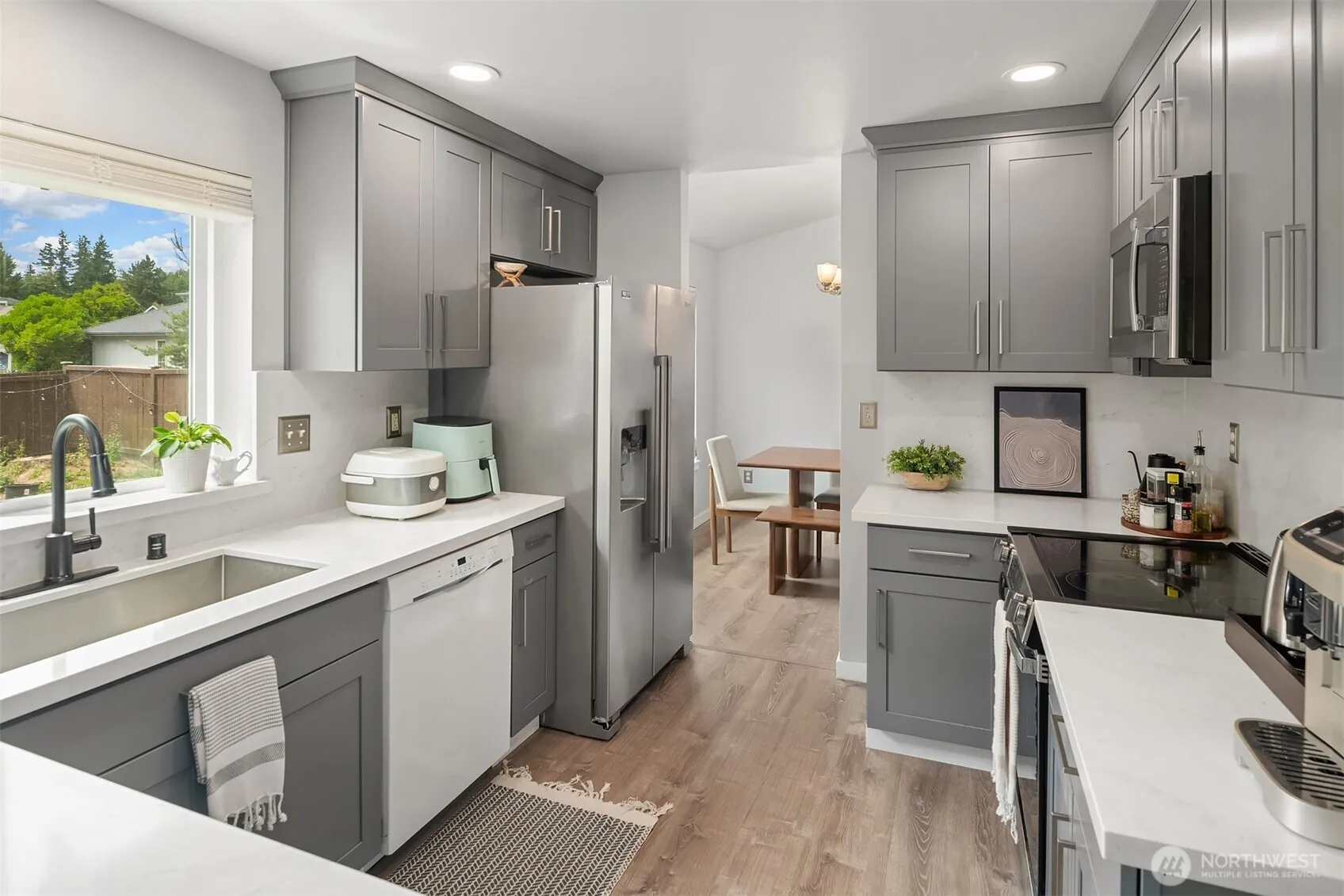 Beautifully maintained Belmont Woods home featuring soaring vaulted ceilings & bright, natural light thru-out. Fully-renovated Kitchen & Baths (2 full-length Showers upstairs + 1/2 bath on Main) w/ New quartz countertops, cabinets, paint, & floors. New Luxury Vinyl Plank flooring on the main level, elegant French doors open to a custom covered deck, perfect for year-round entertaining & relaxation. Spacious primary Bed includes a private Bath & WIC cabinets. Enjoy the benefits of 2019 windows, roof, Hardie Plank siding, & garage doors for peace of mind. Fully-fenced yard offers a sprinkler system, garden space & 3-car garage. Community park & playground nearby. Highly regarded Tahoma SD close to shopping, trails, & everyday conveniences.