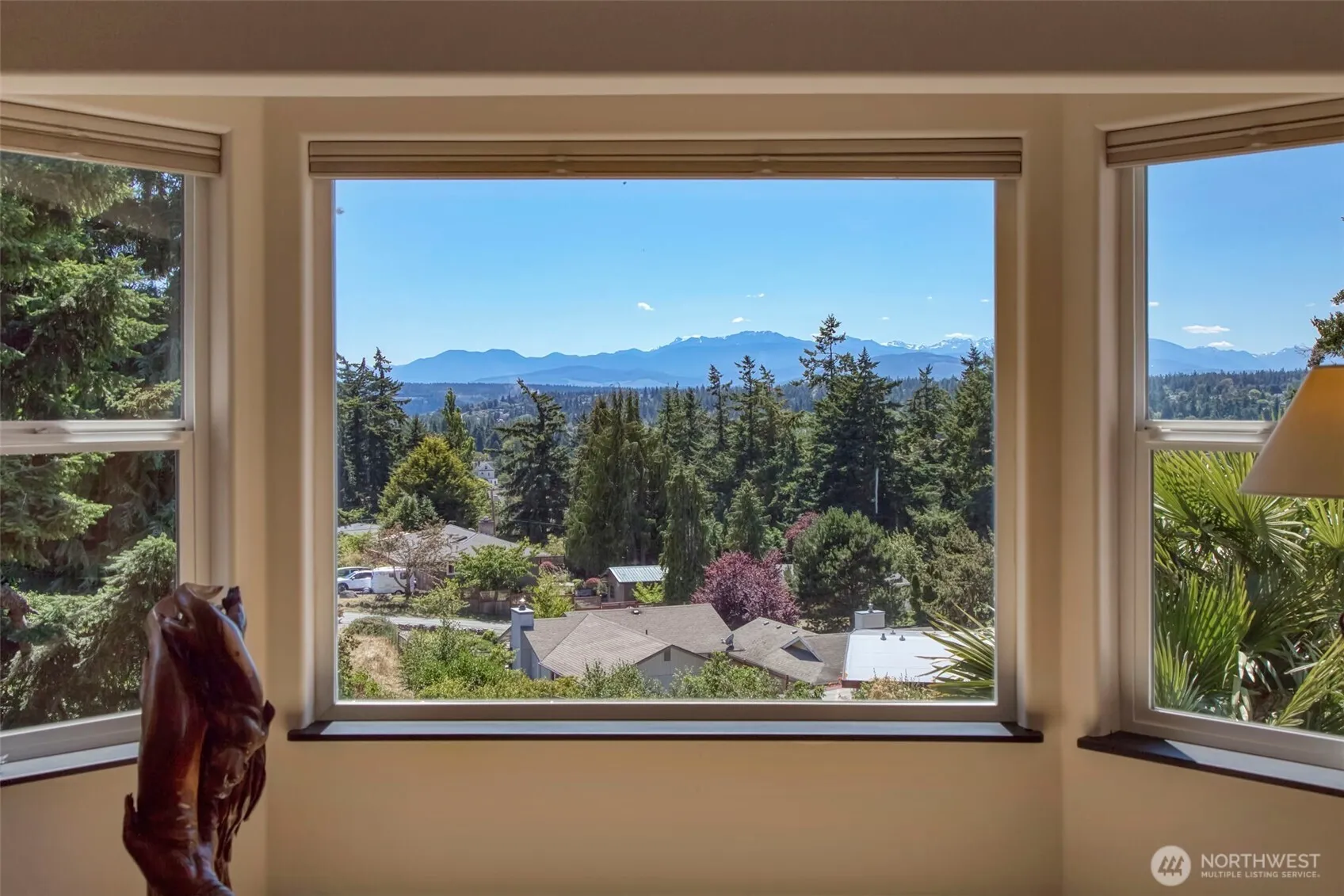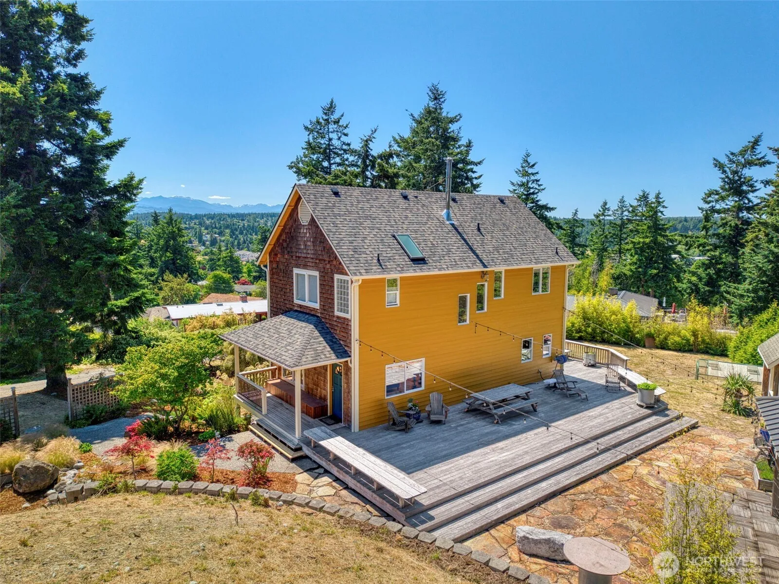 Cook amazing meals and enjoy it with friends. Stunning exotic hardwoods abound here. This open concept floor plan allows the chefs to interact with their guests both inside and outside. Expansive exterior cumaru and purpleheart decks. The kitchen boasts custom gorgeous figured makore full overlay kitchen cabinets with luxurious Richlite countertops, and artisanal stainless-steel backsplash. In the basement, past the flex space currently housing quilter’s paradise, is the wine room with custom Richlite wall and enough space to organize your collection. Notice the sapele trim throughout, and lovely inlaid floors on the stairway landing. Expansive Olympic Mountain views from primary bedroom and living room. New roof in 2024 and HVAC in 2019.