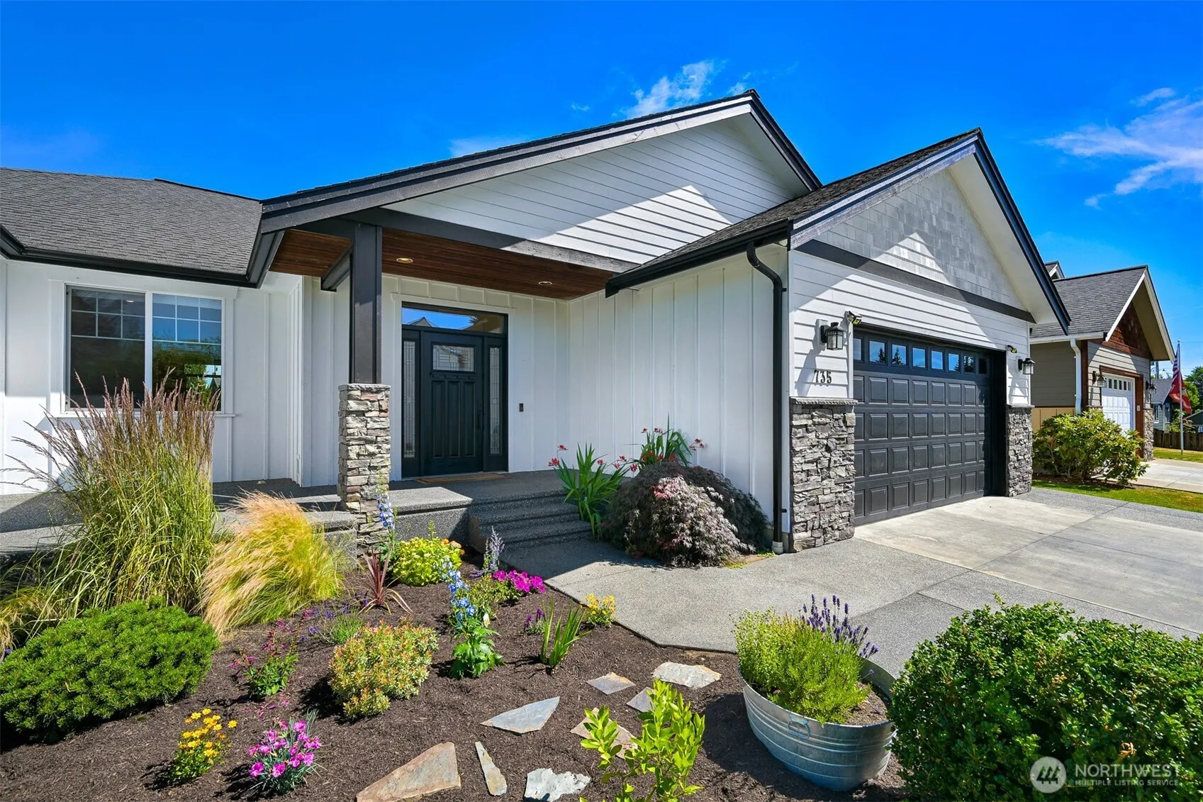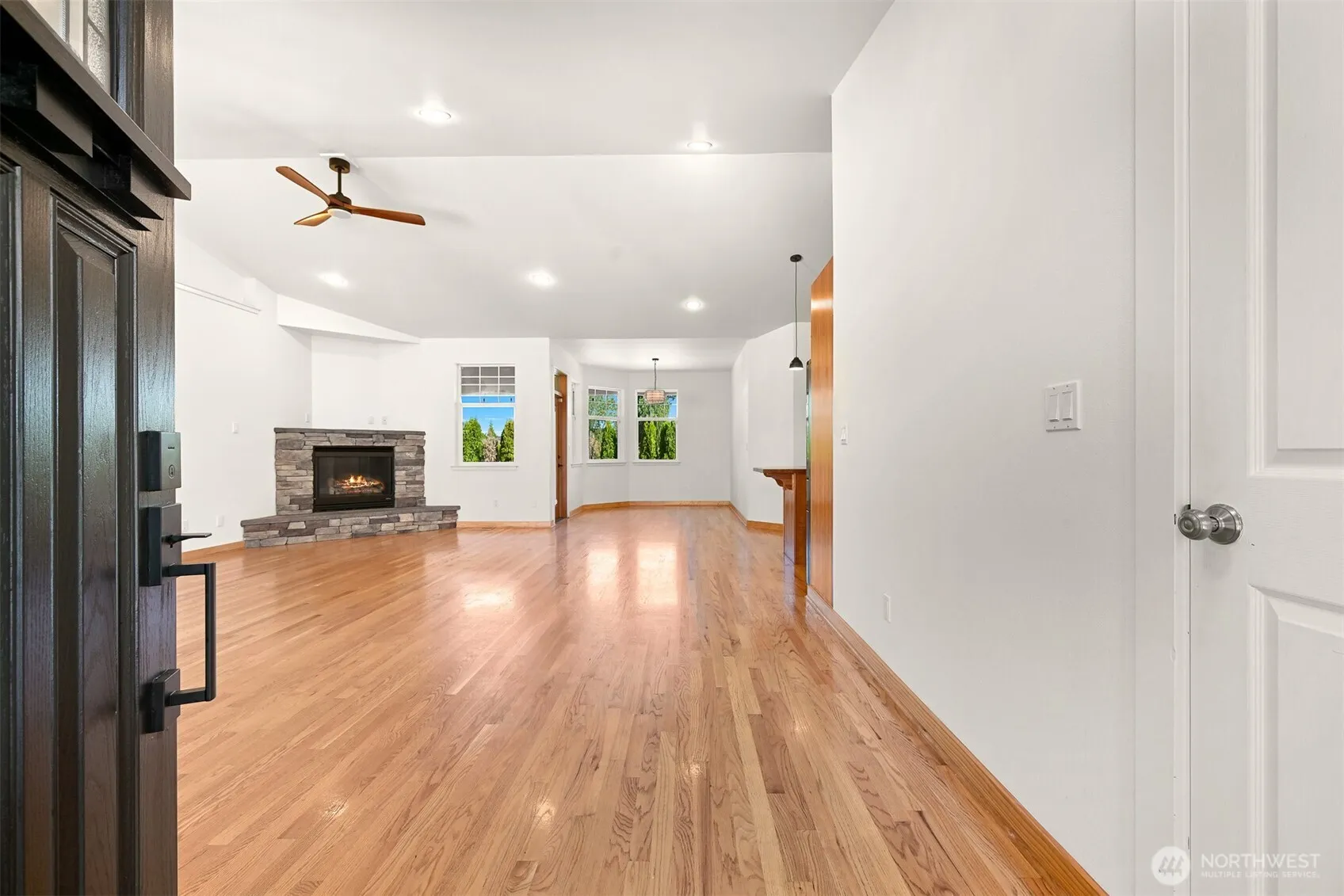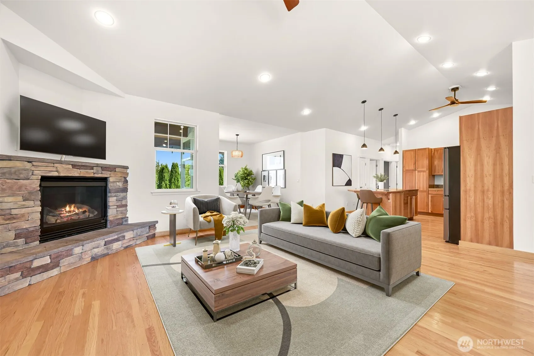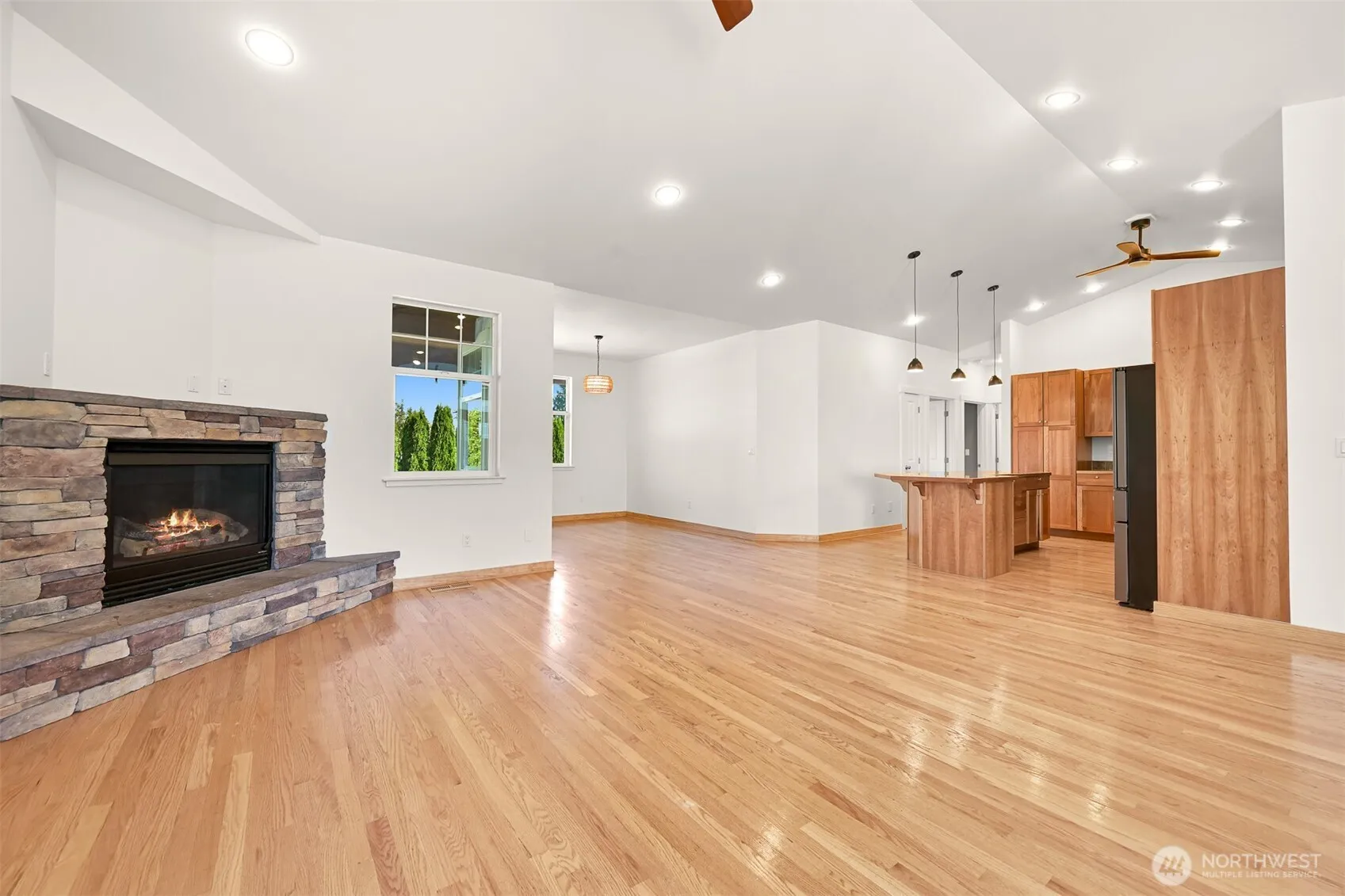 Beautifully maintained RAMBLER offering nearly 2,000 sqft of single-level living on a quiet corner 8,000+ sqft lot at the end of a dead-end street. Inside, enjoy hardwood floors, vaulted ceilings, and a spacious kitchen that flows into bright living and dining areas ideal for entertaining or relaxing. Both bathrooms have been thoughtfully remodeled and updated, including the expansive primary suite with direct patio access. Step outside to a private backyard with a large covered patio, garden beds, and space to play or unwind. A welcoming front porch and mature landscaping complete the charm. Just steps from Lynden’s new trail system and walking bridge, combining unbeatable walkability, outdoor recreation and the best of small-town living!