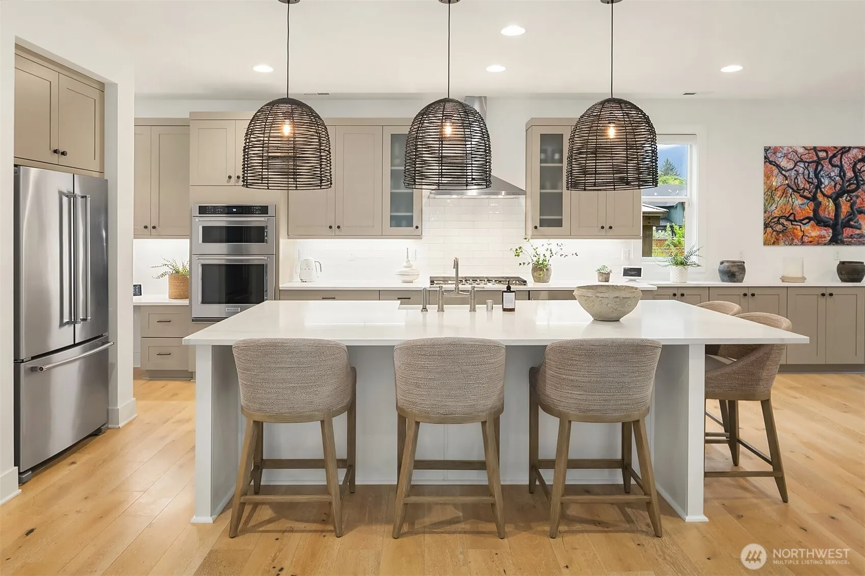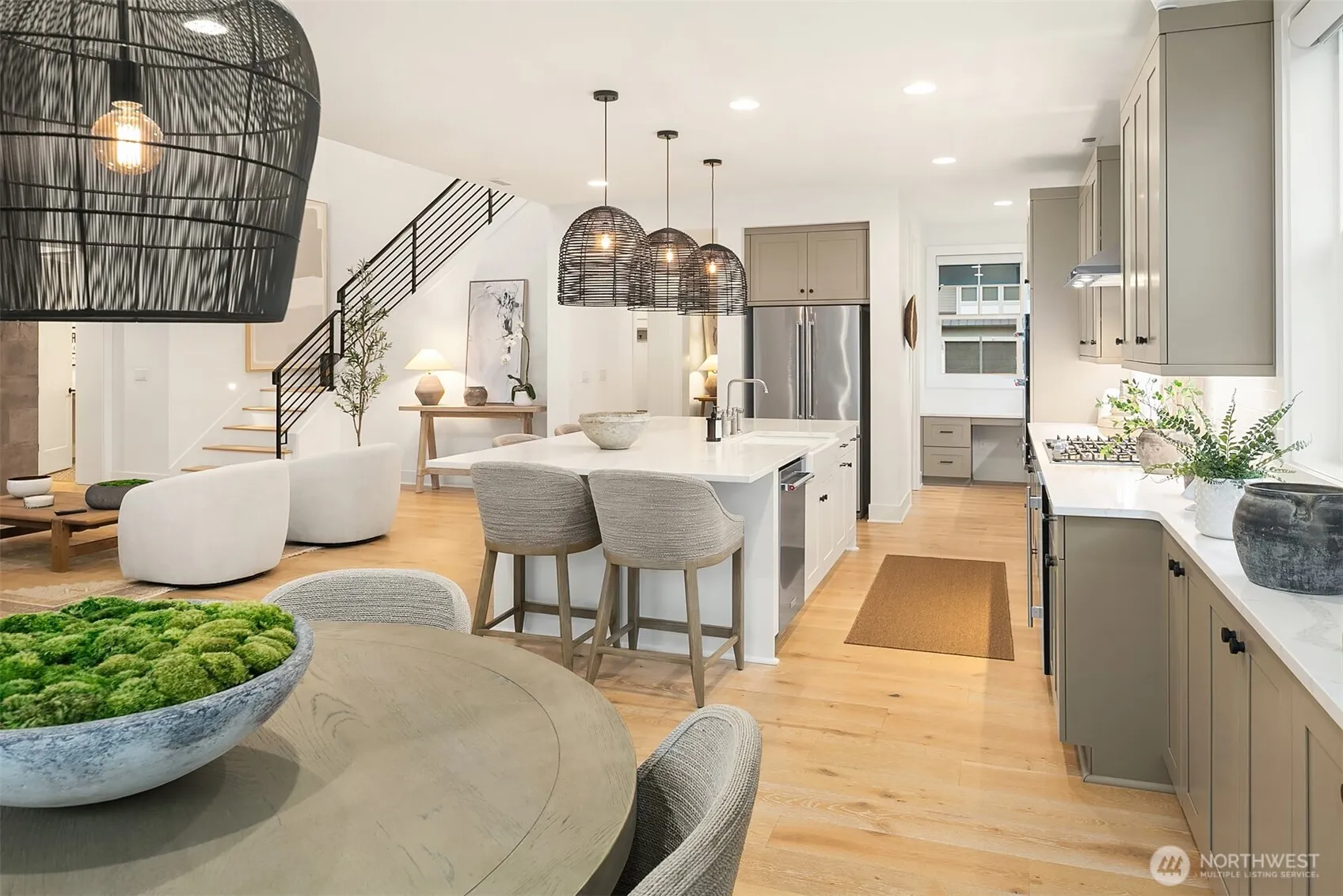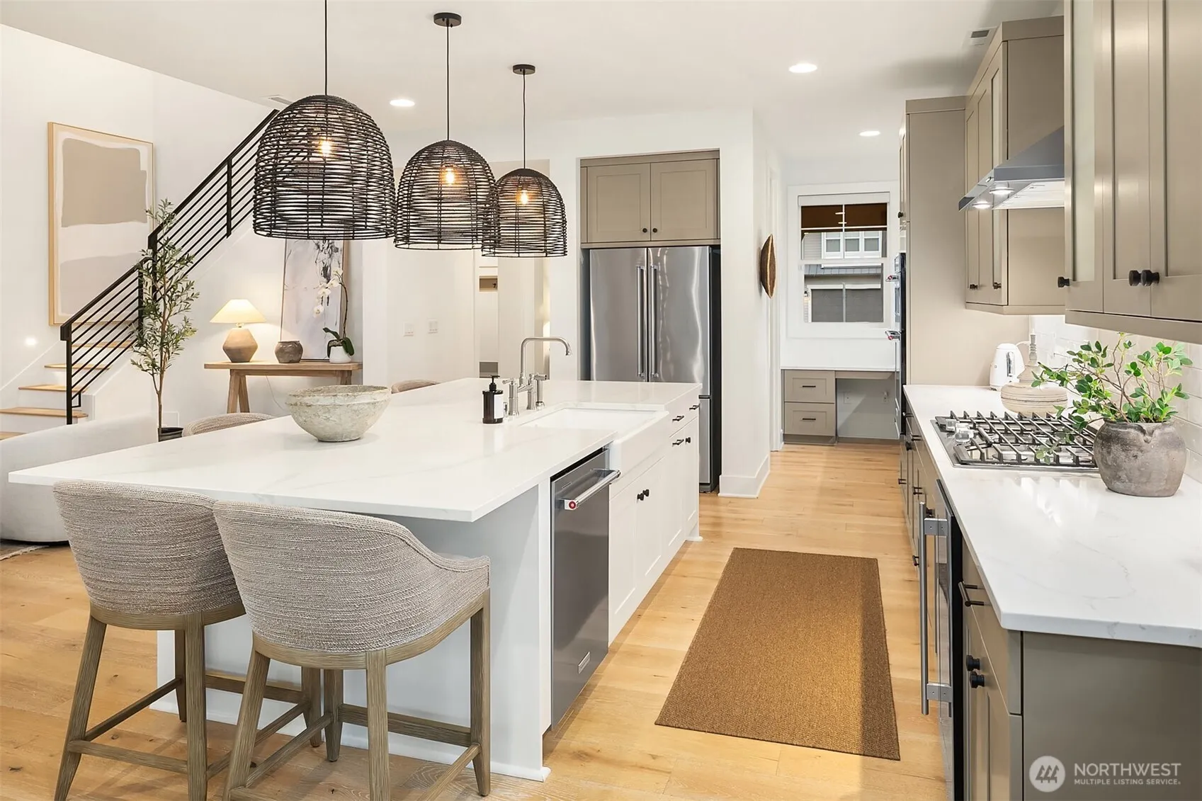Experience casual elegance in this luxury home, blending comfort with style and no expense spared. The main-floor primary suite is a spa-like retreat with a five-piece bath, walk-in shower, soaking tub, & custom closet. The chef’s kitchen features a large island, quartz counters, stainless steel appliances, & designer lighting. Enjoy seamless indoor-outdoor living with a covered deck & built-in speakers. The family room boasts vaulted ceilings & a stone-encased gas fireplace perfect for cozy evenings by the fire. A main floor guest bedroom w/ separate 3/4 bath is convenient along with a massive mudroom & 2 car garage. Upstairs features a versatile loft area, 2 additional bedrooms & full bath to complete this home’s functional layout.