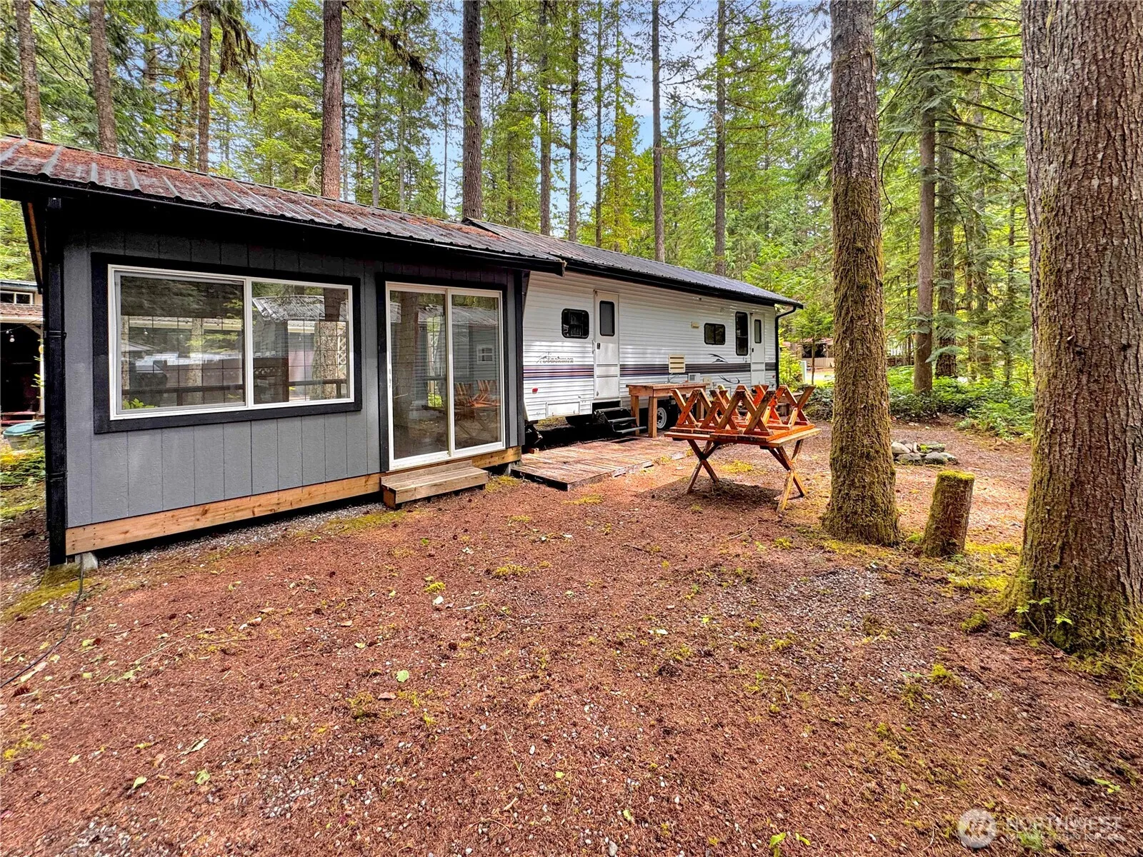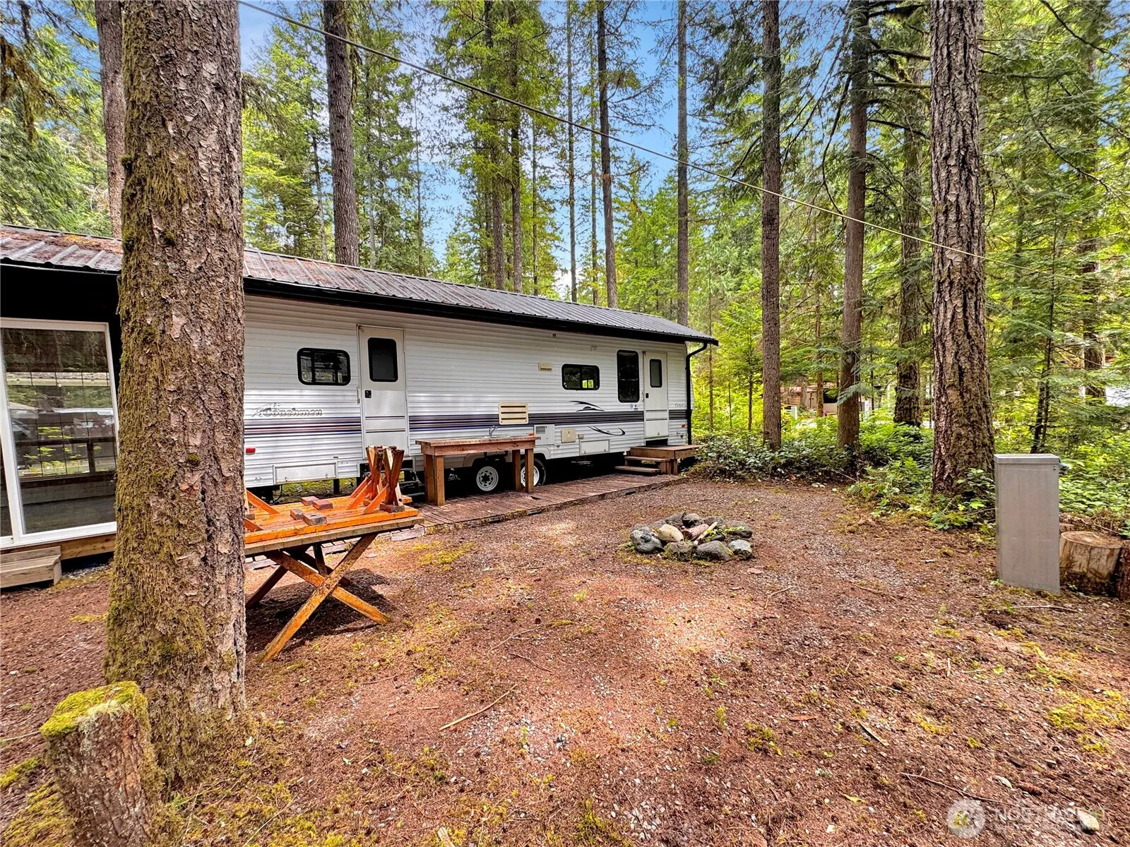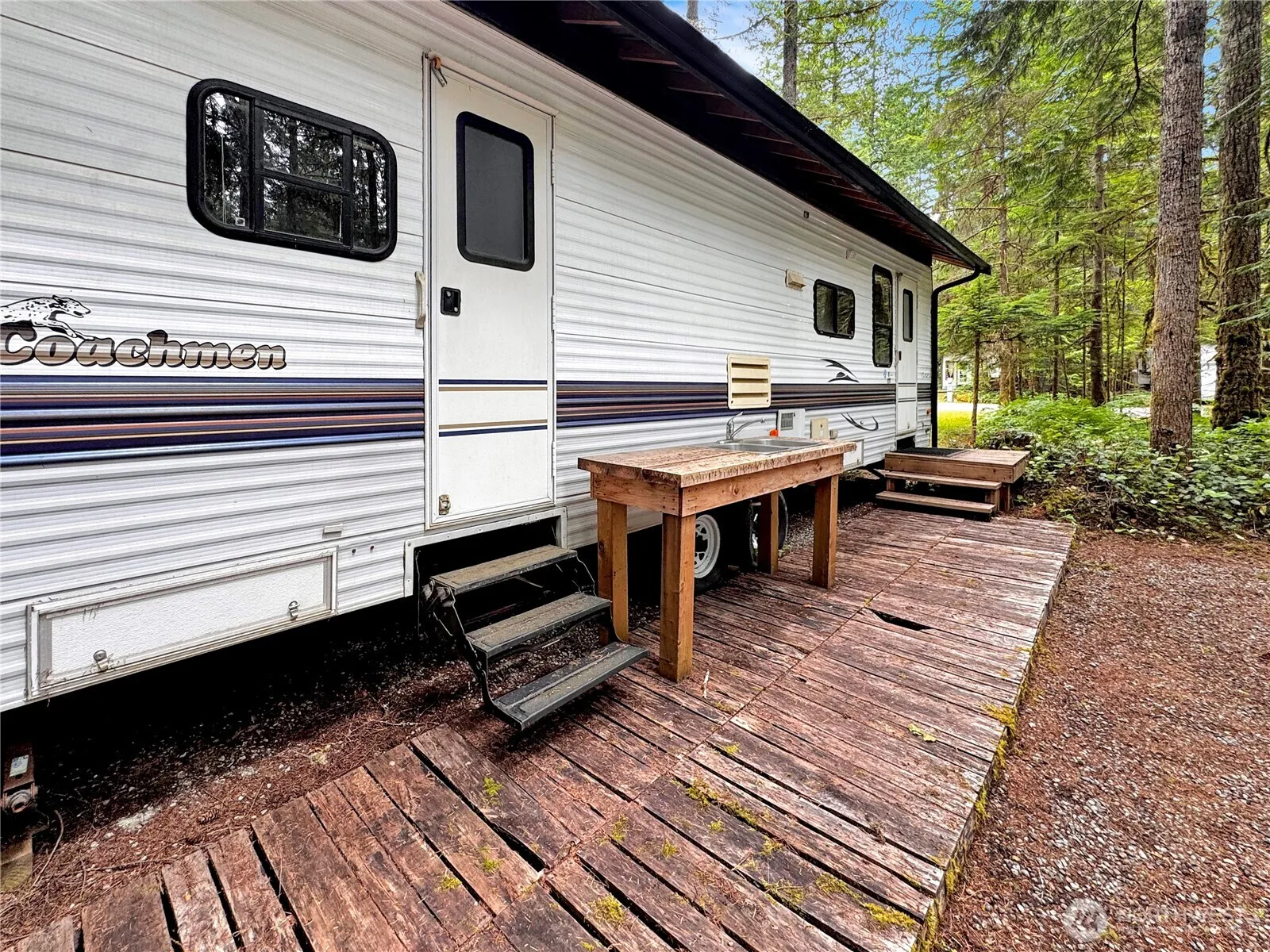 Located on lot 242, this well-kept 1999 Coachman trailer offers a smart layout with plenty of storage. The spacious deck features an outdoor sink and a versatile gazebo. A separate storage space provides space for all of your camping gear. Enjoy the firepit and the added privacy of adjacent greenspace. The Glen is a 120day recreational community, that offers 24/7 gated security and resort-style amenities: 2 pools, hot tub, tennis court, clubhouses, playgrounds, library, laundry, and more, your getaway is ready!