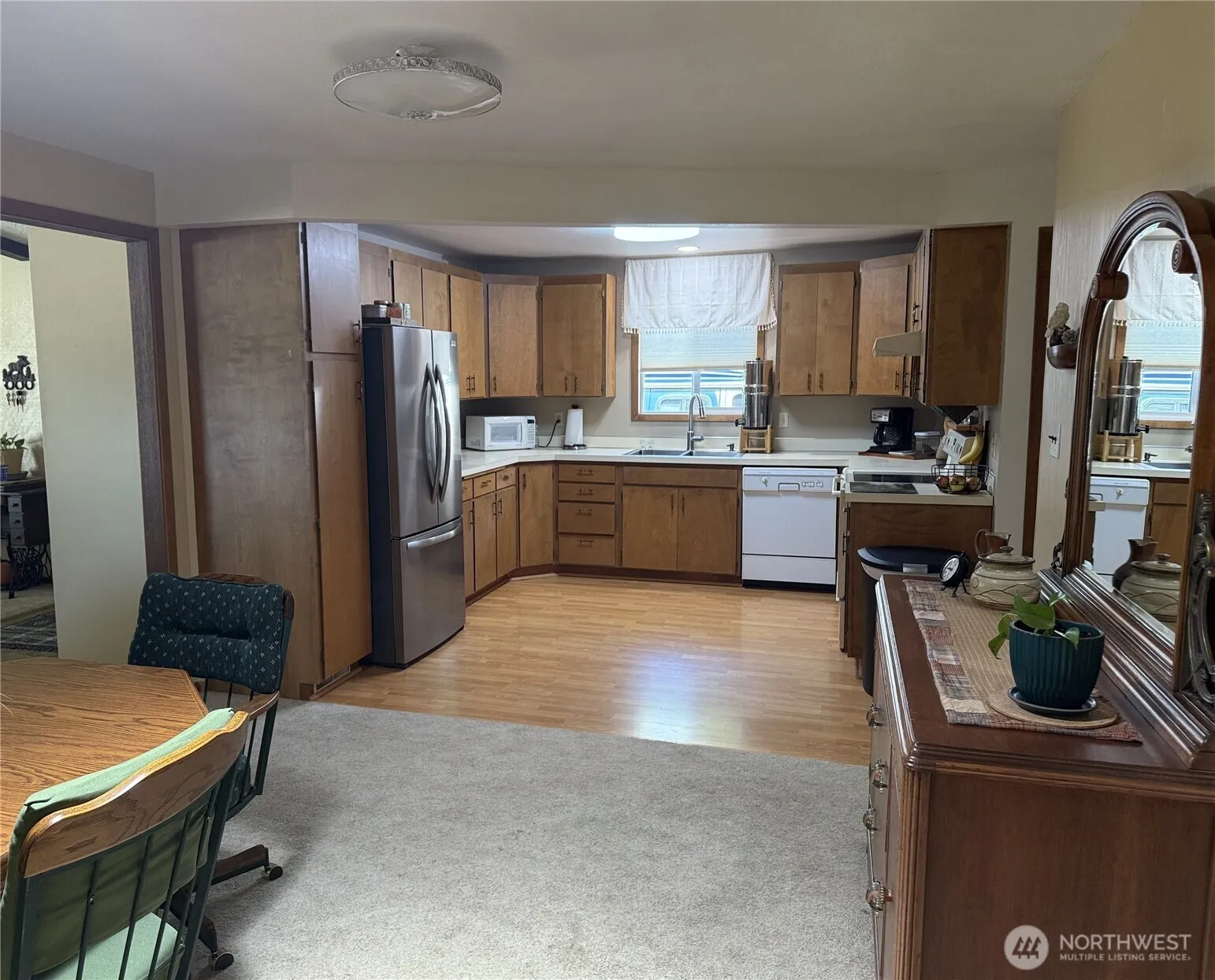 Well-maintained 2-bedroom, 2-bath home on an oversized lot. Built in 1979, the main floor features a semi-open layout with the living, dining and kitchen areas. The bathroom with a large walk-in shower, new vanity and light fixtures. Spacious utility room with deep sink, ample storage and plenty of space for a freezer or pantry. Full basement includes a finished room (window not to code) and ¾ bath. The potential for added living space is there to create a rec/room or exercise area or additional bedrooms. Bring your ideas. The roof and heat pump were new in 2021. A drive-thru garage with carport. Partially fenced backyard, patio and u/g sprinklers. This could be the home for you!