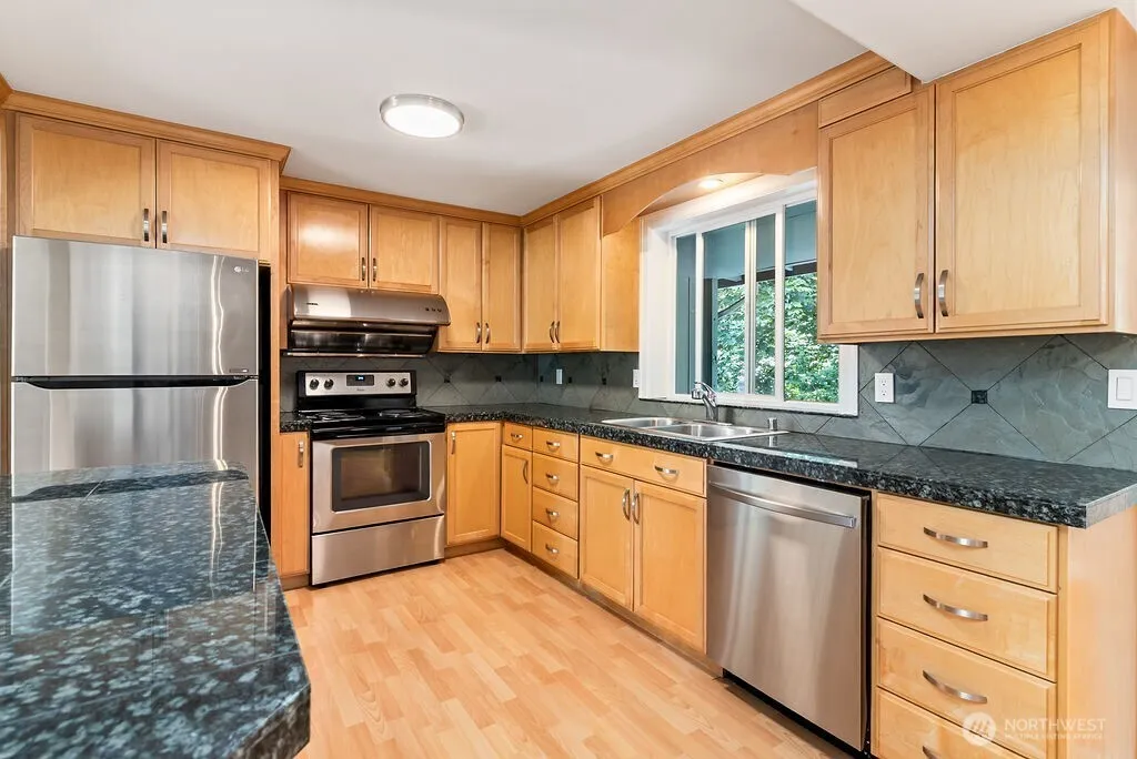 Welcome to this nicely updated home on a quiet cul-de-sac with privacy. Features hardwood flooring at the entrance and stairs, new laminate throughout, carpet in bedrooms, and tile in bathrooms. Fresh interior paint, modern light fixtures, and built-ins add charm. The formal dining area offers a built-in china cabinet with access to a covered balcony. The primary bedroom features skylights and a full en-suite bath with soaking tub and separate shower. The lower level includes a bedroom and bonus room with kitchenette, private covered deck, and a half bath combined with the utility area—ideal for guests or multi-use. Enjoy a private backyard surrounded by mature trees. Garage has extra storage and a long extended driveway for ample parking.