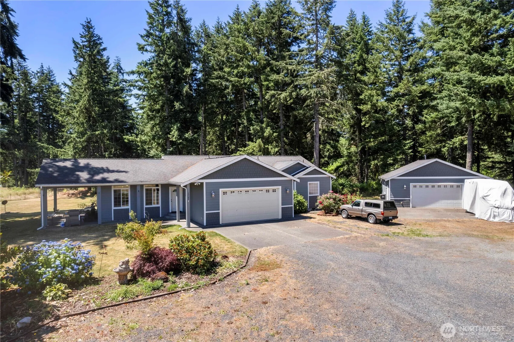 Situated in a private setting, this beautifully built single-story custom home features an open-concept living room, dining room, and kitchen area. Space to entertain in the kitchen that features tons of cabinets and counter space, a pantry, and a large center island with additional storage and work space. The home features 3 bedrooms, 2 full bathrooms, and a utility room. The primary bedroom is huge with a walk-in closet and an attached bathroom. Home is situated on a treed, serene, level, usable 2.49 acres that has room for animals and hobbies. This home has two covered patio areas that are perfect for outdoor entertainment. Large shop with additional space for storage and an attached garage. Close to Lacey, Olympia, and JBLM.