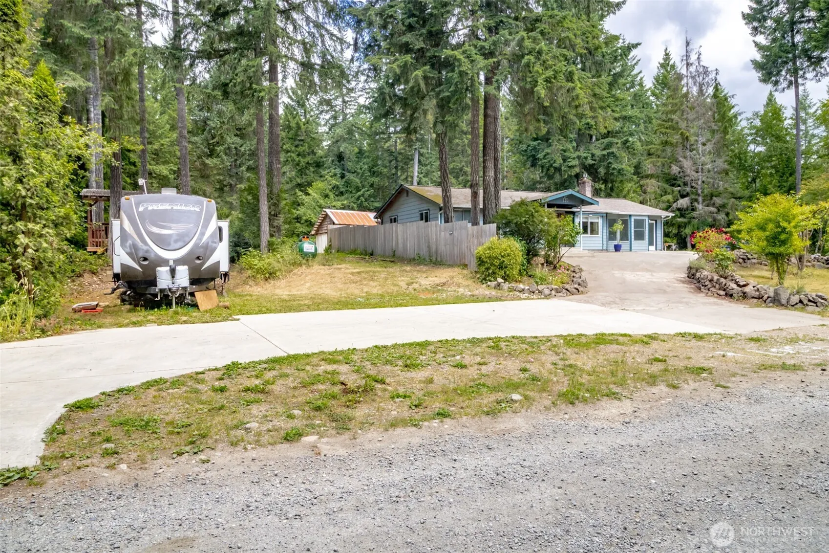 Lease to own/seller financing available. New septic 7-8-25. Electric fireplace also plumbed for propane. Hardwood laminate throughout, recent smart appliances & lighting. Shaded parking & two semi-circle driveways. Private side yard RV space with power, water, black water disposal, 180 gallon propane tank & covered deck. Back area has accessory building with utilities stubbed in and 190 gallon propane, buildable slabs & 2nd RV Slab/panel from additional 200A service. Currently set up as single home, but has previously been income property with 1)primary 1/2 bath, main bath, and 2) independent studio with ¾ bath, storage & deck and 3) RV set-ups. Owned land, not leased as in Cushman. Golf, lakes, trails. Hoodsport marina & shops 1 mile.