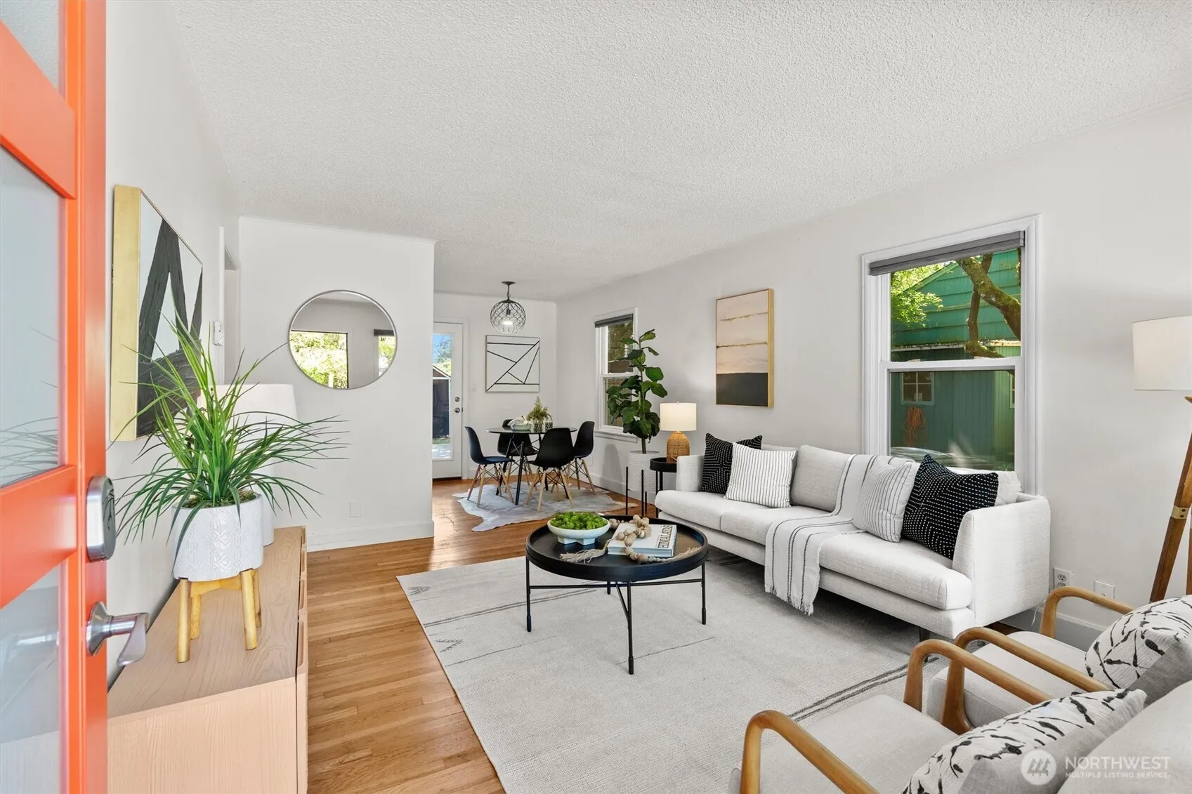 Welcome to this charming rambler, nestled on a spacious 8,000+ sq ft lot. Full of classic Seattle charm, this modern home features a peaceful front porch surrounded by natural greenery. Inside, hardwood floors flow through the living room and dining area. Step out onto the inviting deck to enjoy your morning coffee while soaking in the beauty of the private and spacious yard. This home has two bedrooms; one offering a Murphy bed allowing for flexible living spaces. With a detached studio/shop, it’s the ideal place to create, entertain, workout or simply unwind. With versatile detached spaces, large lot and timeless style this home is a true gem.