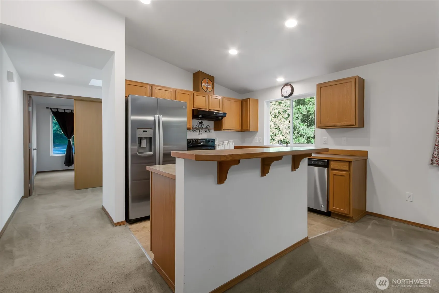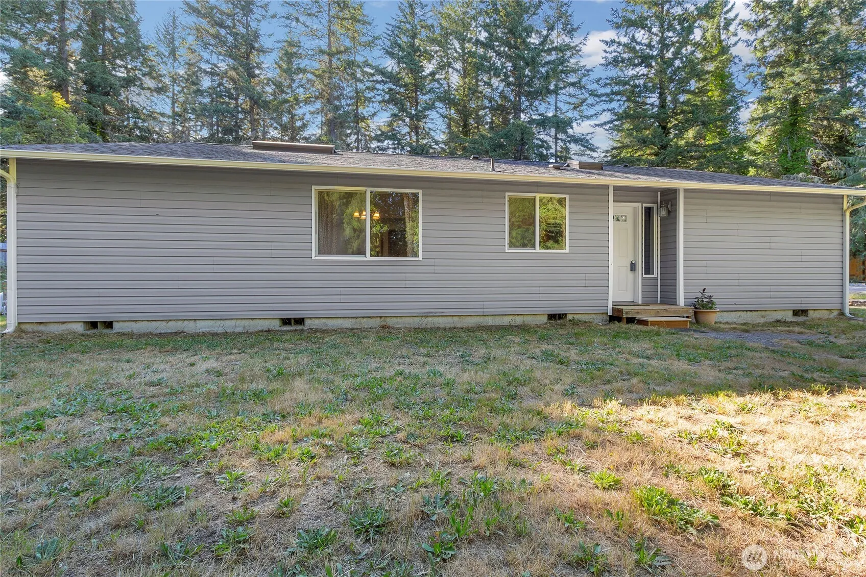 Welcome to this one level home on acreage. Privacy and room to take nature walks in your own back yard. Wooded with large Cedar trees too. Home offers 3 bedrooms and 2 baths, Great room off kitchen. Kitchen has a breakfast bar & overlooks the wooded acreage. Primary suite has a good sized walk in closet and a private full bath. Utility room leads into the garage. Extra covered parking with a newer carport, plus more storage in the 8×20 storage container. You can enjoy the summer with lots of room to explore. Make sure to mark this one as a must see.