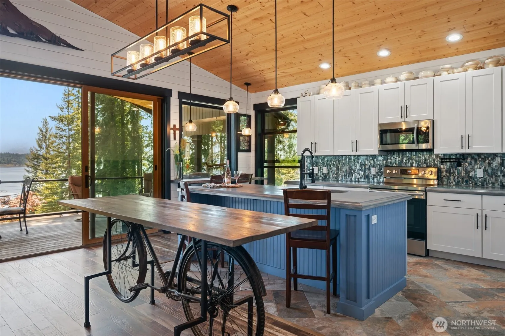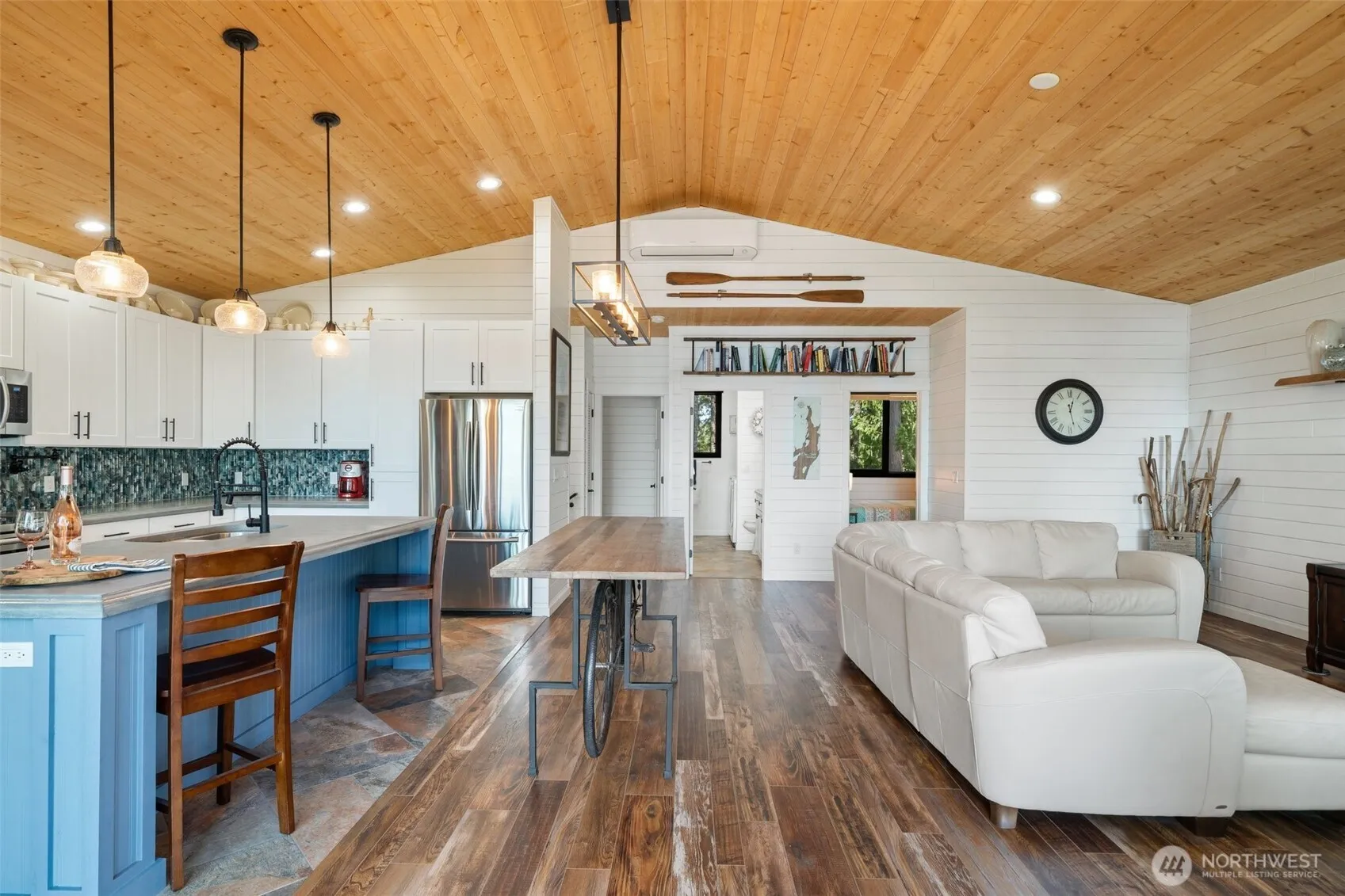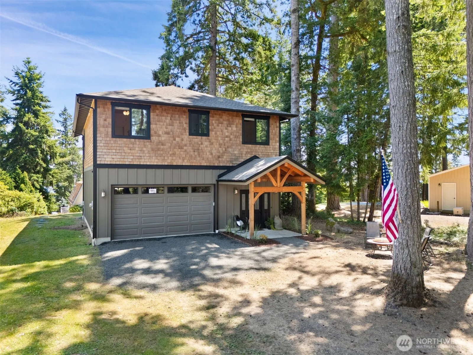 Escape to Treasure Island—whether for weekends or forever. This custom-crafted home offers Puget Sound views, an open-concept layout, and double slider that open to a spacious covered deck for year-round indoor-outdoor living. Built by a skilled woodworker, it’s full of charm and character, with a timber-framed entry, shiplap walls, and cardecking ceilings. Two bedrooms and a full bath sit on the primary upper floor, plus a flexible ground-level room and second bath—perfect for guests, remote work, or play. An oversized garage includes workshop space for storage and tinkering. Enjoy the island lifestyle with a community beach and moorage dock just steps away.
