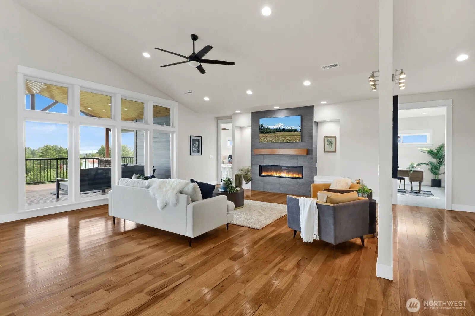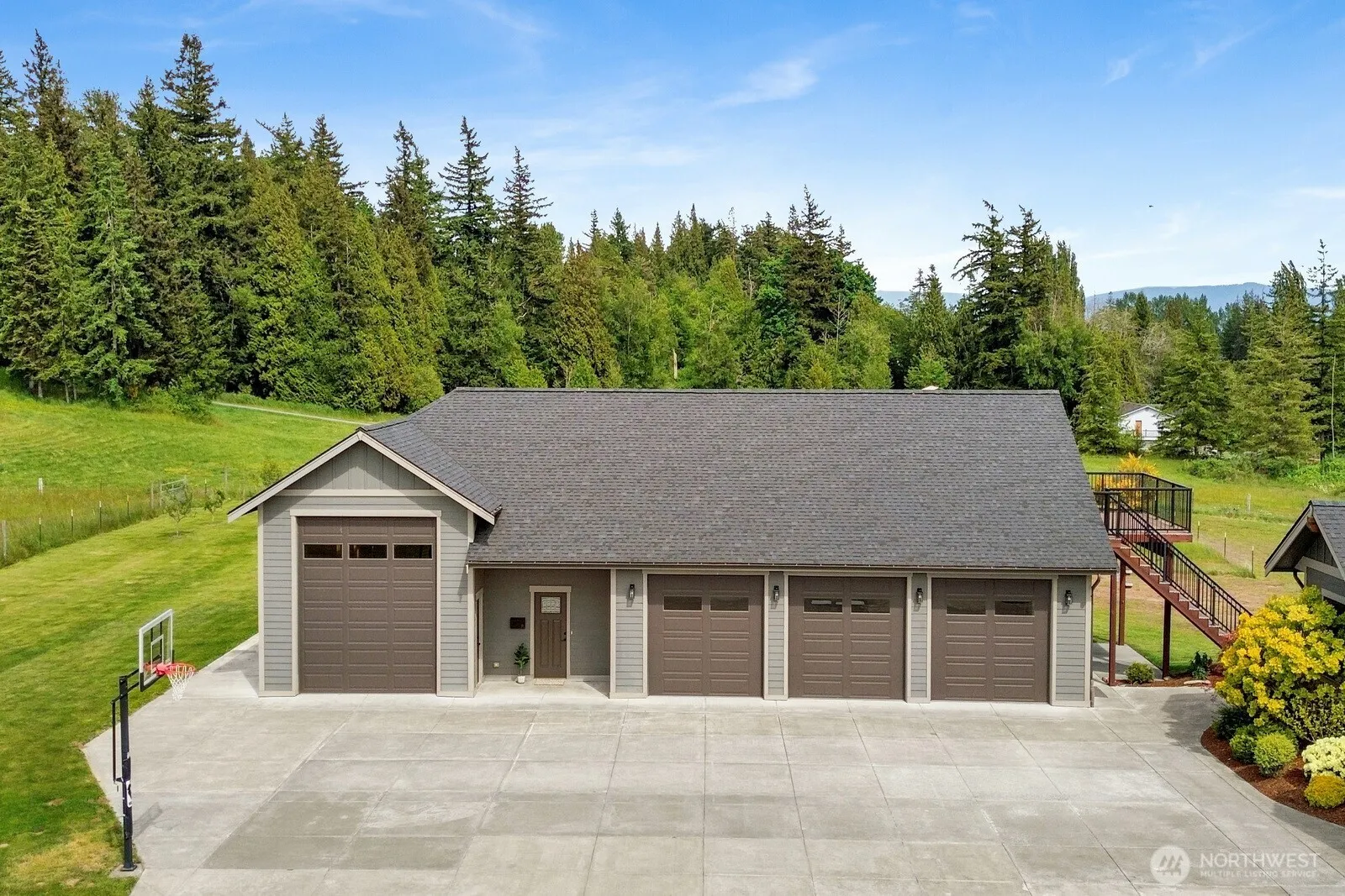 Pacific Northwest country oasis with bay views! Multi-generational living on 5 acres of fully fenced picturesque land. Dramatic interior spaces include soaring vaulted ceiling, rich hardwoods + inviting fireplace. Chef’s kitchen features a large island, wet bar, shaker cabinets, dual-oven + walk-in pantry. Spacious owner’s suite with floor-to-ceiling windows, spa bath, private laundry & deck. Separate living area + sprawling covered deck on lower level. Shop outfitted for RV, boat or storage. Luxury, fully detached no stairs ADU & bonus loft space above garage perfect for gym/office add 1,852 sq ft! This home has been genuinely cared for and lives like a hobby farm complete with chicken coop, orchards, fenced pasture and magical garden.