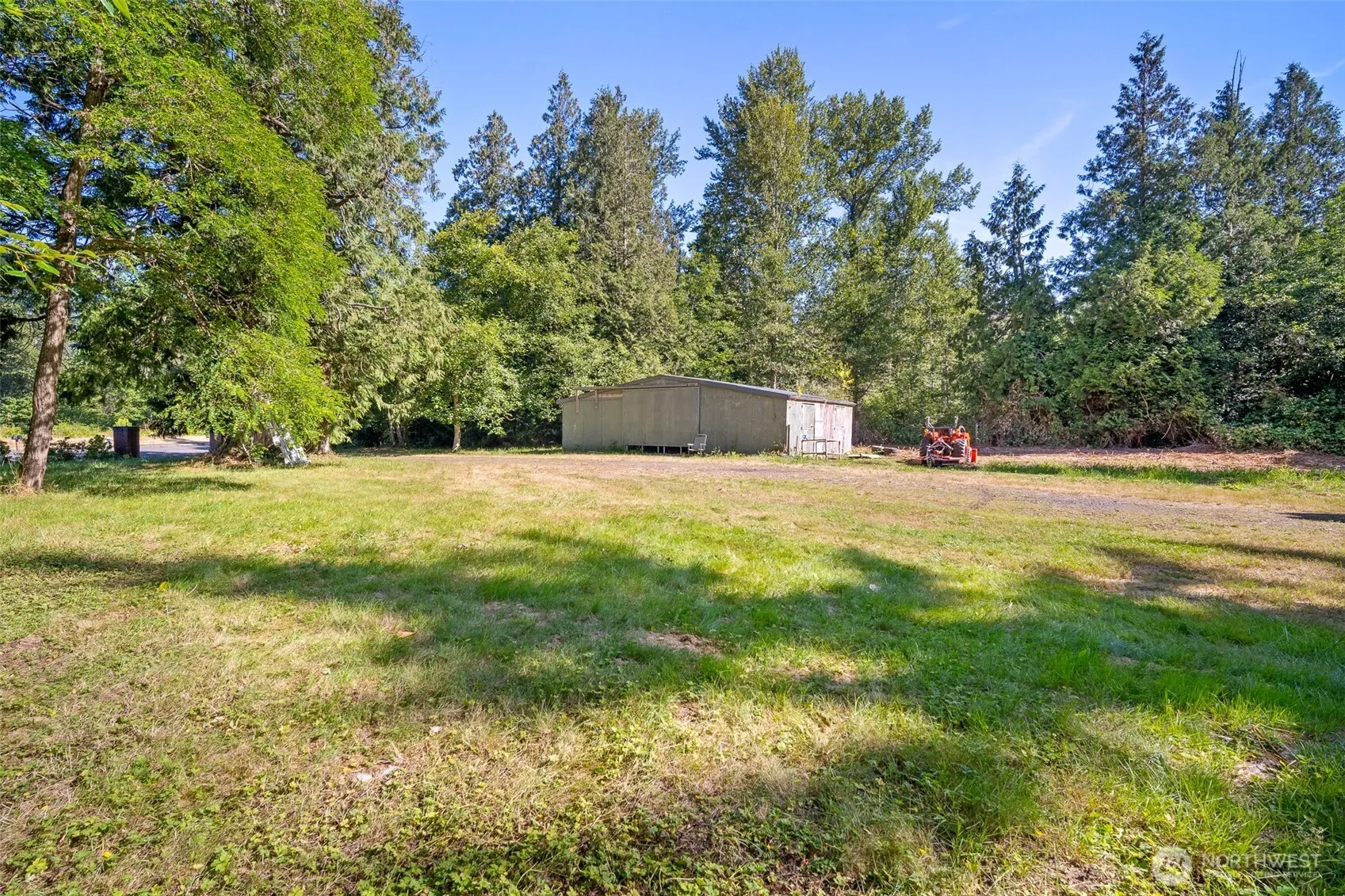 Discover an affordable horse property in a prime location just minutes from town! This 1.22-acre parcel is level, dry, and offers a wonderful balance of open space, mature trees and functionality. The charming 1-bedroom home (with office space) features an inviting layout filled with natural light and is thoughtfully positioned at the back of the property for added peace and privacy. There is a 920 sq. ft. barn, complete with four 12×12 stables and a partial concrete floor — perfect for your horses or additional storage needs. An existing 2-bedroom septic system offers flexibility for future expansion of the home. Zoned City of Blaine Manufacturing, this property also holds exciting potential for future development opportunities.