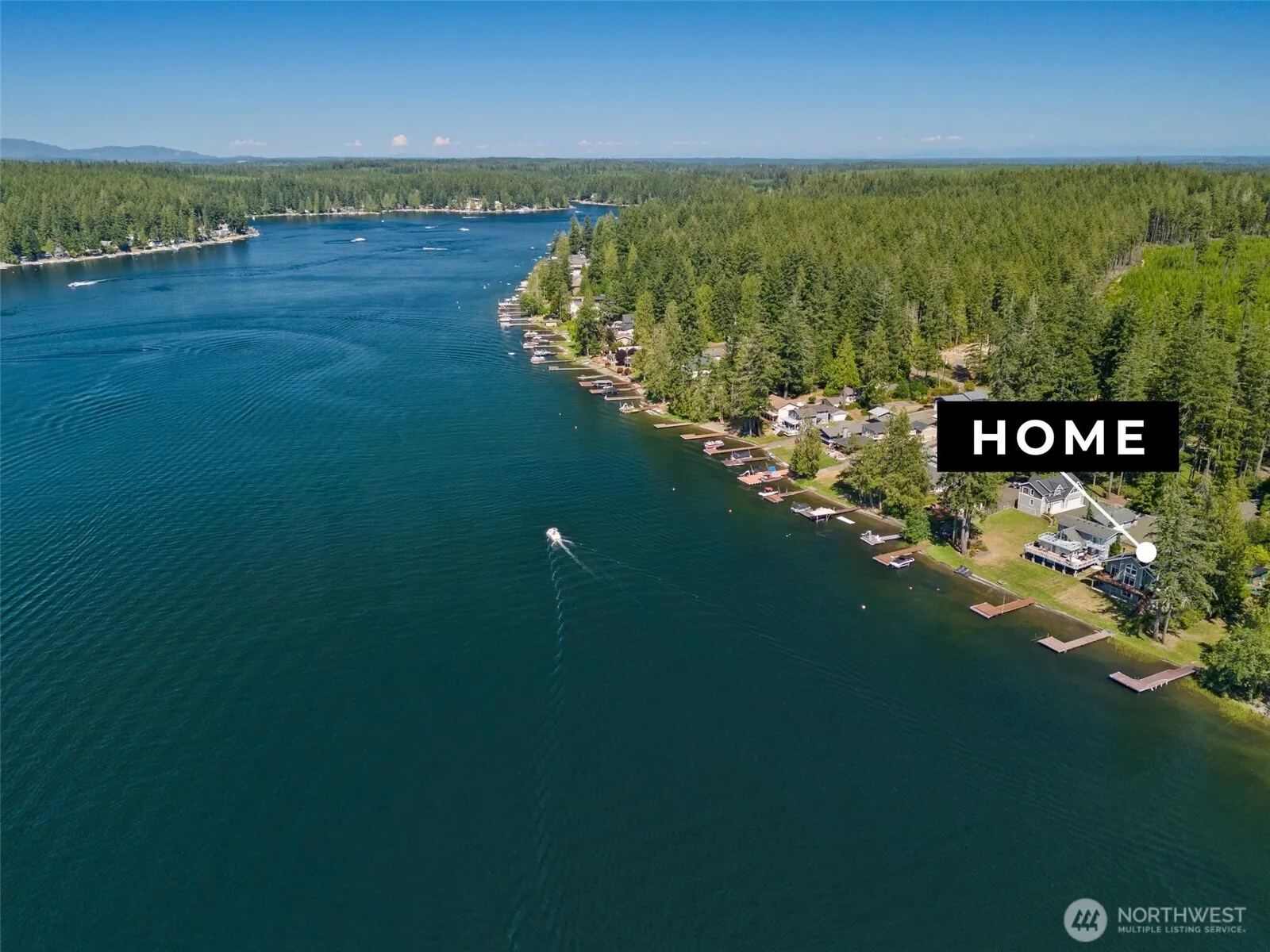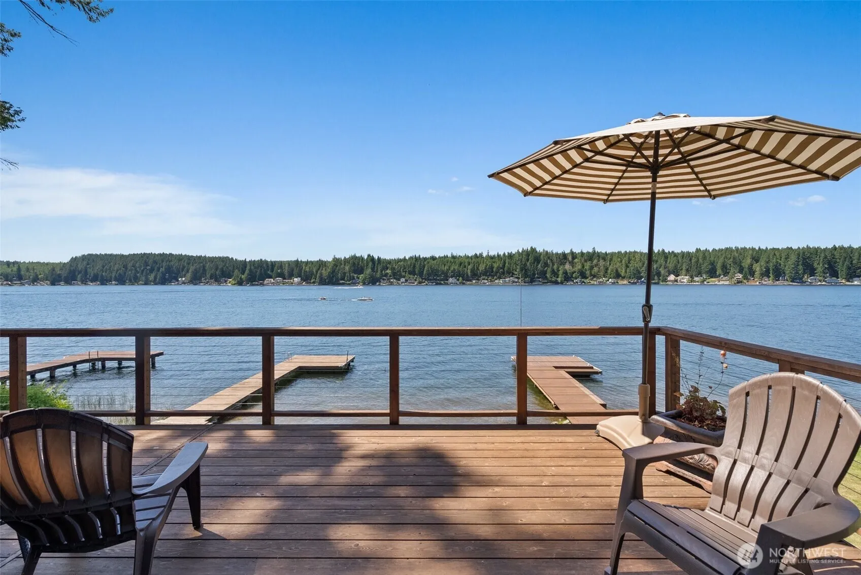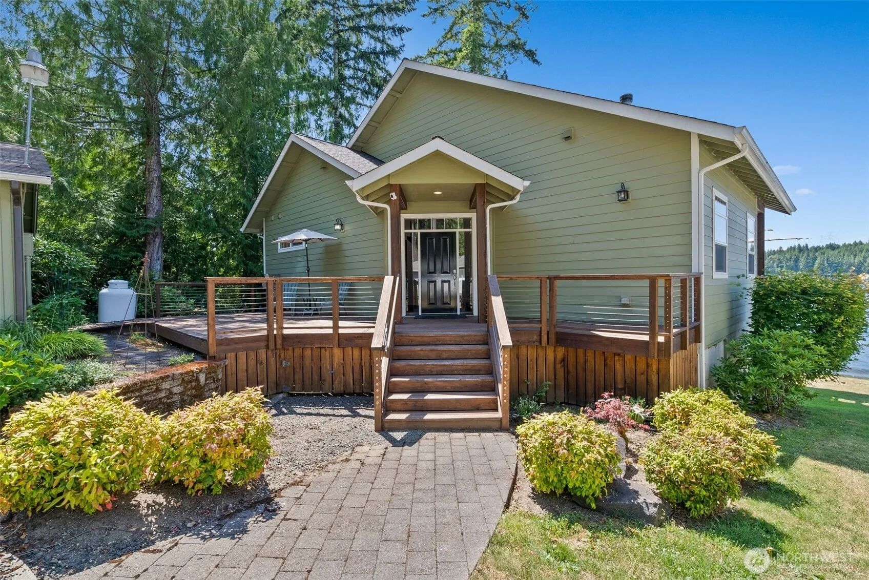 Enjoy 64′ of coveted no-bank shoreline with stunning western exposure and unforgettable sunsets on Mason Lake. This quality 2013-built home sits on a large, level lot and features an open-concept design with a main-level primary suite. The kitchen and living area flow onto a spacious deck with an outdoor fireplace—perfect for gathering with friends and roasting s’mores. The daylight basement includes a generous rec room and two additional bedrooms. A 2-car garage includes an attached bunkroom with its own bathroom, offering flexible space for guests. Come live the lake life in comfort and style!