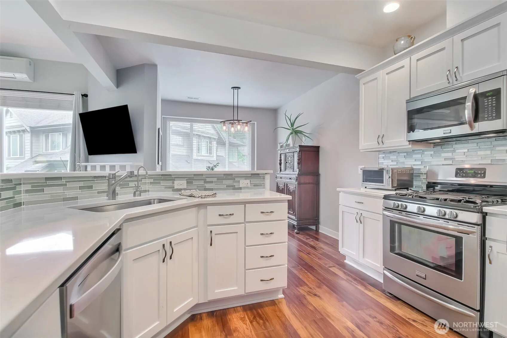 This pristine townhome w/dramatic entry & 9ft ceiling throughout, is one of the residences on 9 acres of lush vegetation that surround private ponds w/waterfalls & benches to sit & enjoy nature; these are a rich backdrop for Nature’s Landing homes. Today’s modern amenities are the perfect blend of comfort, elegance & livability-newer luxe kitchen w/adjacent living/dining rms also great for informal use. Lavish primary suite w/recently remodeled bath, large 2nd bedroom & bath & spacious laundry grace the 2nd level. New flooring throughout the main level that opens to a private deck overlooking private grounds, waterfall & pond…enjoy the sounds of nature! AC-mini splits. Walk to bus North Creek trail, MC Sports Park, Mill Creek Town Cntr.