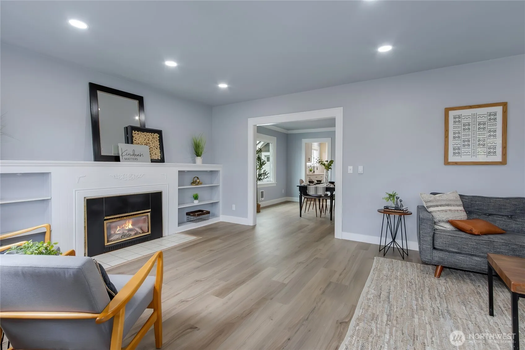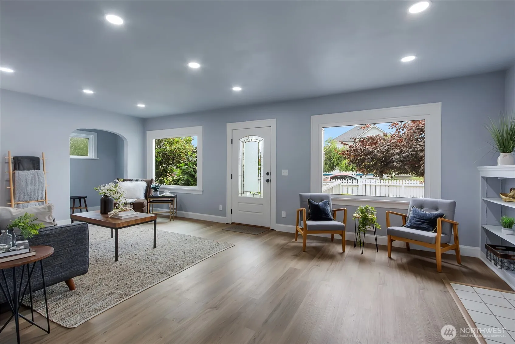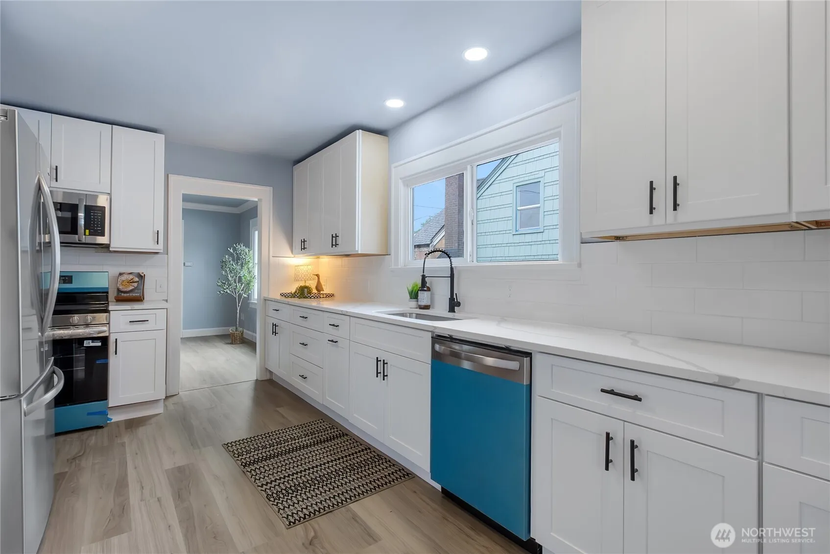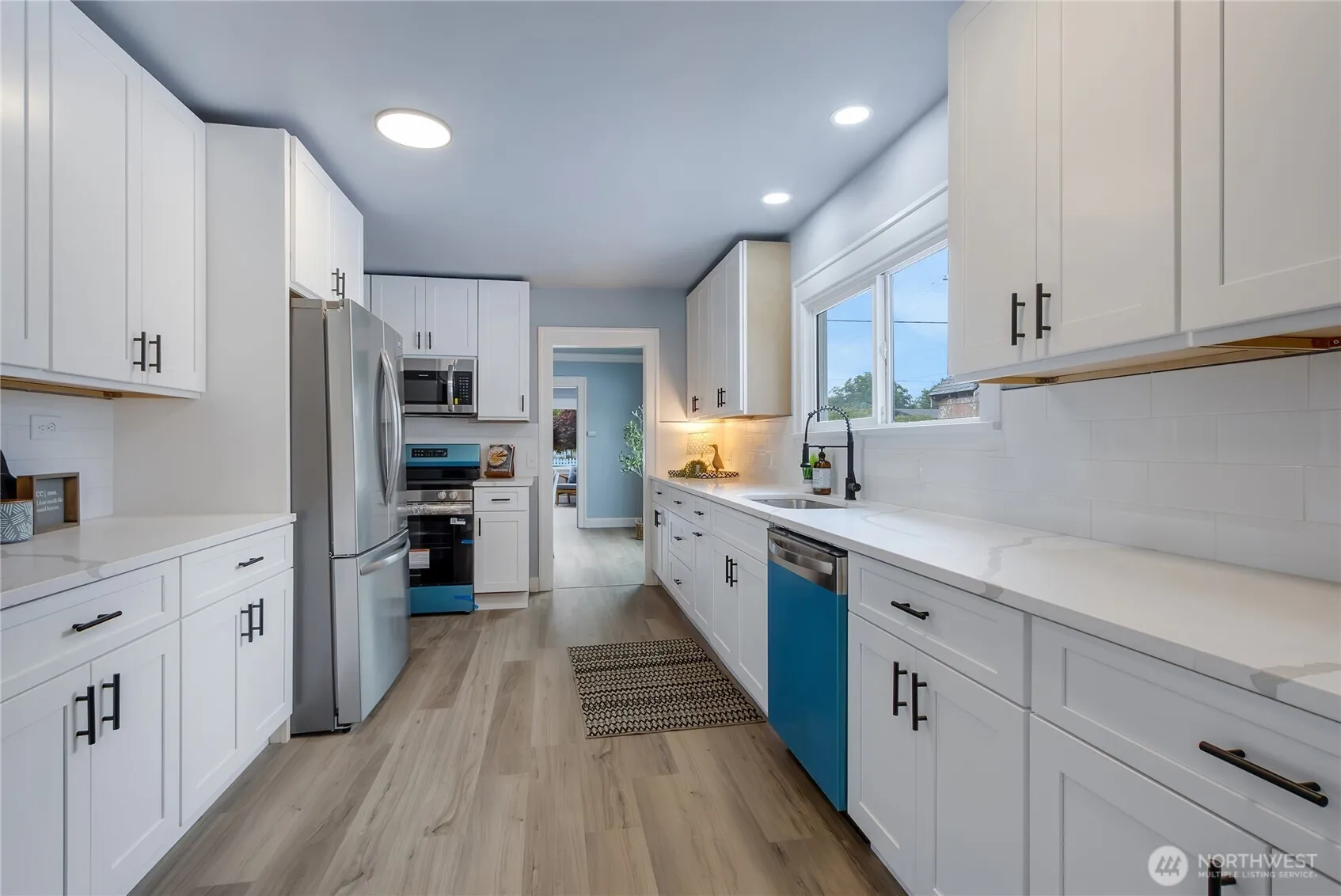 Beautifully updated 4 bed, 2 bath home in the heart of Hoquiam! This spacious home features an open floorplan with a large living room that flows into a fully renovated kitchen with white shaker cabinets and quartz countertops. The main floor primary suite includes a private deck, while the oversized laundry room adds convenience. Both bathrooms have been tastefully remodeled. Enjoy a fully fenced yard, large garage, and easy access to schools, parks, shopping, and more!
