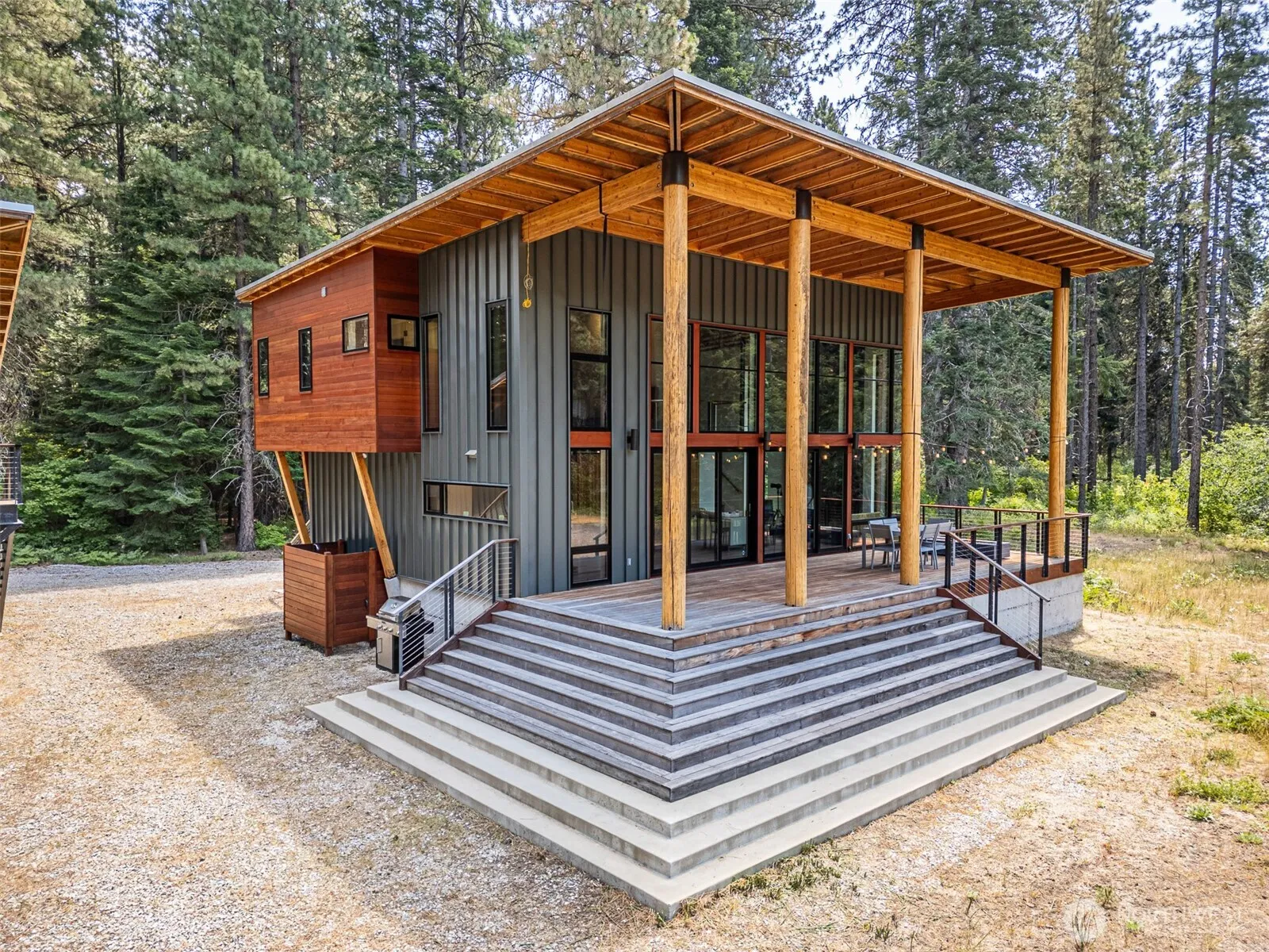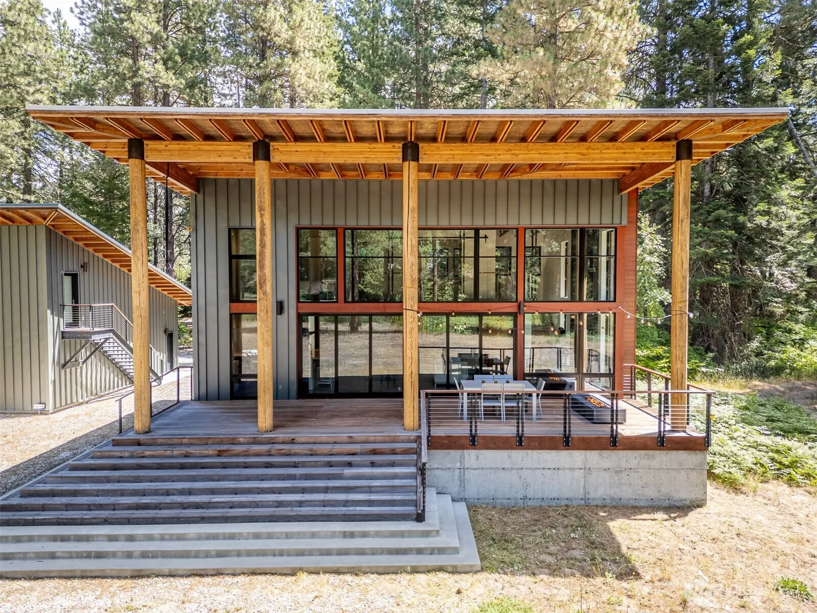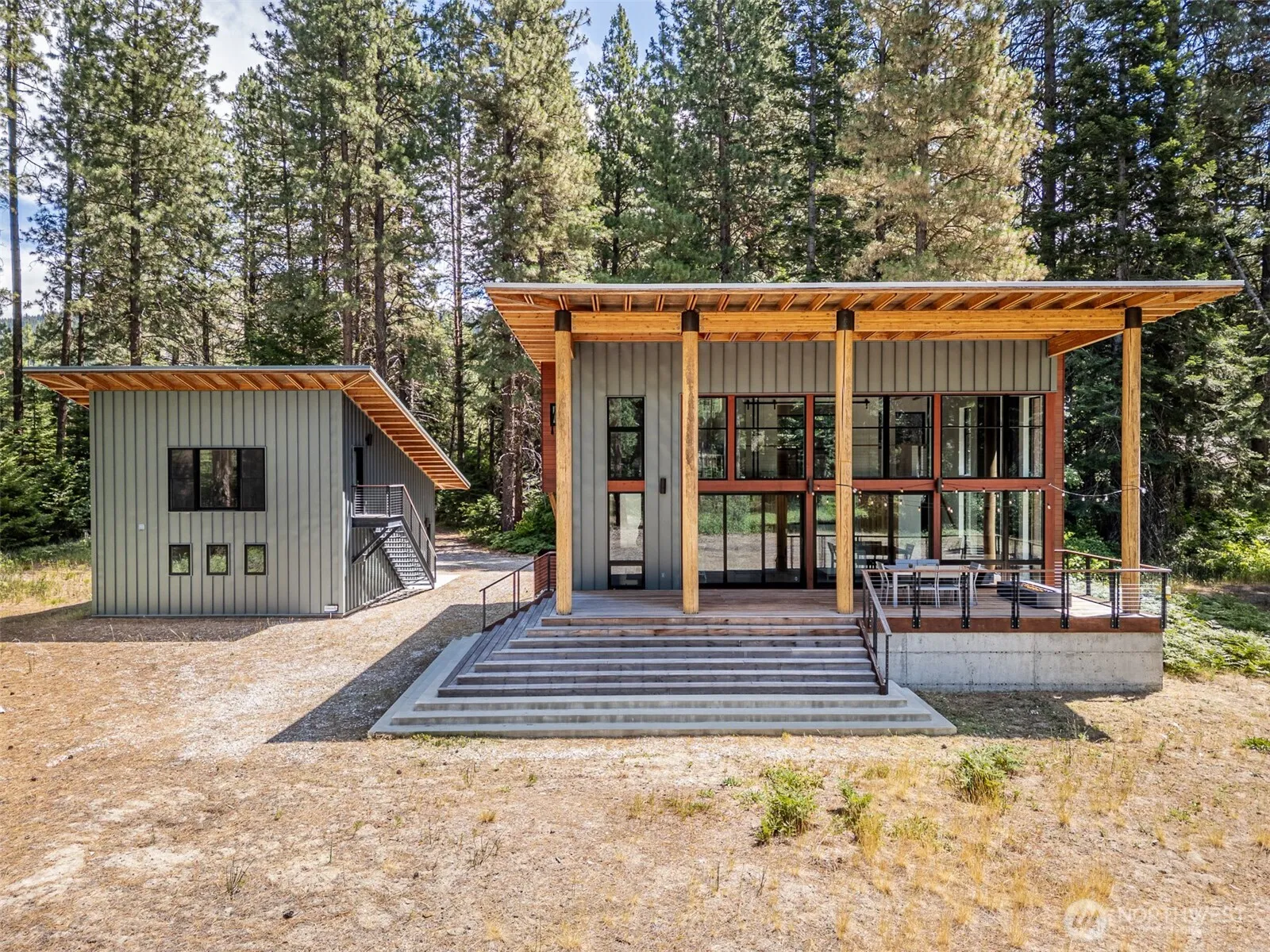 Experience this stunning Northwest Contemporary home set on a level 2.3-acre riverfront parcel with 240± feet of low-bank frontage! This 3+ bedroom, 3-bath retreat features a chef’s dream kitchen, soaring vaulted ceilings, a striking floor-to-ceiling gas fireplace, radiant heated concrete floors on the first level, all bathrooms with heated tile, a dramatic wall of windows looking out at the beautiful river, and a spacious wood deck for entertaining. The oversized garage is heated, includes a 3/4 bath, and has a finished living studio upstairs. Located very close to Plain Hardware, the Plain Valley Nordic trails, and Lake Wenatchee. Leavenworth is 25 minutes away – close enough to enjoy when you want, yet worlds apart in terms of privacy!