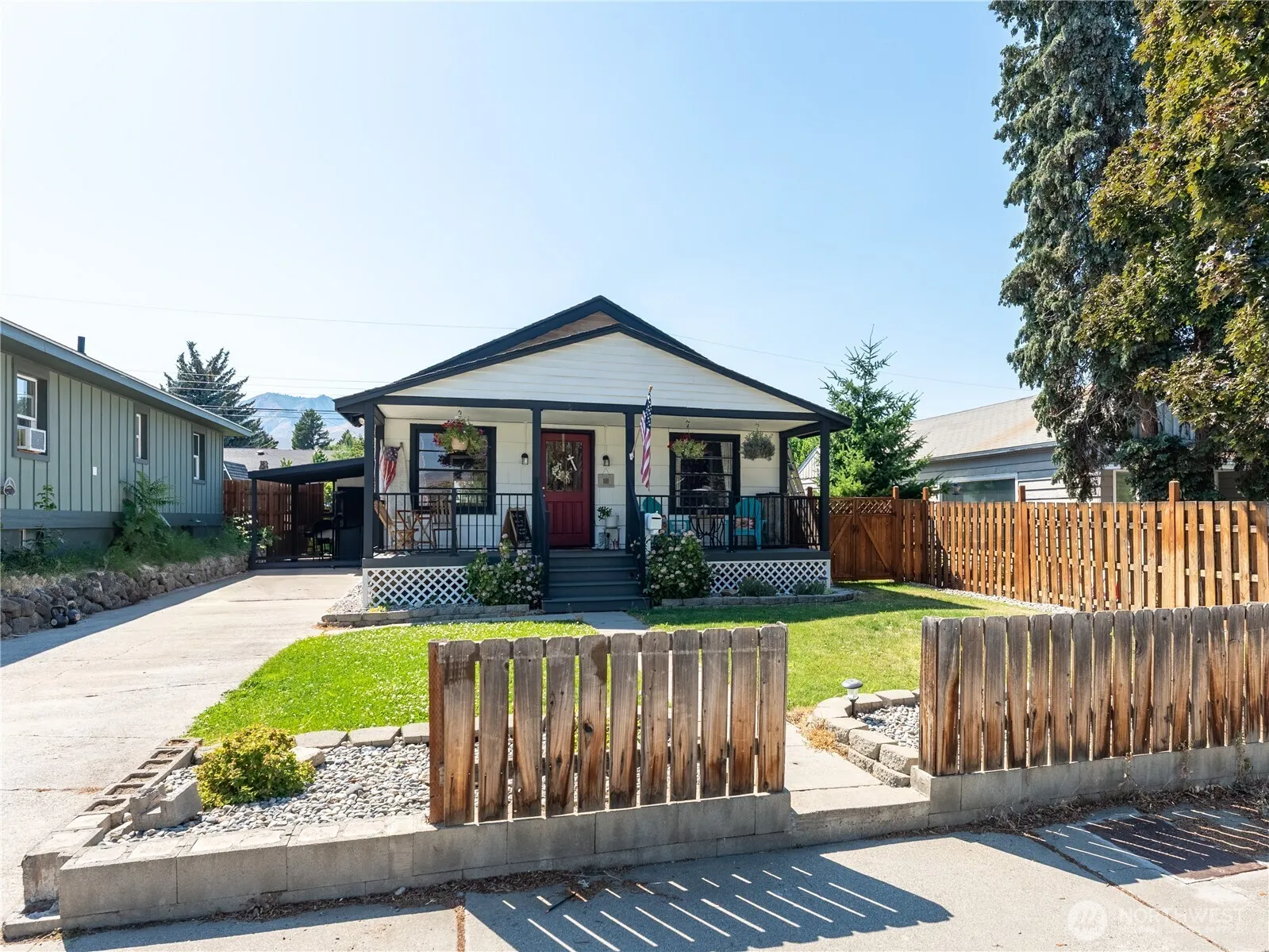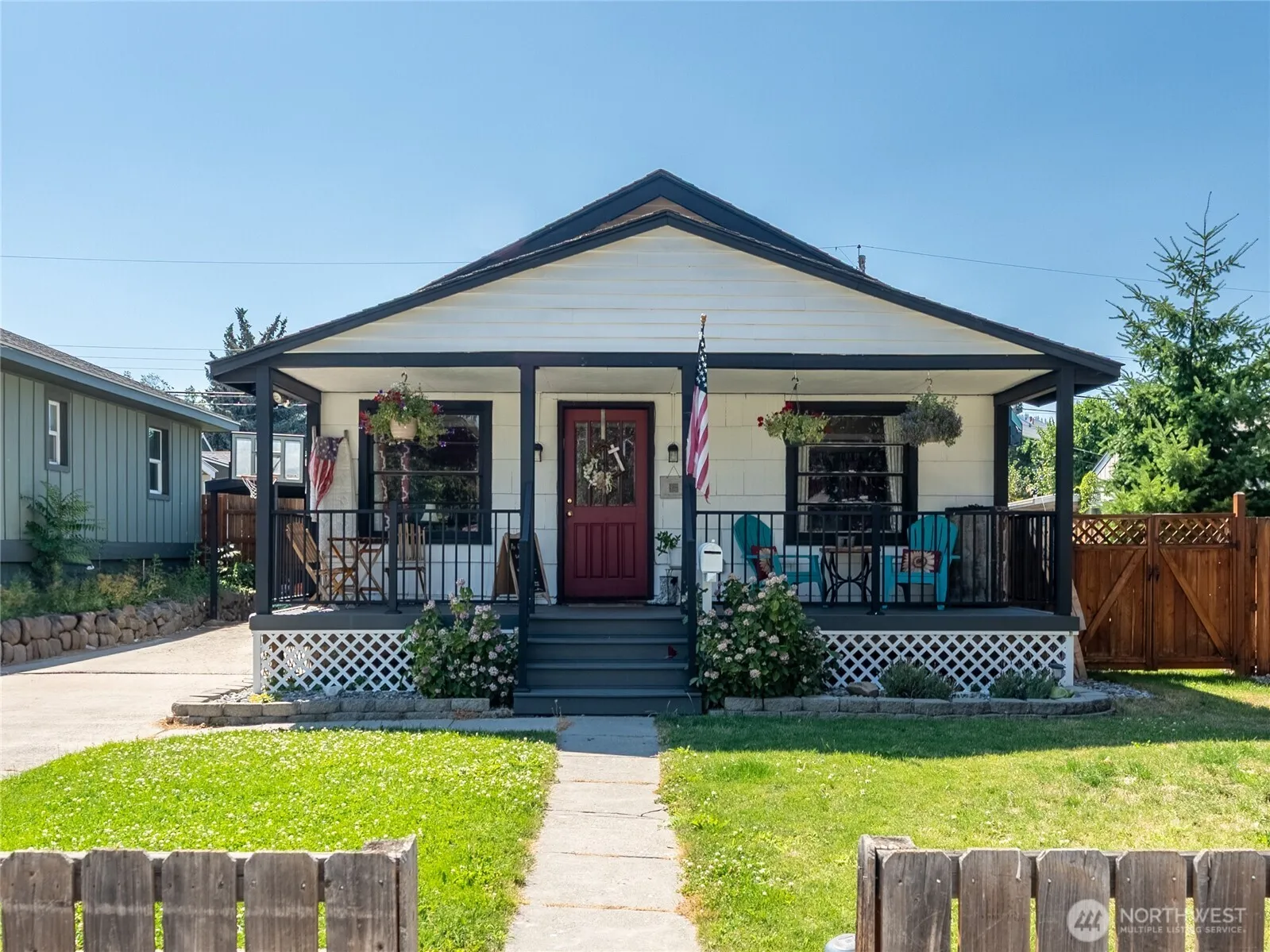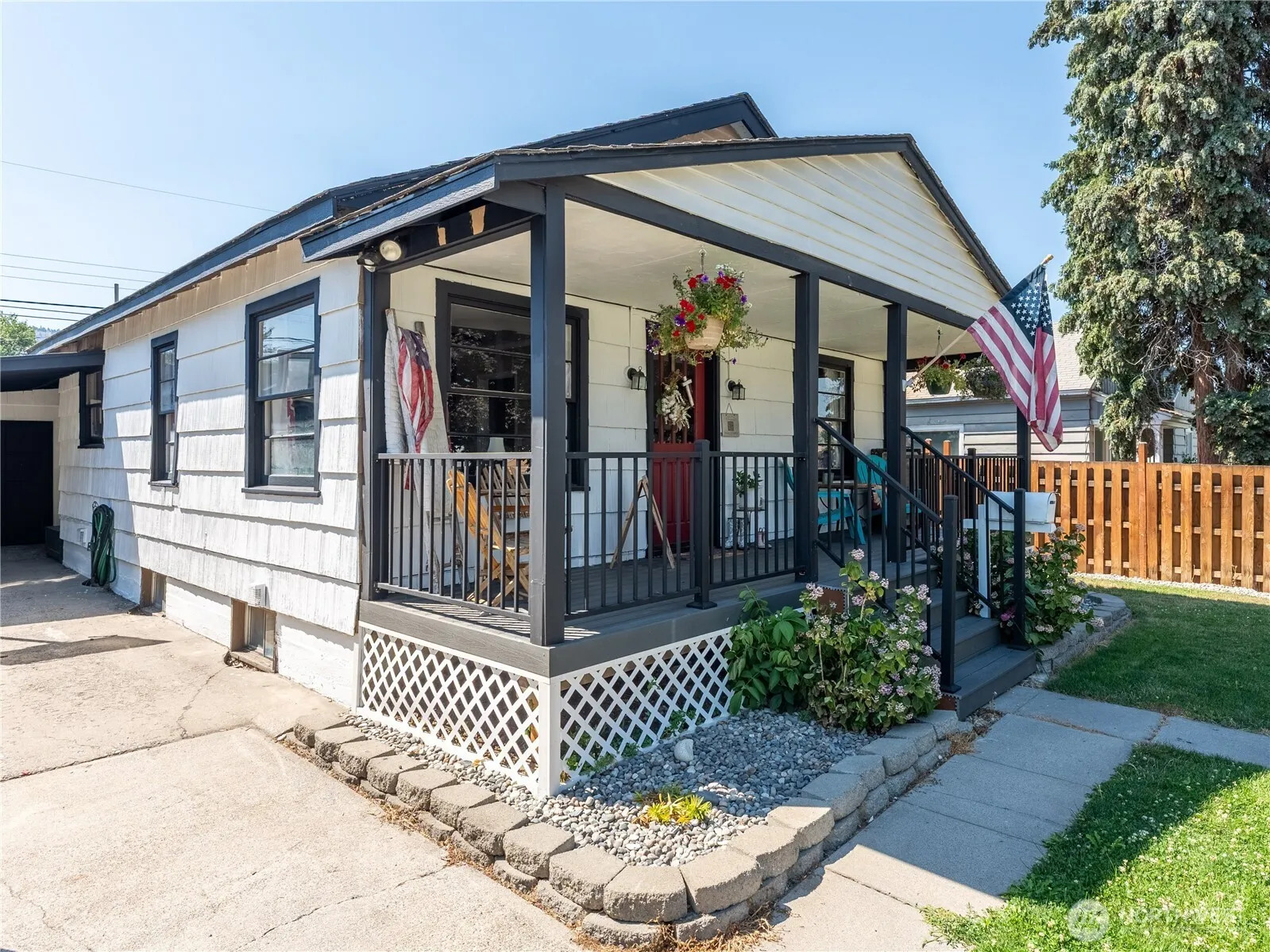 This home welcomes you with a new covered front porch and the feel of “Americana”! Enter to a living room with hardwood floors which extend to the hallway and 2 main floor bedrooms. A full bath showcases a tiled shower and tile floors. The kitchen offers newer appliances and a dining room area with an abundance of light! Downstairs you will find concrete flooring in family room and primary suite (needs window) and a brand new bathroom showcasing a new tiled shower, vanity and toilet. Outside has a large fenced rear yard with in-ground sprinklers and a detached single car garage. Wonderful location close to parks, schools and shopping!
