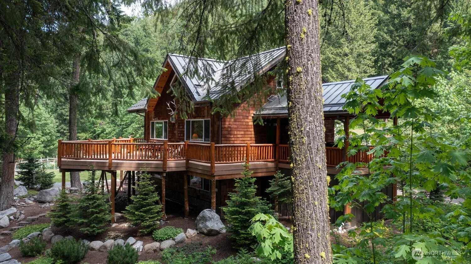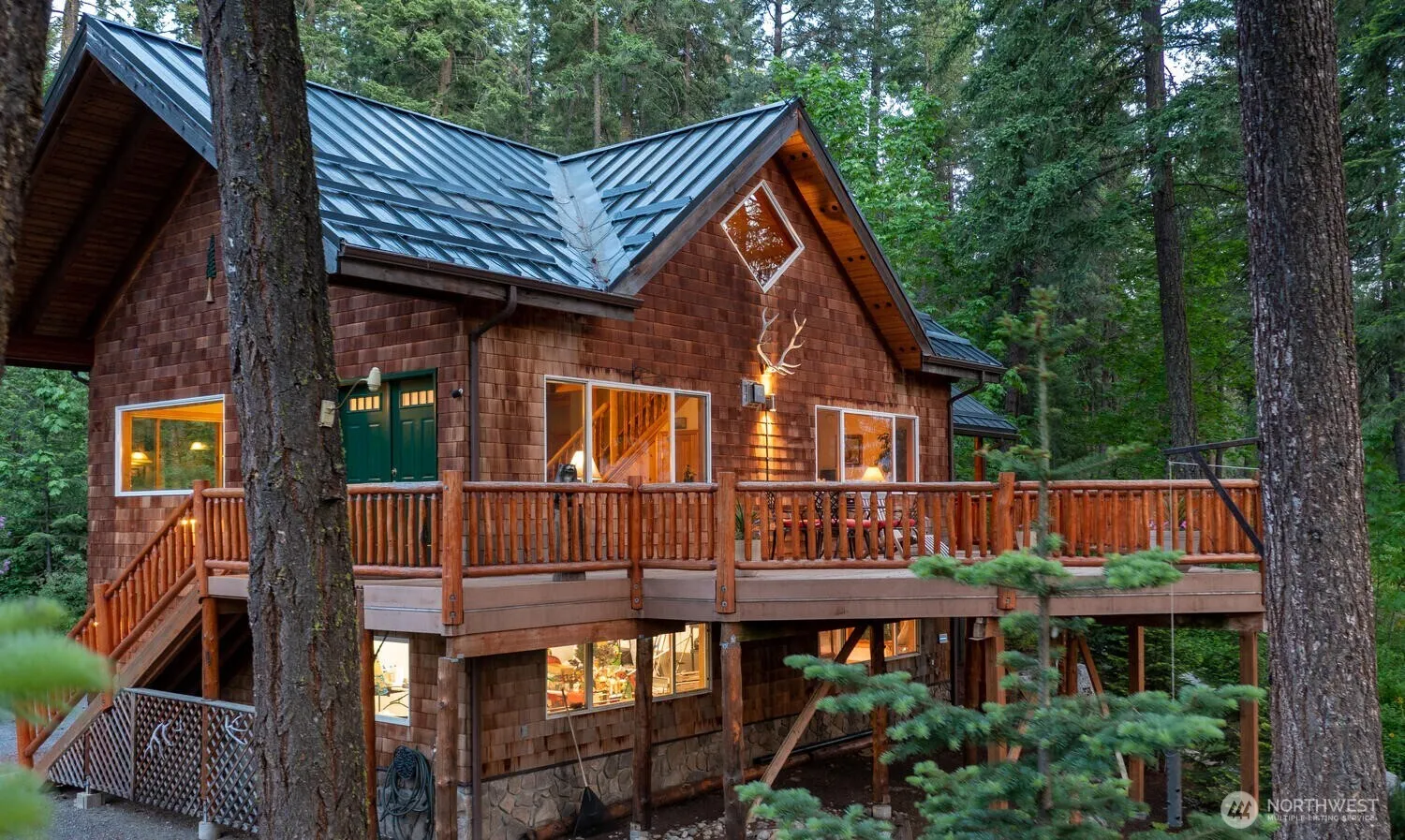 Antler Hideaway, a retreat off Mountain Home Road on 10.5 acres providing a serene & private haven, Rustic charm, cedar shingle exterior, log railings, slate floors on a 2 level Timberframe-style cabin above a 2 car garage. 2 bedrooms & a well-appointed 3/4 bath with laundry & full kitchen. The open & airy design has timber frame accents & vaulted ceiling. The primary bedroom has a private balcony that leads to a secluded hot tub, offering a place to unwind. The large balcony, provides an expansive outdoor living space for gatherings or enjoying the outdoors. Other amenities include a hen house adding a touch of rural charm & gardens for flowers or vegetables. The large meadow invites outdoor activities and wildlife.