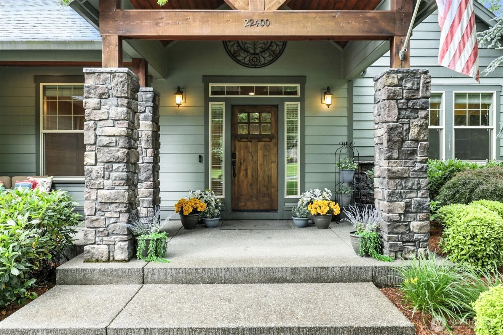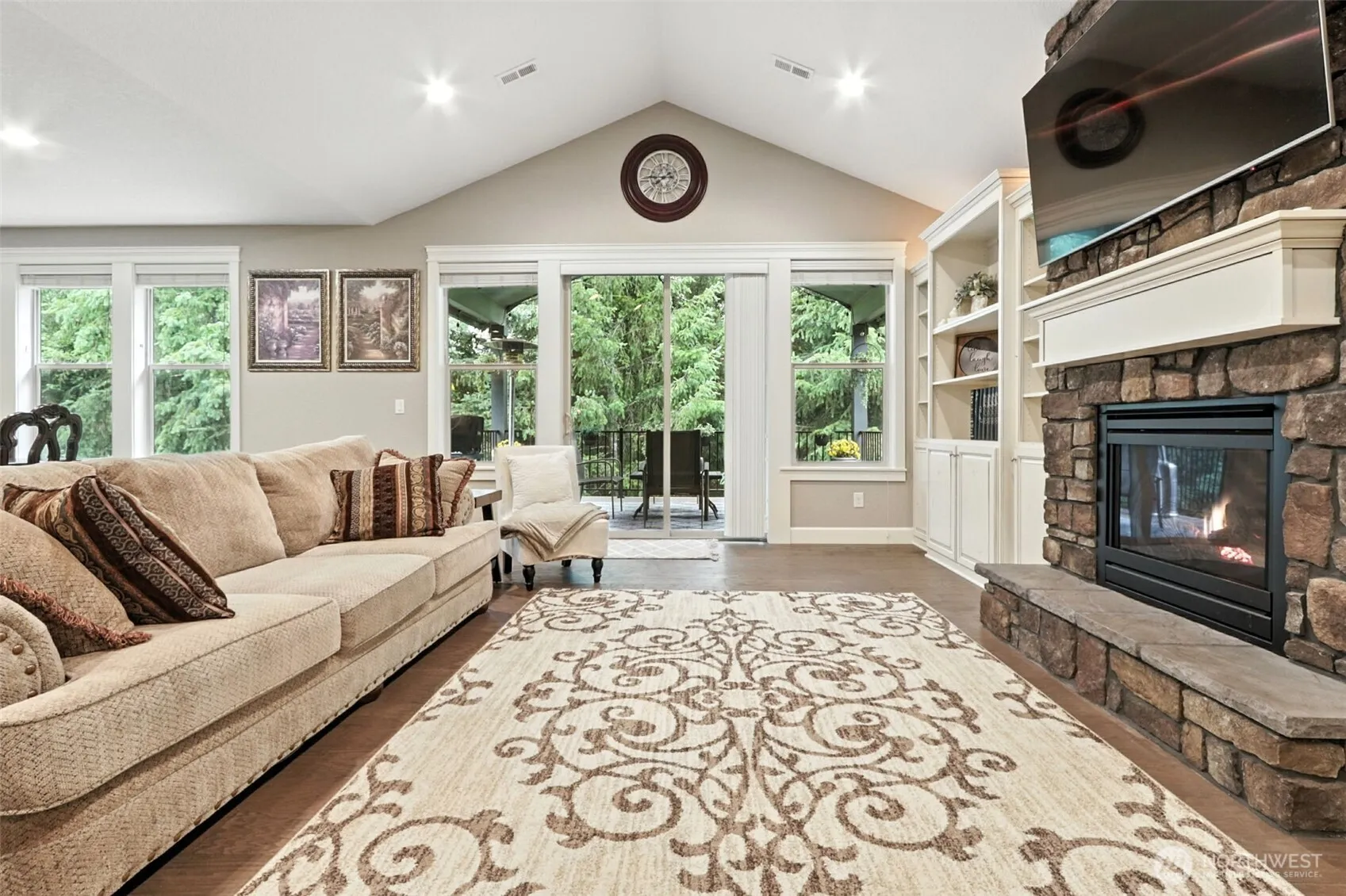 A Private retreat on a manicured acre in a gated community, surrounded by forest views and wildlife. Main-level living with open layout, spacious kitchen, and great room flowing to a large deck—ideal for indoor-outdoor entertaining. Downstairs features two bonus rooms, one with an en-suite bath—perfect for multi-gen living, hobbies, or a home gym. Enjoy a new lower deck with hot tub and sauna set against a peaceful forest backdrop. Outdoors includes a newer garden shed, landscaped grounds, and space to garden or relax. Upgrades: dual 200-amp service, generator, EV charger, smart switches, whole-house vacuum, heated primary bath floors, Murphy bed, barista bar, and Starlink/CenturyLink internet. A rare mix of luxury, privacy, and nature.