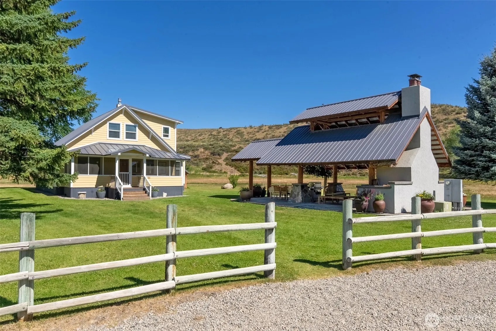 Winthrop: Classic fully remodeled and expanded Farmhouse on 21+ acres just outside downtown Winthrop. Modern comfort in this beautiful 3 bdrm, 2 BA, home, featuring a spacious kitchen, perfect for gatherings, and a cozy screened front porch and cabana ideal for relaxing summer evenings. The barn has been remodeled to include an office, art studio, and media room—providing space for work, creativity, and social events. A charming bunkhouse sits adjacent to corrals and a fully fenced pasture, offering an ideal setup for guests. Multiple outbuildings and detached garage provide ample storage for gear, tools, and recreational toys. Live your Methow dream in this one of kind property.