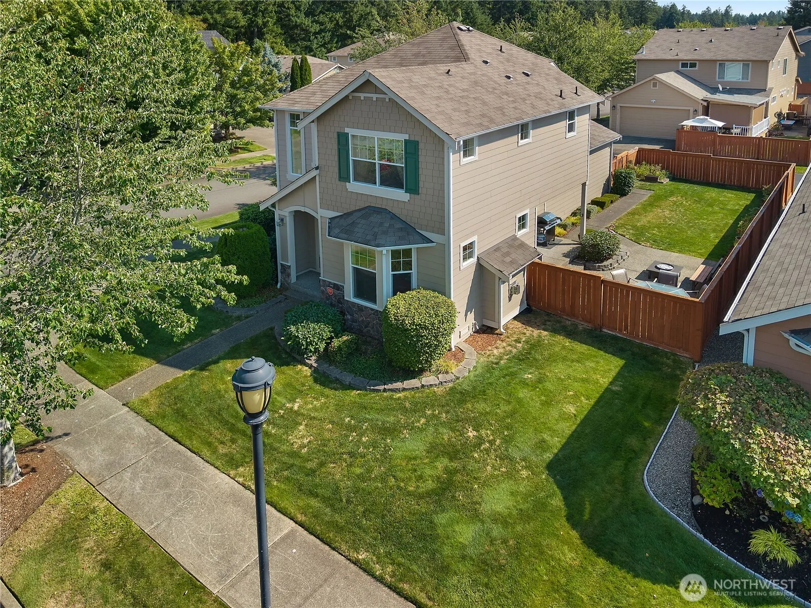 This CORNER LOT home with NEW furnace (9/9/2025) offers a spacious Great Room w/a gas fireplace & a bay window that fills the space w/natural light. The entry, kitchen, & dining areas feature beautiful hardwood floors. The open kitchen includes a pantry & a new dishwasher installed in July. Upstairs, the large primary bedroom showcases vaulted ceilings & a walk-in closet. The primary bathroom includes an upgraded in 2024 walk-in shower & double vanity. Two additional bedrooms, laundry, & a full bathroom complete the upper level. Step outside to enjoy the extended patio, perfect for relaxing/entertaining, w/plenty of yard & garden space. Conveniently situated near trails, parks,& I-5 for easy commuting…it’s just 20 minutes away from JBLM.