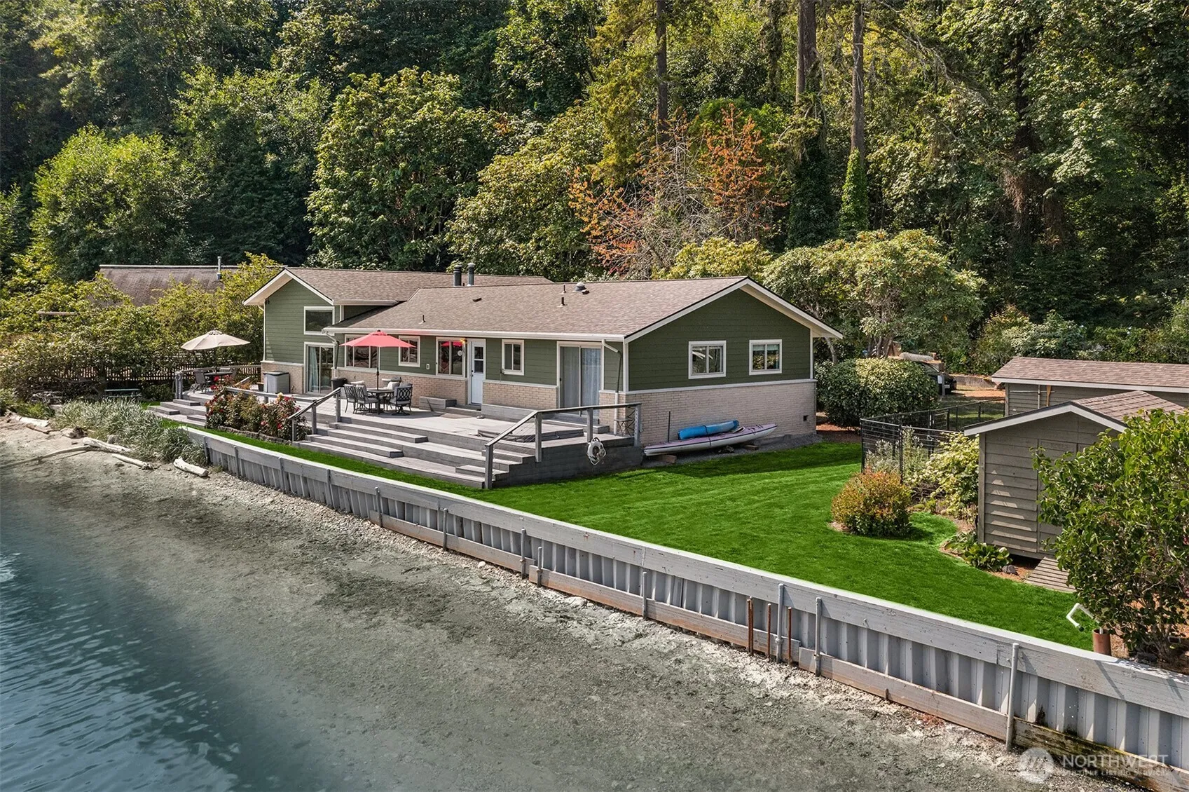 Located on Vashon’s most private and beautiful beach, this is a once-in-a-generation opportunity to own a legacy property steps from the water. Bordered by Gorsuch Creek, privacy abounds at this 1.15ac estate with beautiful mature gardens, level lawns and 164ft of frontage on a deep sandy beach. The primary home is on one level and features hardwoods, vaulted ceilings, and large windows that take in the water and Mt. Rainier views. A guest apartment with full kitchen, deck, and external access provides flexible living or income potential. Important updates such as a new roof and hardyplank siding offer peace of mind. 1500 square feet of trex decking and a built-in hot-tub are the perfect places to take in the serenity of this special place.