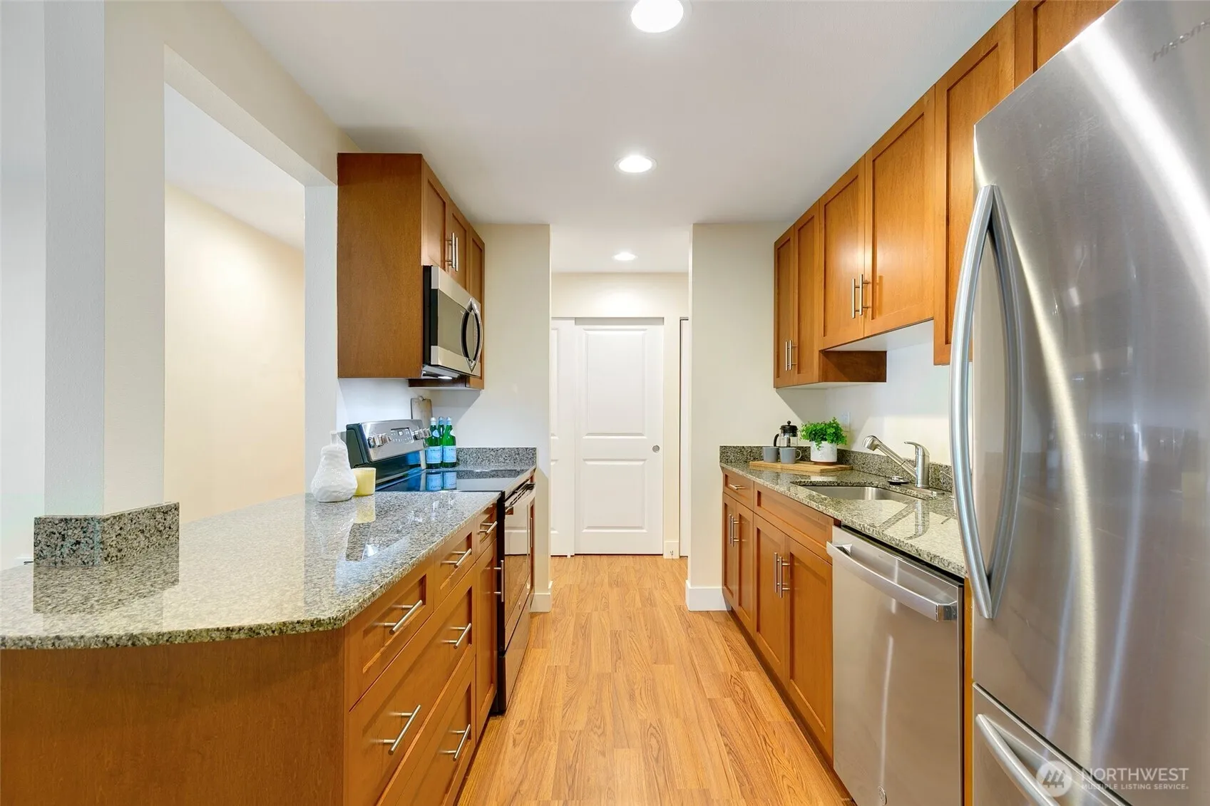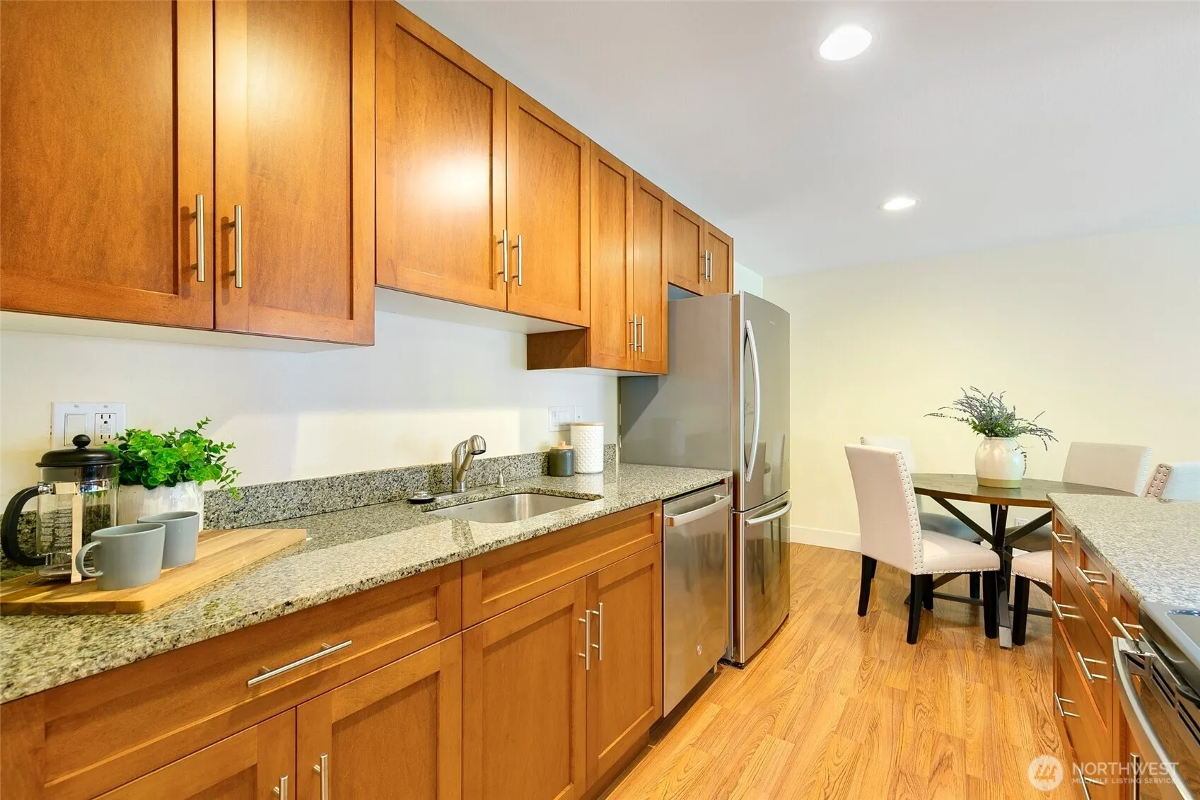 Desirable ground floor unit at the beautiful Axis Community. Well-maintained & funded condos w secure gated entry & lobby. Beautiful & well maintained grounds w large courtyard, pool & clubhouse for summer fun. This 1 bed unit is open w spacious living room w fireplace & slider to private fenced patio, overlooking Axis yard for add’l community use. Kitchen has granite counters & SS appliances, & ample dining space next to it. Large bedroom & walk-in-closet! In-unit full size laundry stays! Private storage locker! Close to Light Rail, I5, parks, restaurants & shopping. Pets allowed! FHA & VA Approved. Pre-inspected! Resale Certificate Available! *Mortgage savings may be available for buyers of this listing*