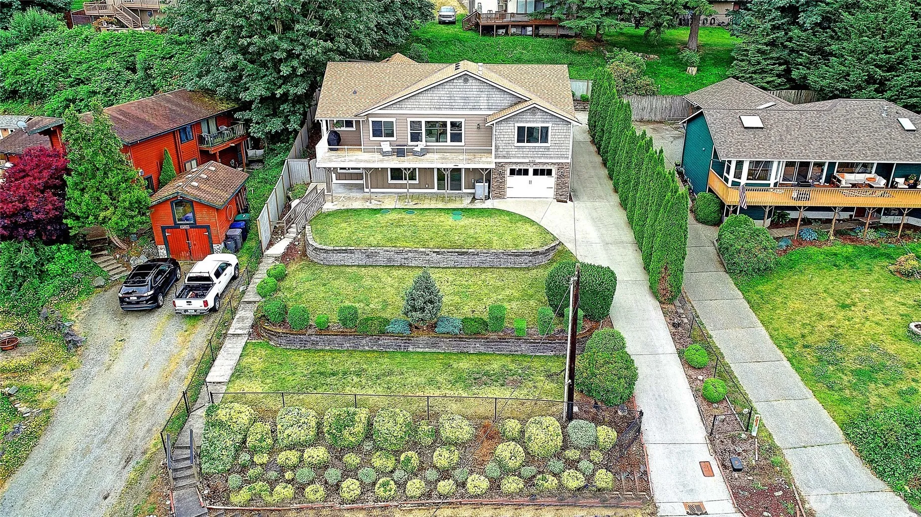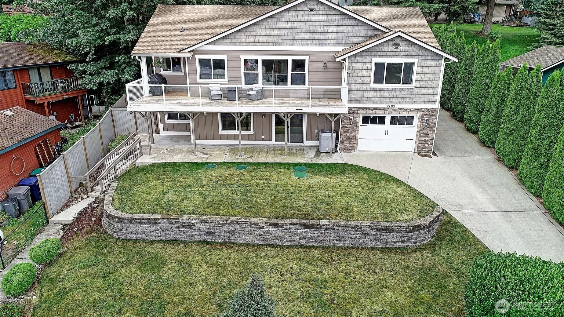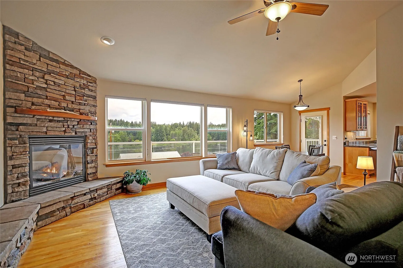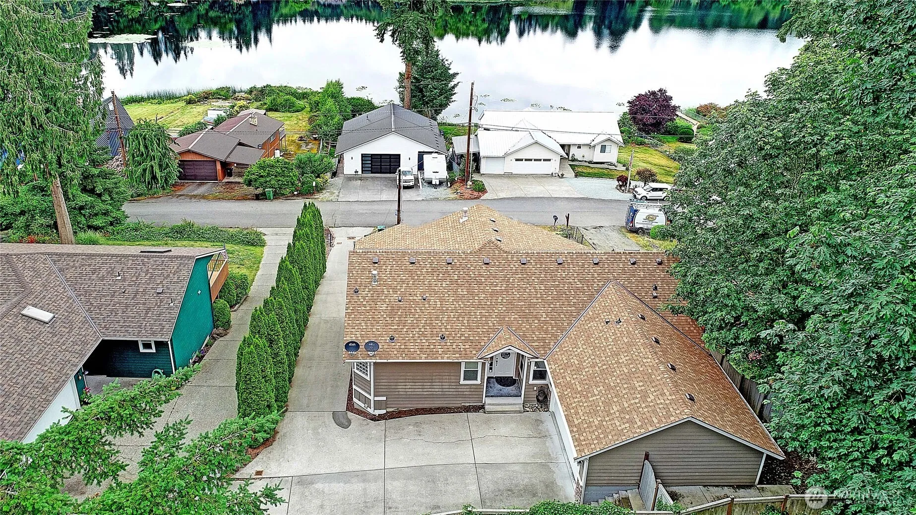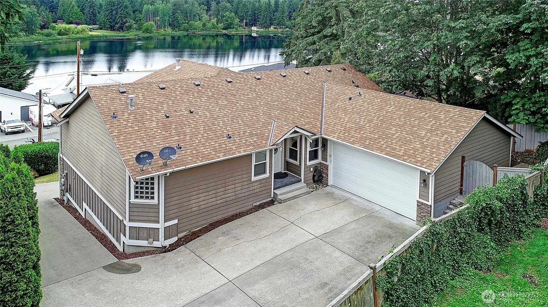 LOCATION, LOCATION! Enjoy stunning lake views yet have quick access to I-5 from this 3-bed, 2.5-bath 2809 sq/ft daylight rambler with huge view deck. This home has an open main level with natural light and picturesque windows that frame the water. Enjoy cooking in your large kitchen with S/S appliances. The large primary suite features a private bath, walk in closet and access to the view deck featuring serene lake views. 2 car garage at the main floor living. Additional one car garage for lower level of home. Downstairs the daylight basement includes a large rec room with slider leading to a private patio, large bonus room, 2 bedrooms and a full bath. Potential MIL. Home has heat pump with A/C and is wired for a generator. New roof 2025.