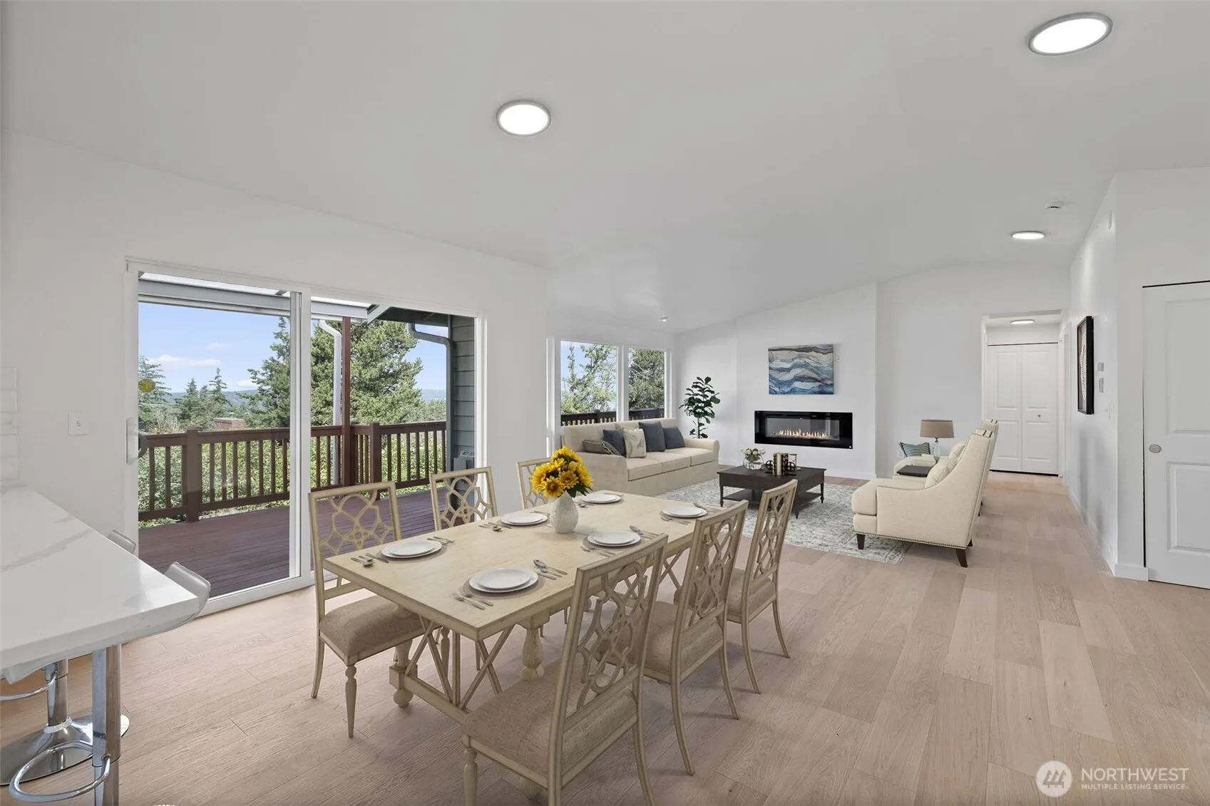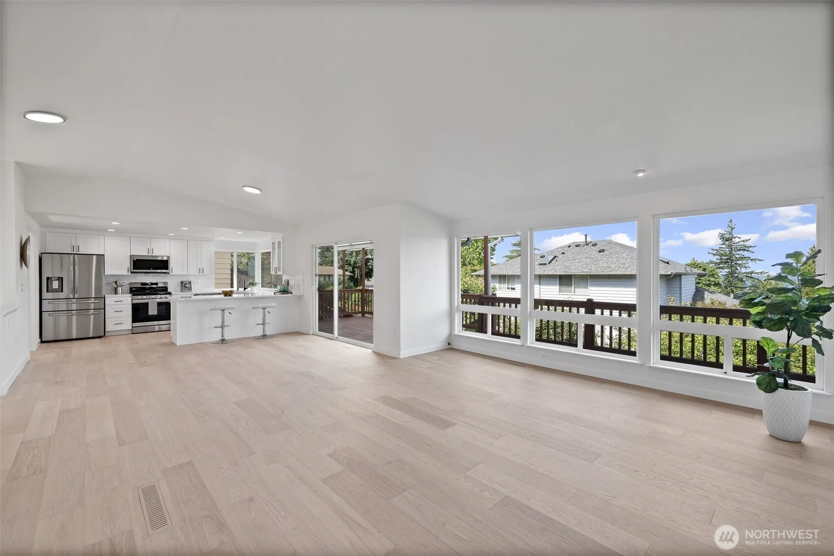 Transformational renovation in and out! Great room style accents this sun-bathed level-entry home features Sound, Olympic, Ferry, and Island views with incredible sunsets. Engineered laminate, vaulted ceilings, and fireplace highlight living and dining areas. The stunning white shaker kitchen has all new SS appliances and quartz counters. The primary bedroom has new remodeled bath with double vanity and shower. Lower level has 2 additional bedrooms/office,large family room, 3/4 bath. Updated plumbing,wiring,doors, paint and trim. Thousands in professional landscaping. Extensive rear deck.Single car garage + a detached 792 sf garage/shop.RV/Boat parking. Perfect condo alternative. Minutes away to schools, waterfront, train, & Harbour Point.