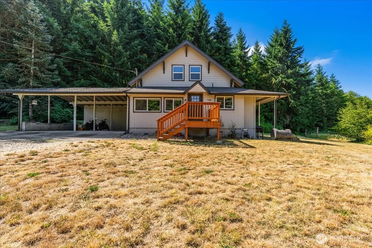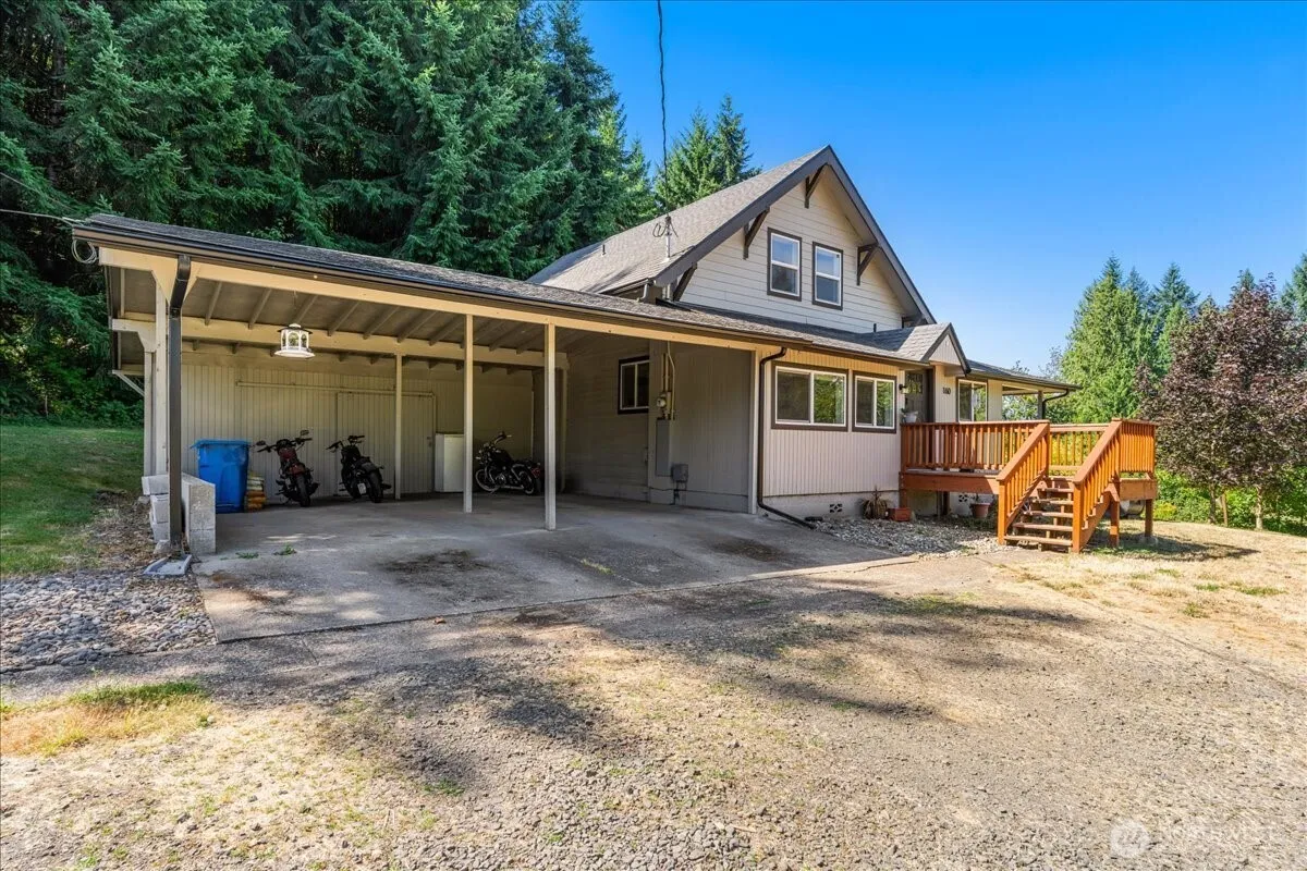 Charming 3Bed/3Bath Farmhouse on 4.45 ac in desirable Kelso! Enjoy the perfect blend of modern updates & peaceful country living. Upgrades around 2021 include kitchen cabinets, counters, island, SS appliances, subway tile backsplash, & flooring. All bathrooms are tastefully updated approx 2021. Primary bedroom on main level w/ full bath. Wonderful family room-landing area located upstairs. Utility/mudroom on main adds convenience for full one-level living. Slider opens to covered patio—perfect for morning coffee, entertaining, & watching wildlife. Property has wrap-around driveway, multiple covered parking areas, 2-car garage w/ workshop, homestead barn, stall structure, fruit trees, garden area and large pasture. Bring reasonable offer!
