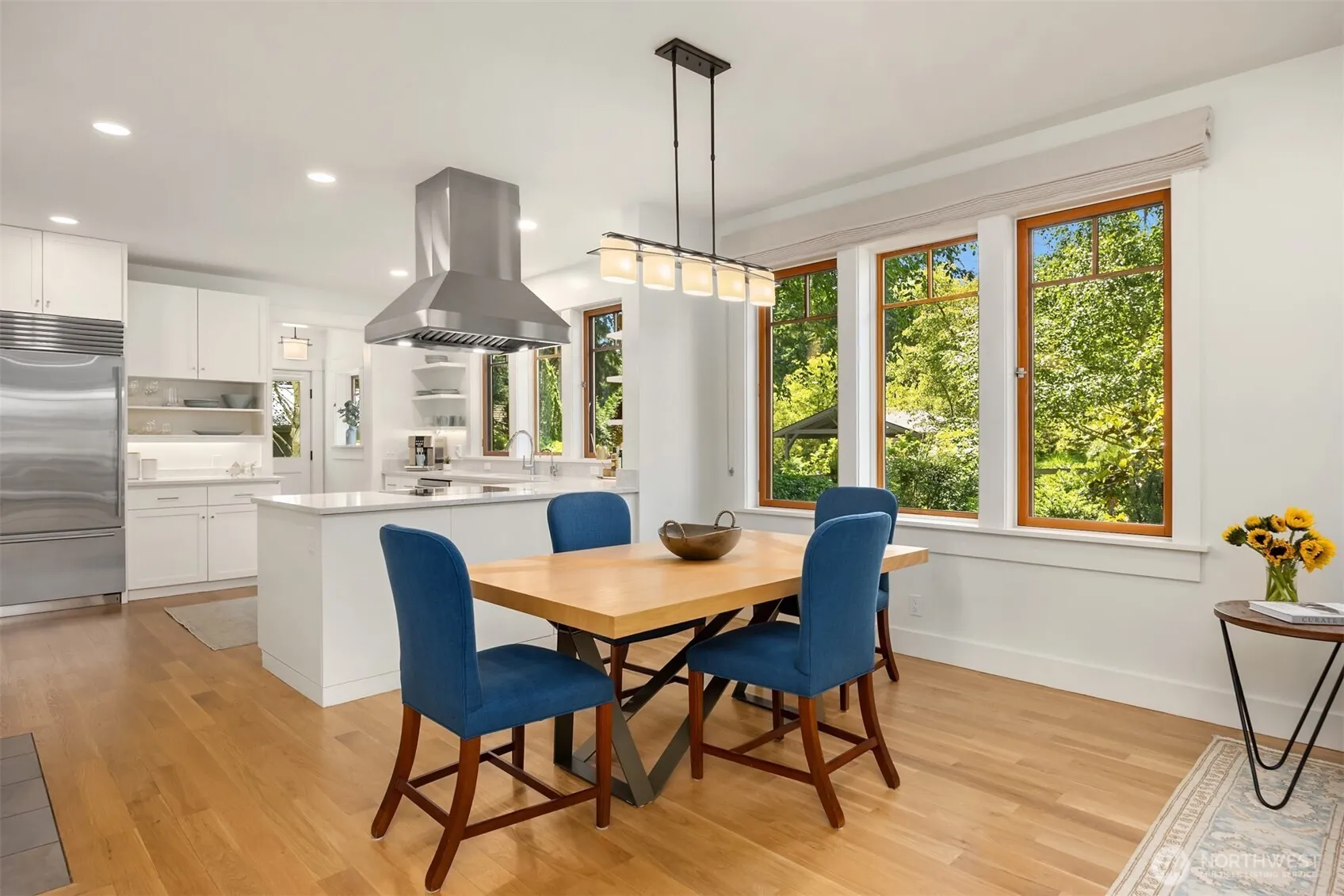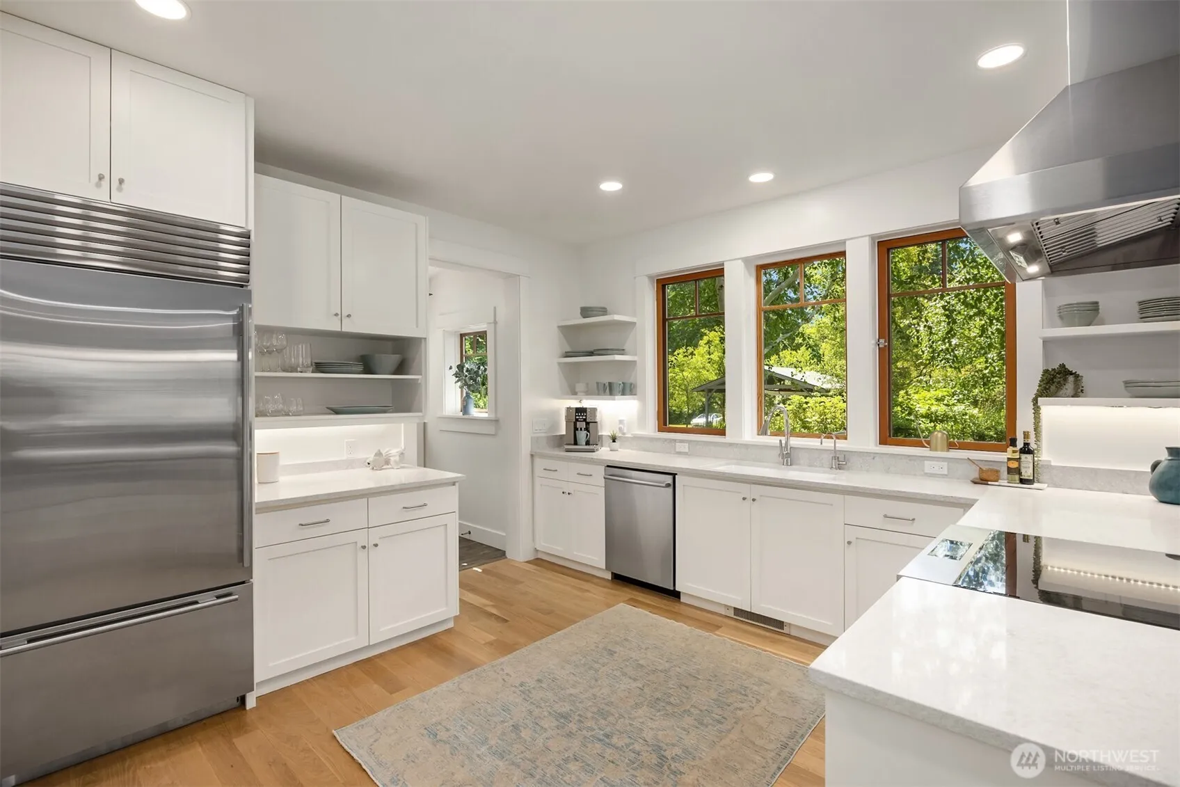 Beautifully updated, Dreamy 5-Star Green Built home set on a private, colorfully landscaped shy half-acre in Rolling Bay—just minutes to the Seattle ferry and Winslow. The main floor features tall ceilings, a newly remodeled kitchen, living and dining rooms, wood-burning stove, laundry, and two spacious bedrooms with garden views. The upper level offers vaulted ceilings, a den, and primary suite. Kitchen upgrades include quartz countertops, a Sub-Zero refrigerator, Wolf induction range, Zephyr hood, and Hubbardton Forge lighting. Bathrooms feature new countertops, sinks, and mirrors. Additional highlights include white oak floors throughout, efficient heating/cooling, a fenced yard, expansive deck, tons of storage and a new two-car garage!