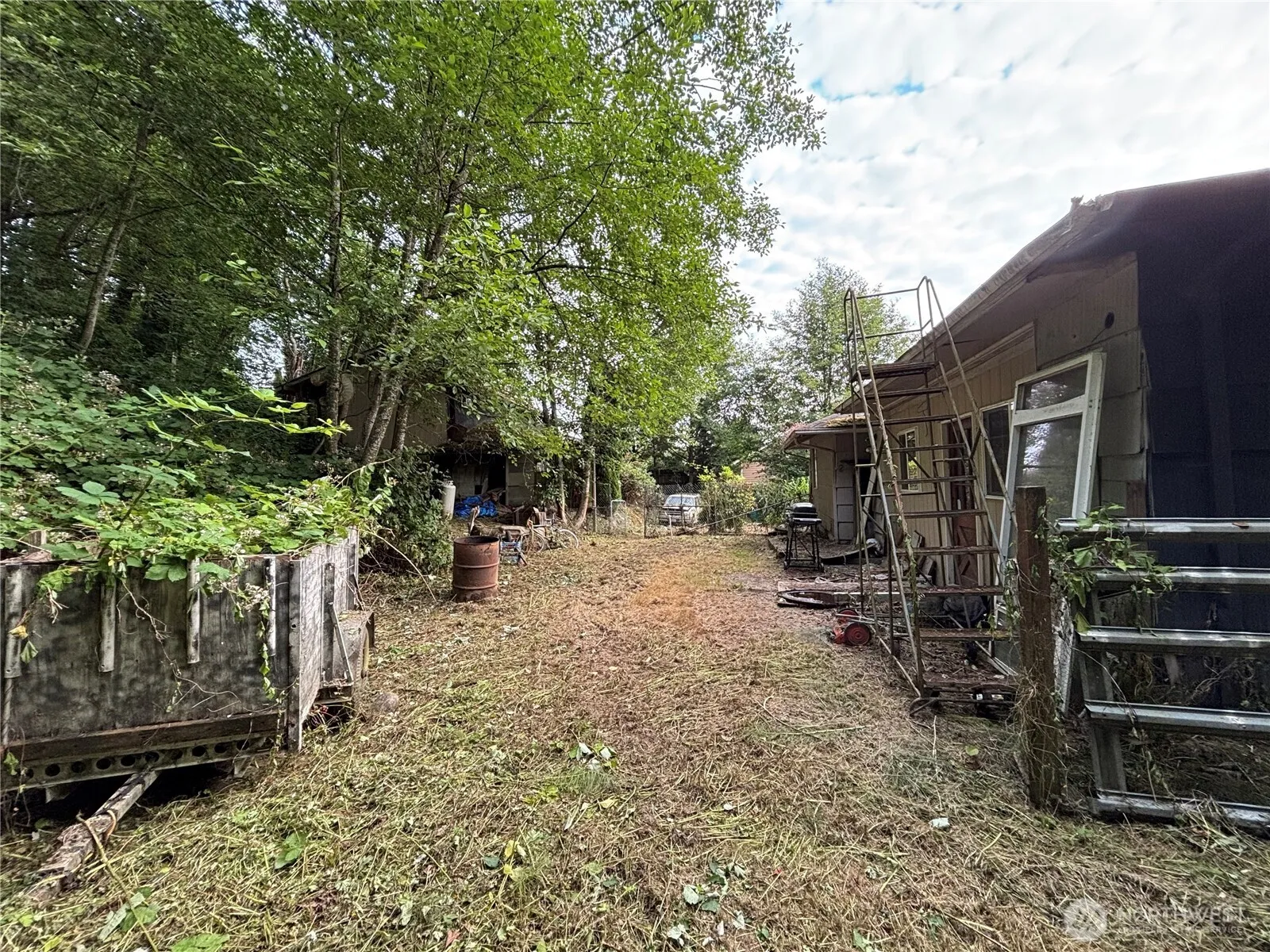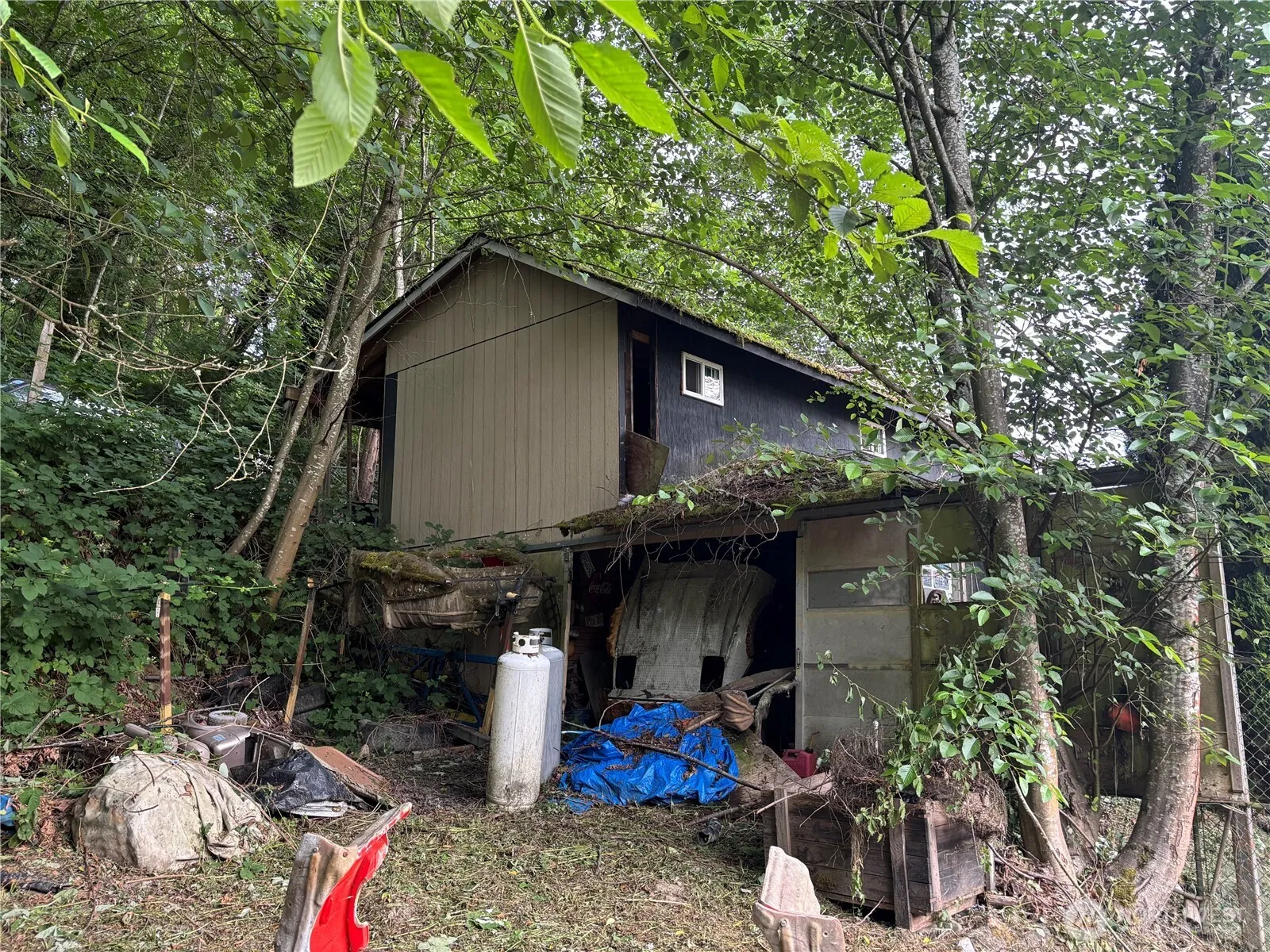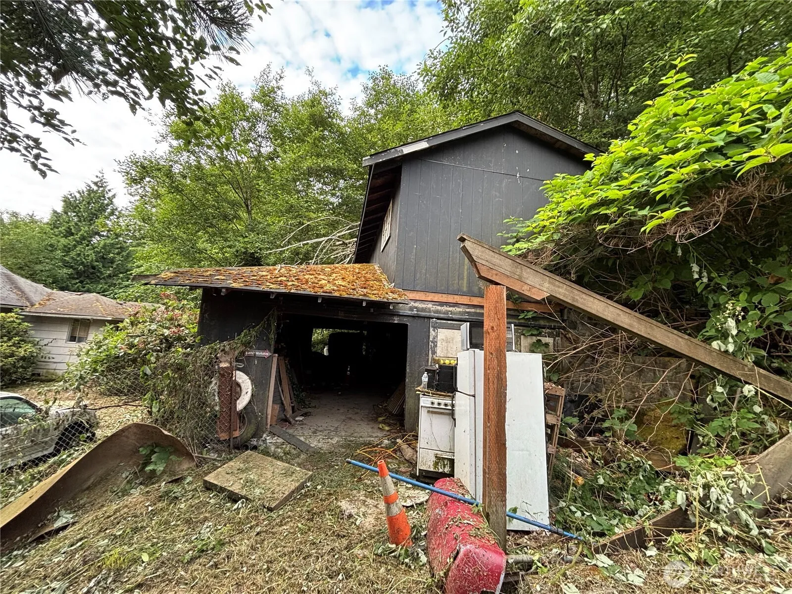 Attention Investors, Builders and Developers! Over a half an acre lot with a single level home with expansive deck and two car, two story garage seeks your creative vision. Cash only due to condition. Mature landscaping, super private lot extends up the hillside. Urban farm? Please use caution when walking the property. Guardianship sale, sold As-Is without any warranties of any kind.