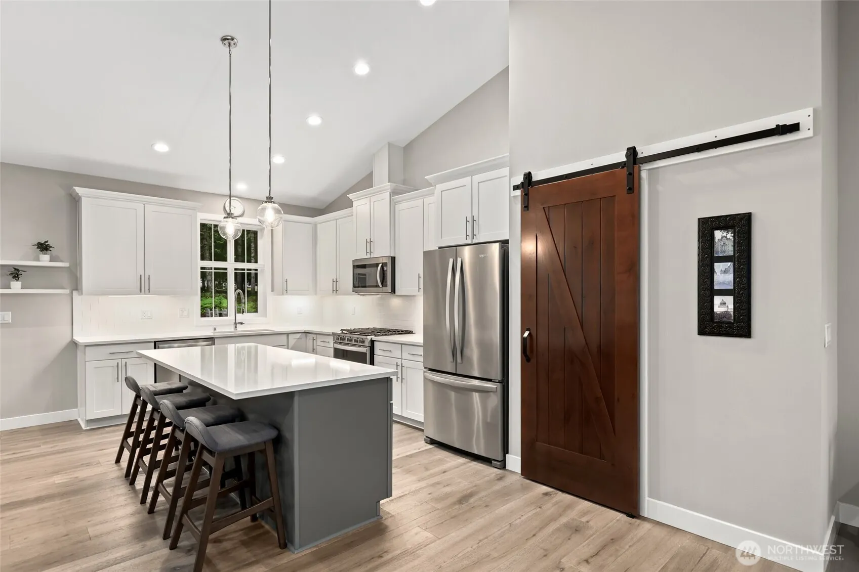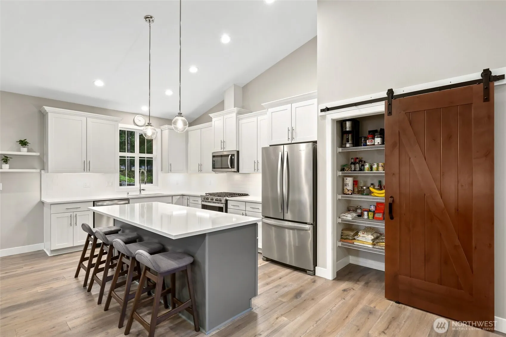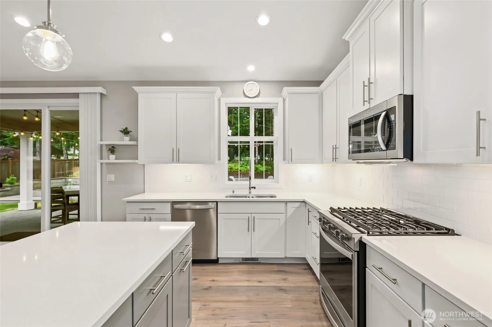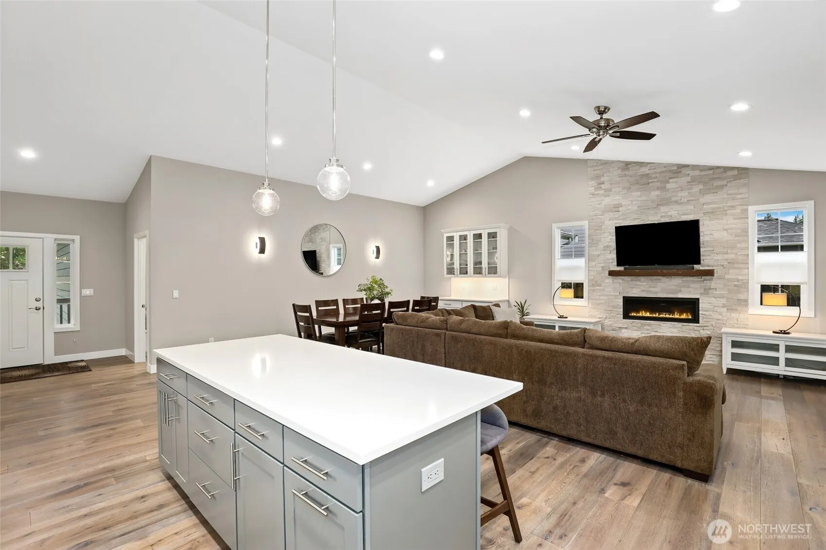 ONE LEVEL LIVING ON THE FAIRWAY! This pristine one-owner home showcases a spacious open layout w/vaulted ceilings, stunning wide-plank hardwood floors & abundant natural light. The gorgeous white kitchen features quartz counters, an oversized island, barn door pantry, & designer fixtures throughout. A sleek gas fireplace anchors the great room & dining area, w/sliders leading to a 4-season covered patio for year round outdoor enjoyment. Beautifully landscaped backyard w/fairway views offers a ground-level sun deck w/built-in garden planters & entertainment island w/fridge. The primary suite boasts a spa-like ensuite w/custom tiled shower. Generous closets throughout. A rare tandem plus two-car garage—ideal for golf cart, hobbies, or shop!