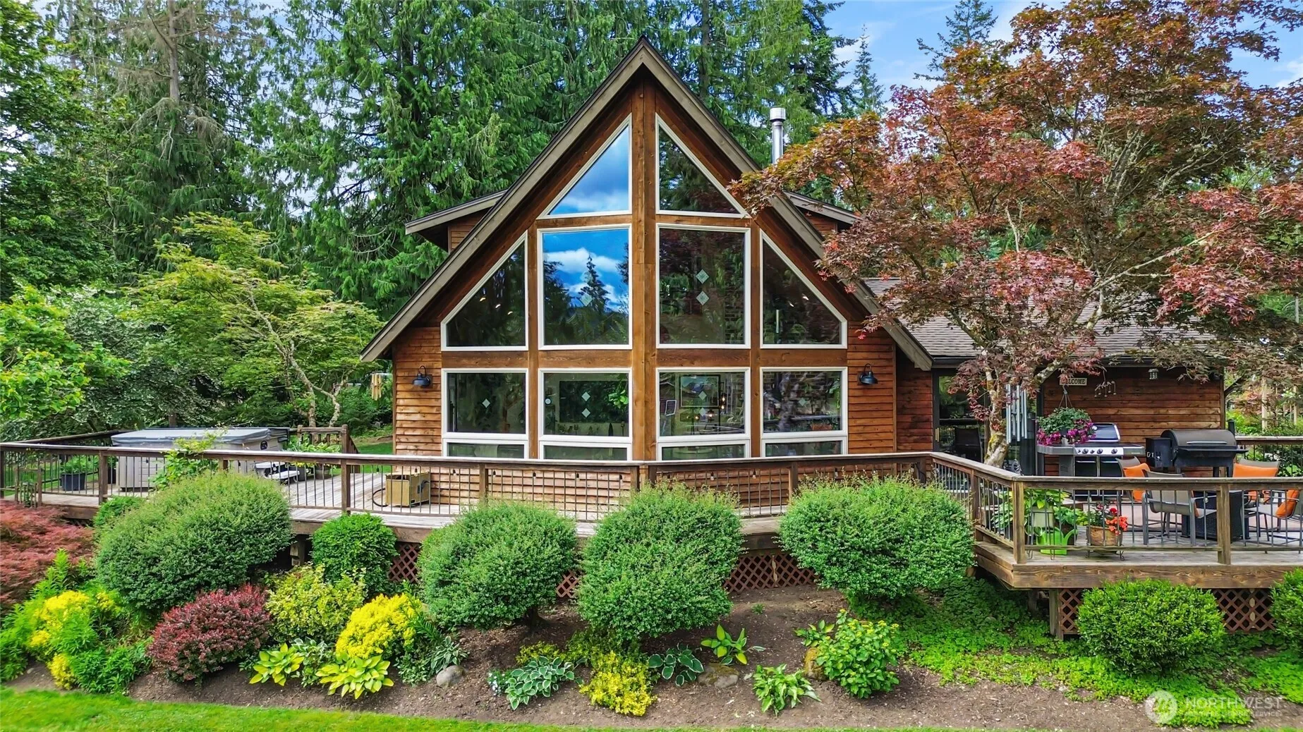 Stunning custom home on 5 acres with serene views! Tongue & groove vaulted ceilings, expansive windows, & a freestanding wood stove create an inviting atmosphere. Hand scraped engineered hardwood, new carpet & a clawfoot tub add timeless charm. Upstairs primary suite features a walk in closet, heated tile floors & a spa like shower that’s flush w/the floor. The eat in kitchen includes double ovens & a wood slab countertop. Barn door adds character to the mudroom. Enjoy the outdoors on the massive deck complete w/a hot tub. Detached heated garage w/separate rooms—perfect flex space/office. Property also features a pond, 10×14 greenhouse w/power, 40×60 fenced garden w/raised beds & a fenced rose garden. 5 year old roof completes the package.