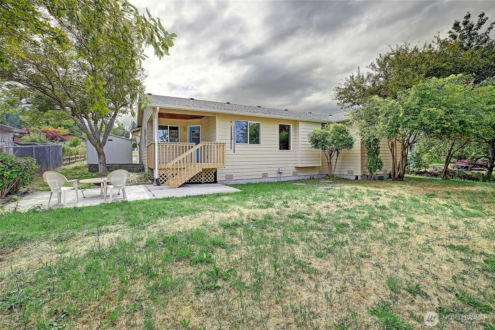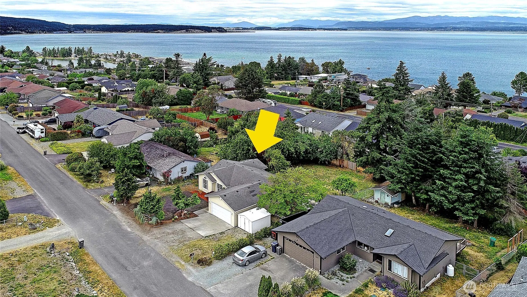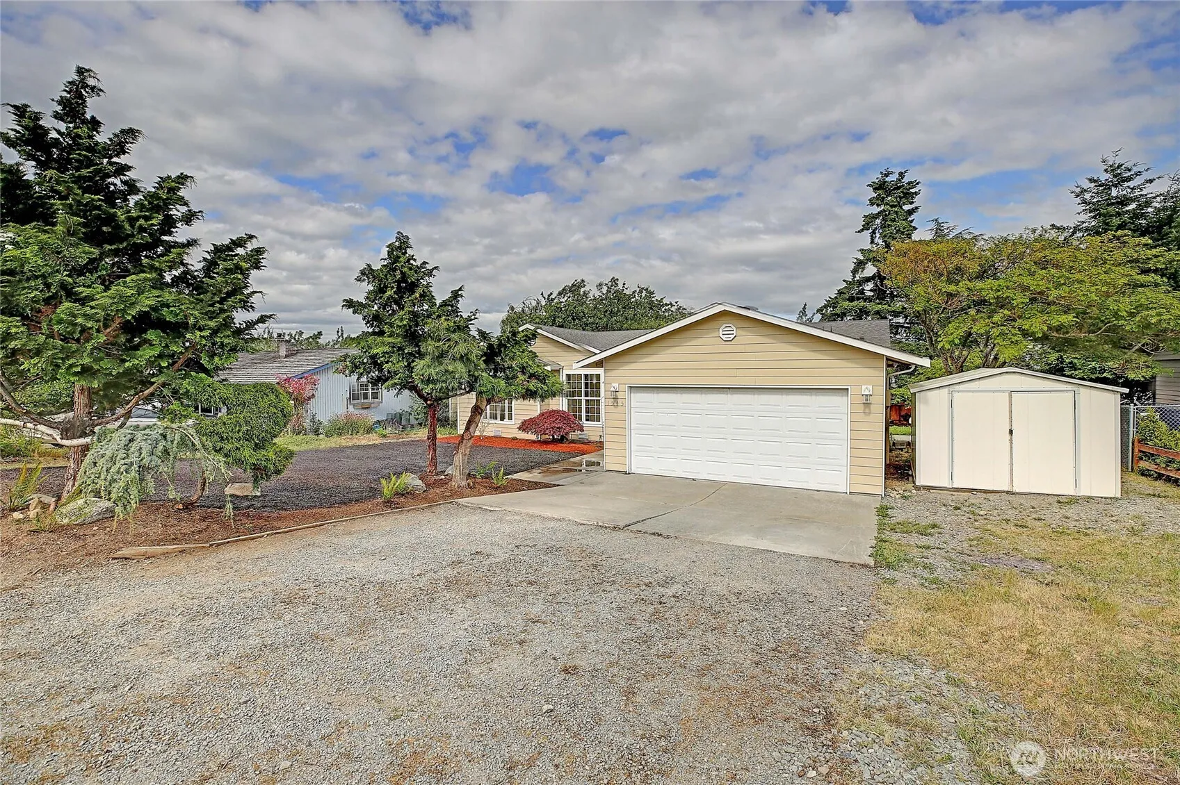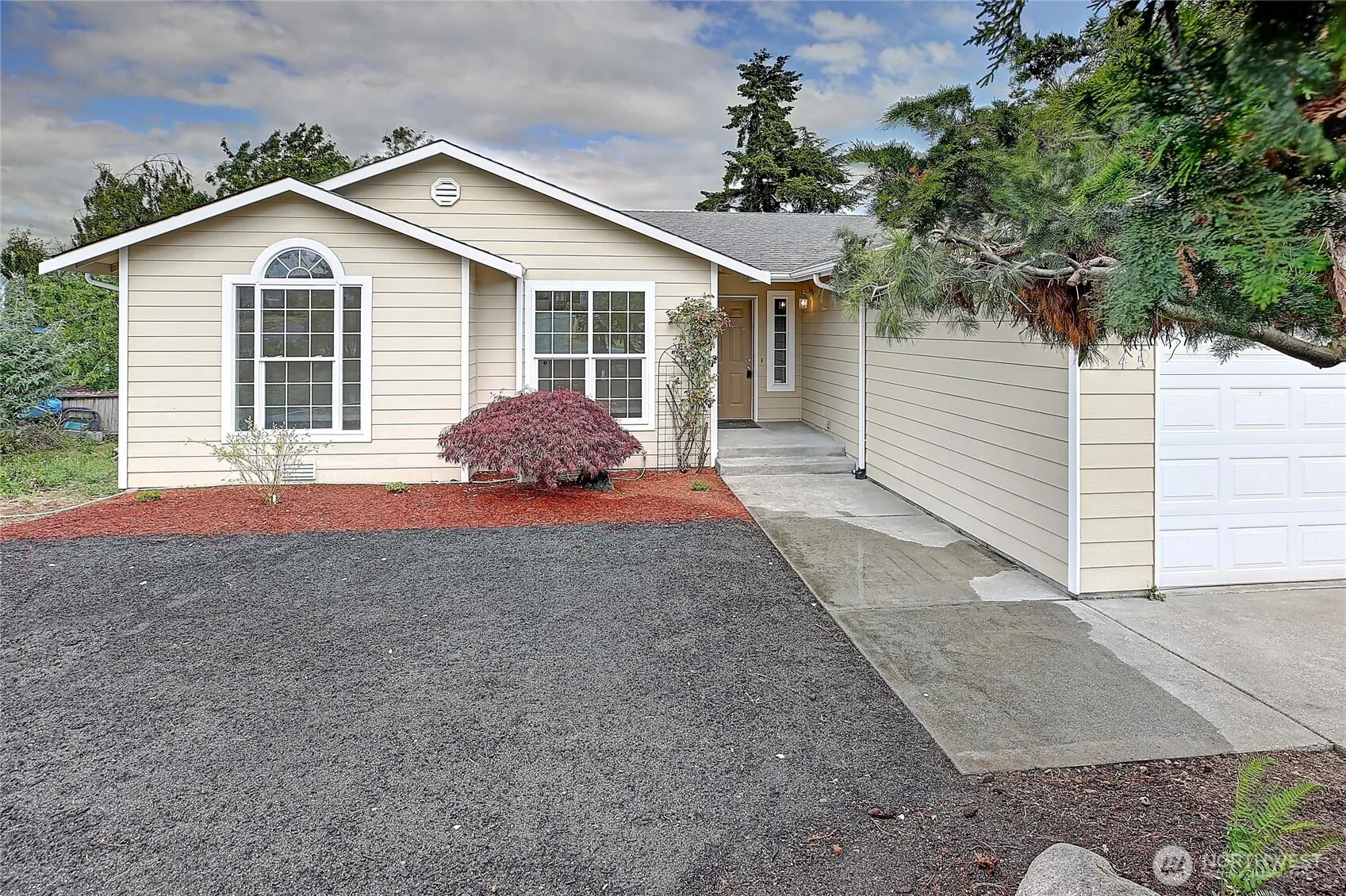 Beautifully renovated rambler in Camano Country Club! Move-in-ready 3-bed, 2-bath home featuring fresh interior paint, luxury vinyl plank flooring, updated wall heaters, and stylish new light fixtures. The kitchen shines with modern gold hardware, white quartz countertops, SS appliances, new cabinetry, and a spacious pantry. Vaulted ceilings and natural light enhance the inviting living room. Generously sized primary suite offers a full bath and walk-in closet. Step outside to a covered porch, concrete patio, and large yard. Enjoy partial views of the Sound, mountains, and surrounding mature landscape. Complete with a 2-car garage and RV parking. Ownership includes access to 3 private beaches, with optional clubhouse and pool membership.
