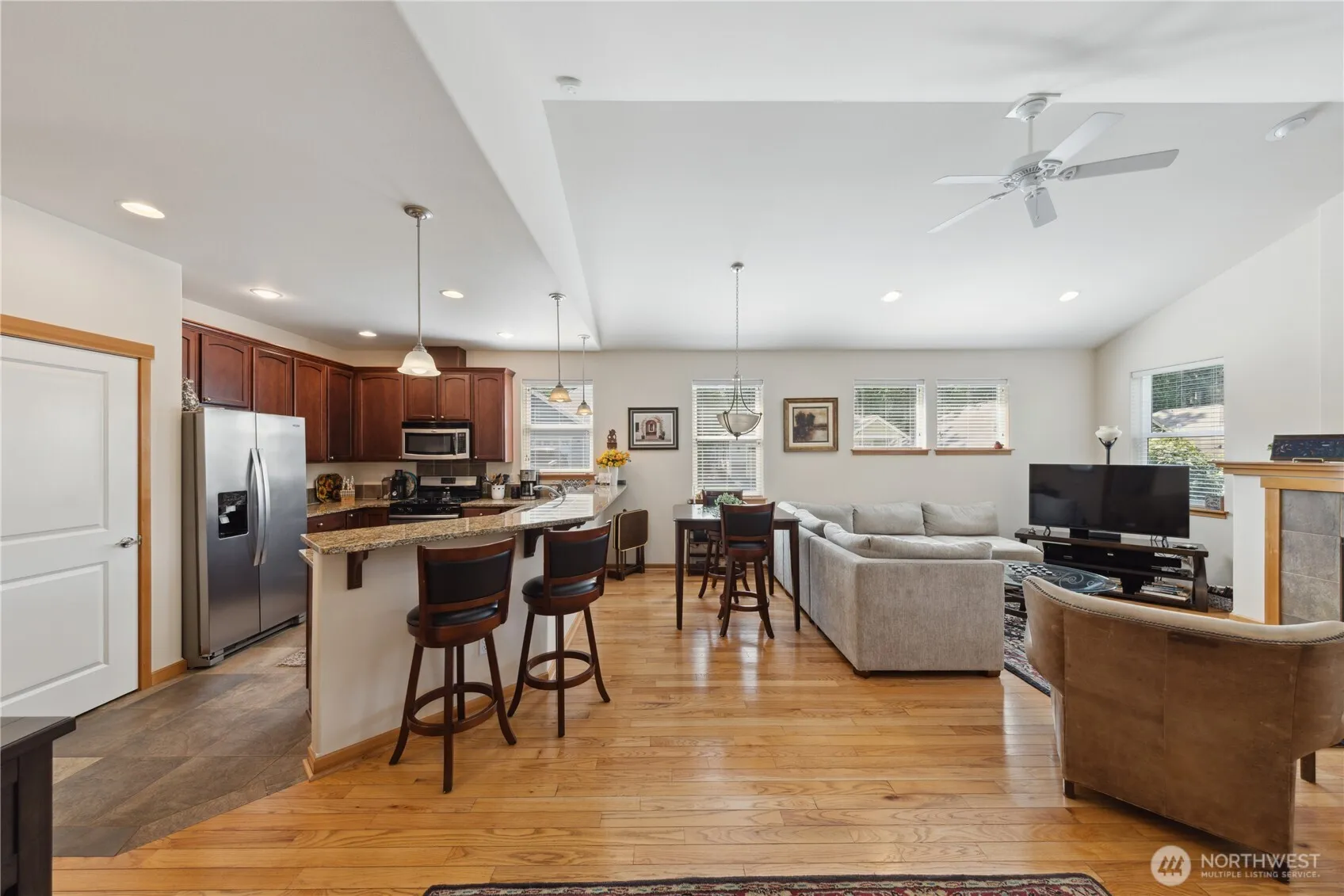 Nestled in a friendly 55+ community, this inviting home welcomes you with vaulted ceilings and a bright, open layout. Tile floors greet you in the entry and kitchen, while hardwoods warm the living and dining areas—centered around a cozy gas fireplace. Start your day at the raised kitchen bar and unwind in the spacious primary suite with walk-in closet, double vanity, and jack-and-jill access to the laundry. Bedrooms feature plush carpet, bathrooms offer easy-care vinyl, and the flexible second room works perfectly as a guest space or office. Attic stairs lead to bonus storage, and the covered patio opens to a landscaped yard ready for gardening, relaxing, or gathering. Comfort, ease, and community await.