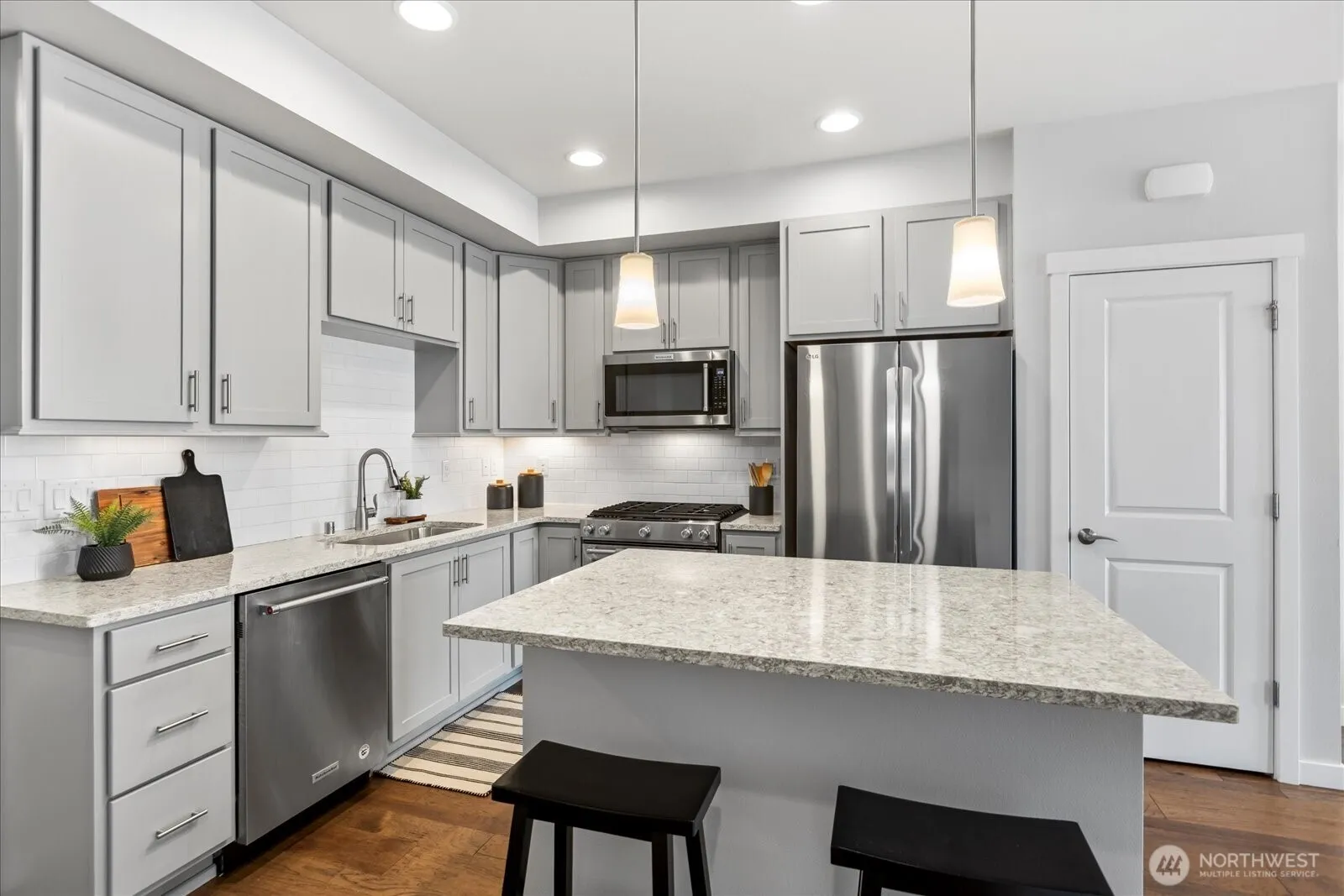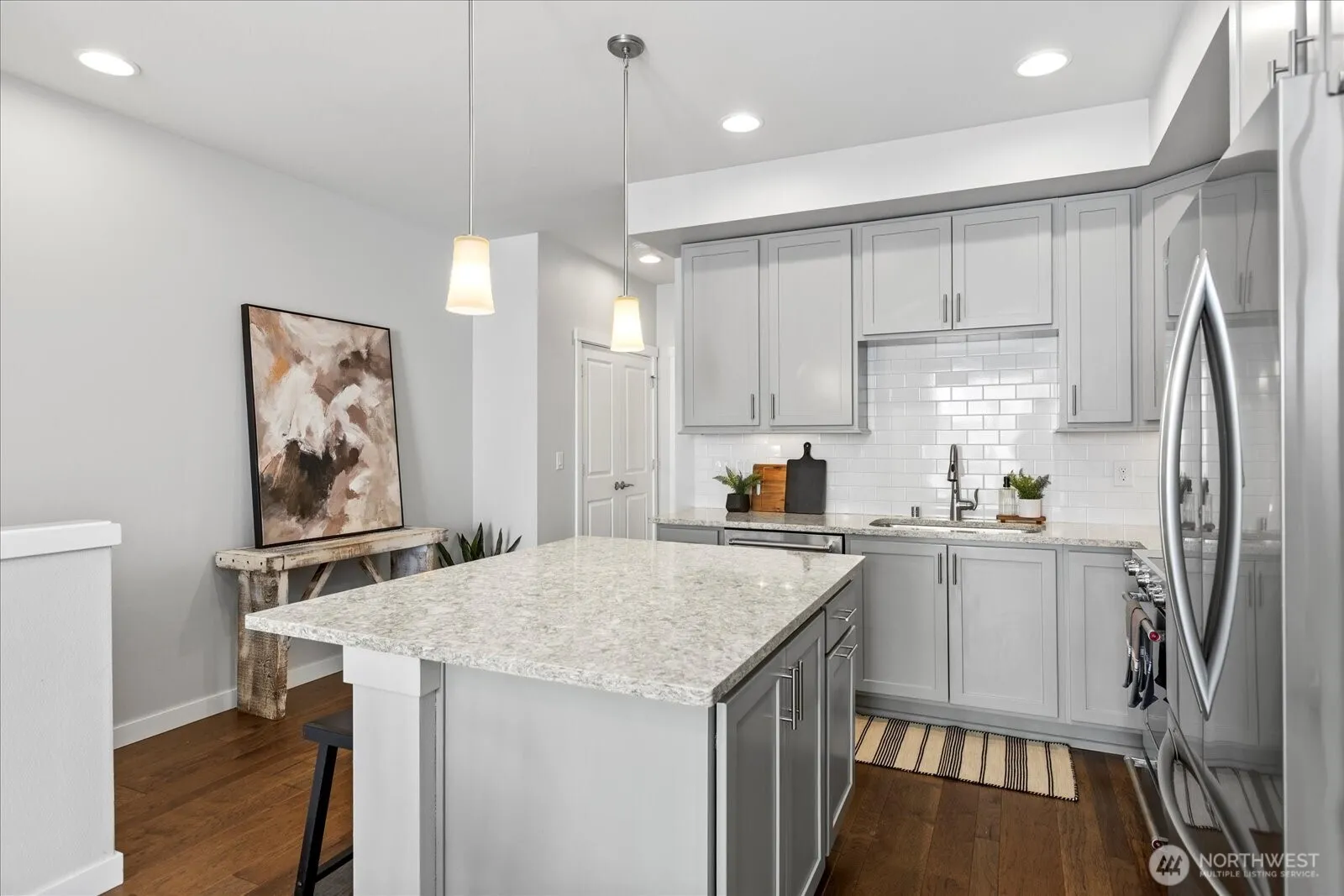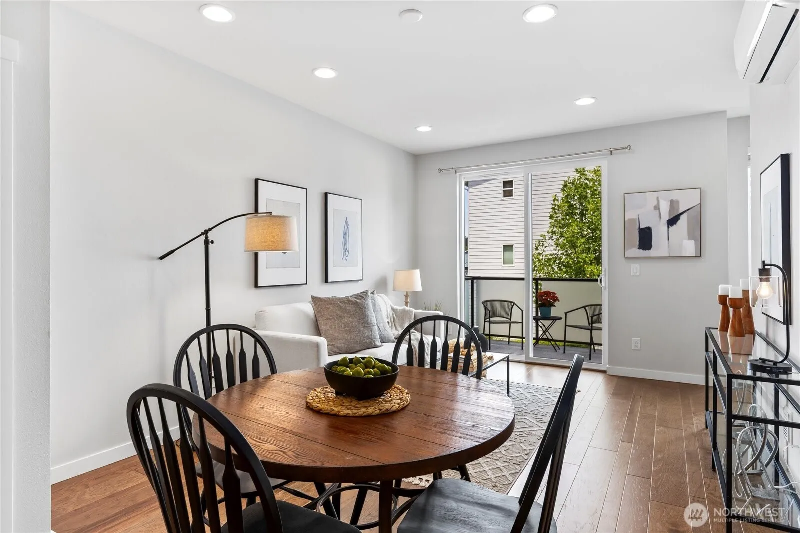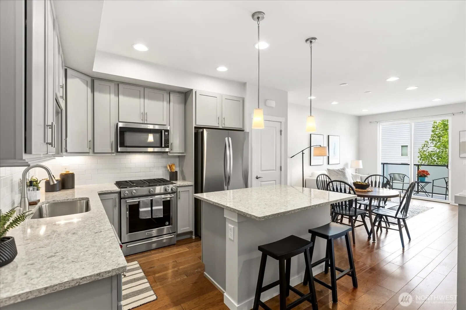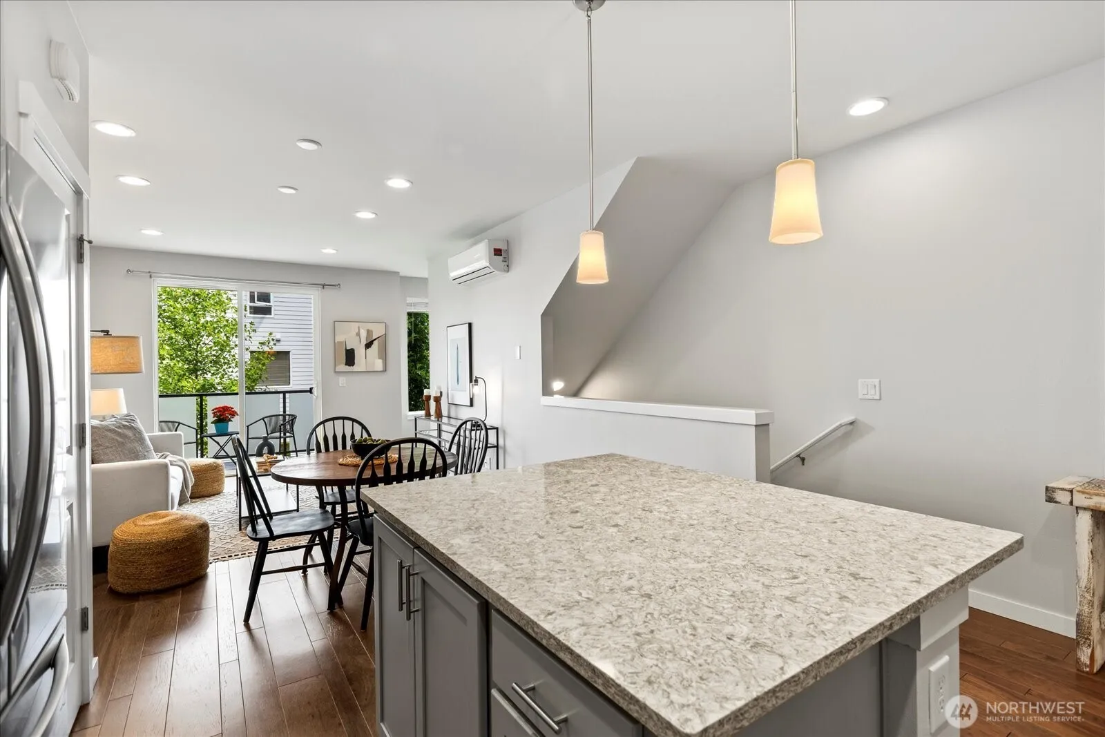 MOVE-IN READY, PRE-INSPECTED stylish 2 bed, 2 bath townhome nestled in Lake Forest Park blends modern design with everyday comfort. Enjoy flowing hardwood floors, fresh carpet, and open-concept layout. The kitchen shines with quartz counters, stainless steel appliances, and a gas cooktop. A main-level bedroom and full bath offer flexible use as a guest suite or office. Upstairs, the vaulted primary suite includes a ¾ bath, motorized shades, and 2 spacious closets. Stay comfortable year-round with mini-split AC and enjoy endless hot water with a tankless heater. The tandem garage includes extra storage. Steps from the Burke-Gilman Trail, dining, and breweries. Pet-friendly HOA maintains green spaces & nearby playground for your convenience.