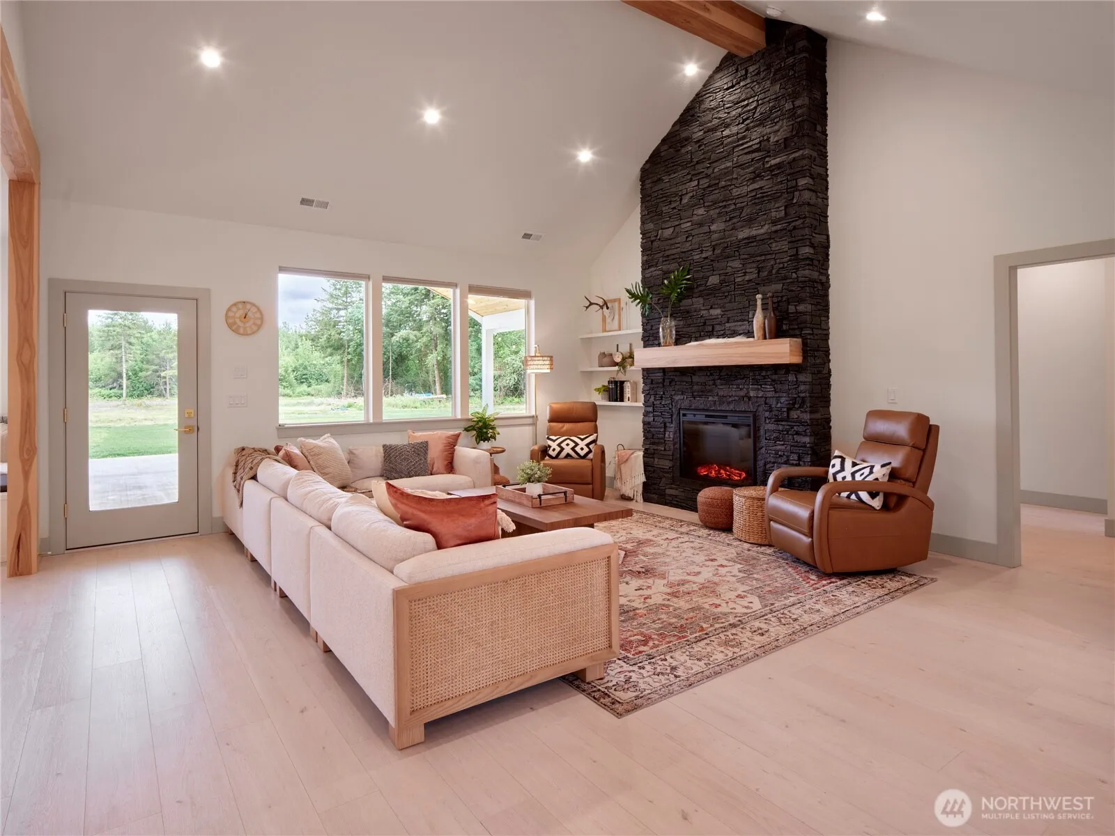 Located at the end of a quiet country road on 25 private acres this nearly brand new home dazzles with its clean design & finishes! Beautiful cedar paneled covered porch & inviting entry usher you into the open living rm w/vaulted ceilings & fireplace. Kitchen is a show-stopper w/Hickory cabs, white quartz cntrs & a built-in kitchen nook/bench (kitchen table stays!)&coffee bar +huge WI pantry. Primary Bed features a fireplace, fab bath w/tiled shower, dbl sinks & giant WI closet w/glass cabs. Laundry rm has a tiled dog shower! Oversized finished(insulated & heated too!)garage w/sep.rm for hobbies. Electric car charger. 24’wide Cedar T&G covered patio+extra patio space. Prepped for shop w/200 amps, water line& internet ran to site. MUST SEE!