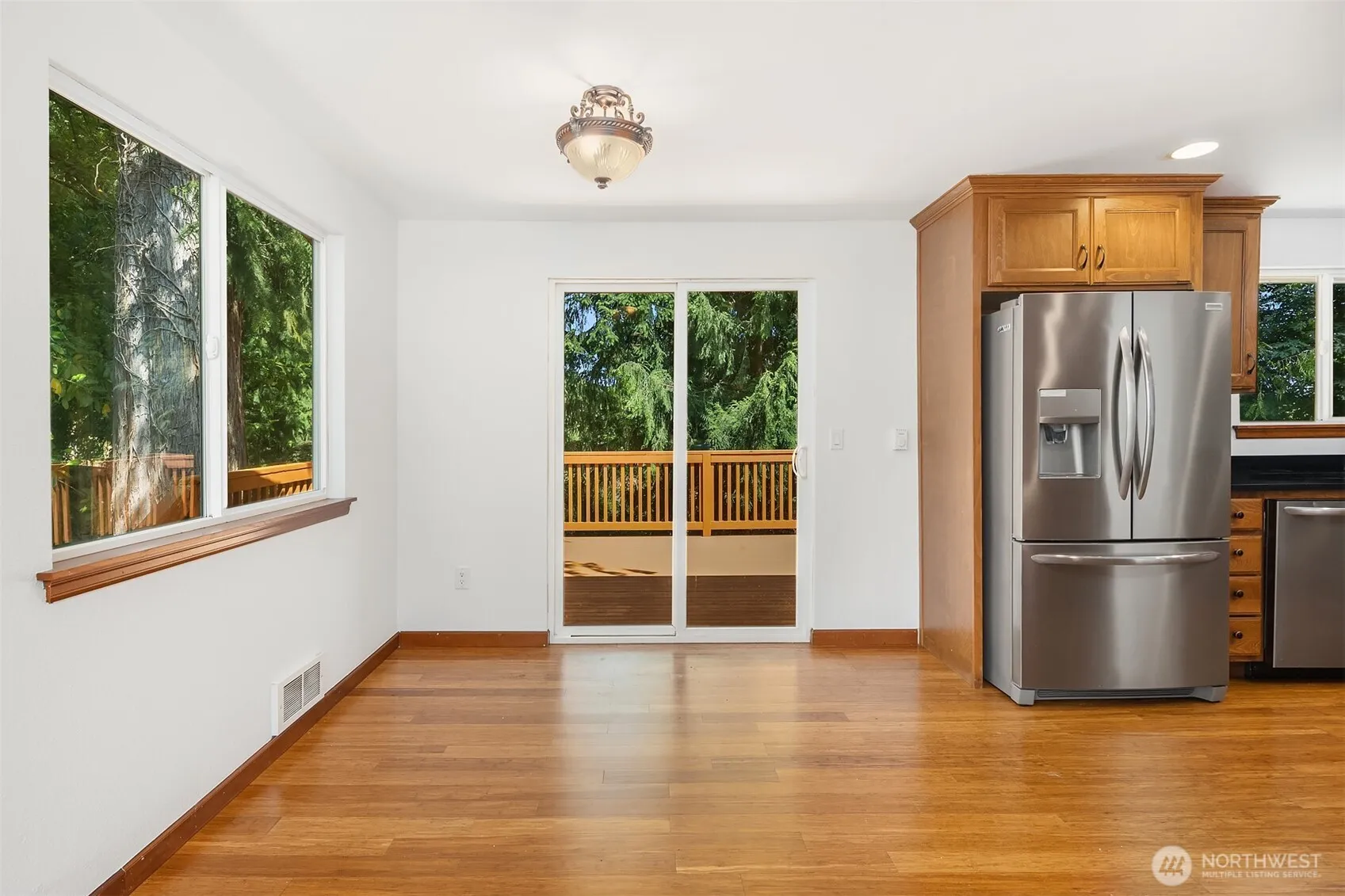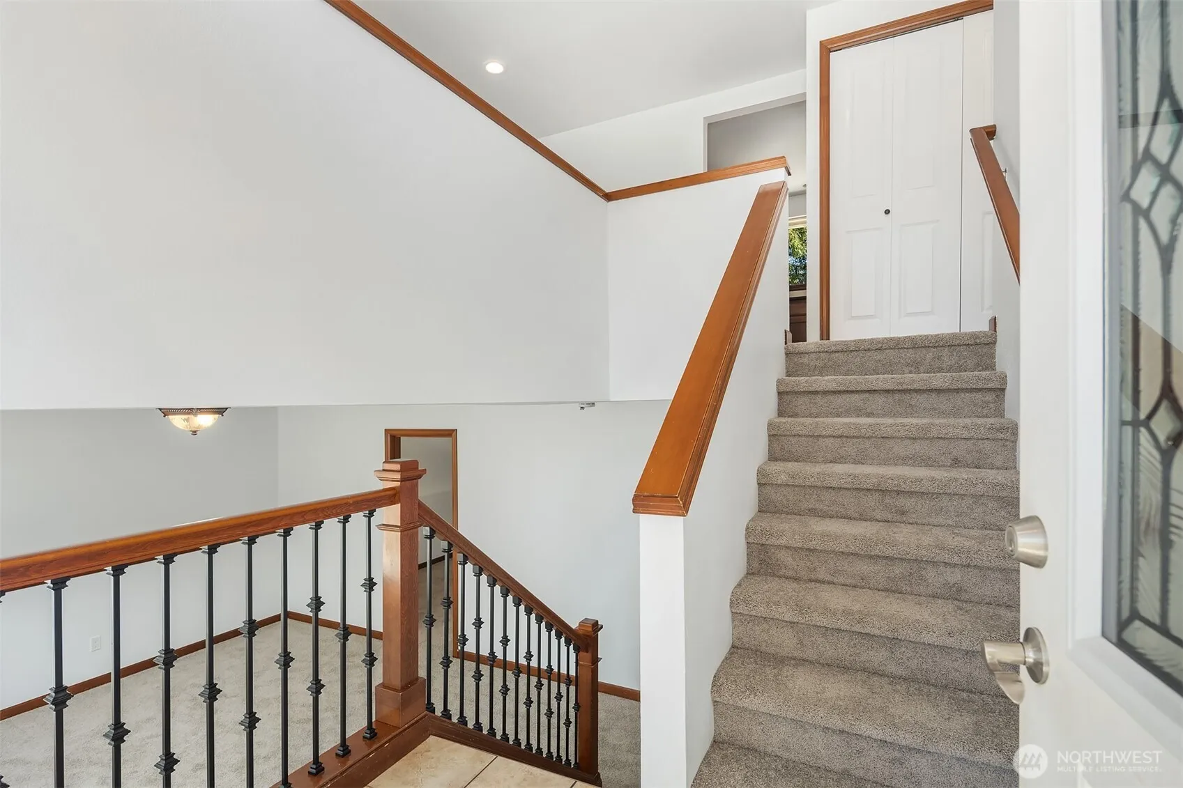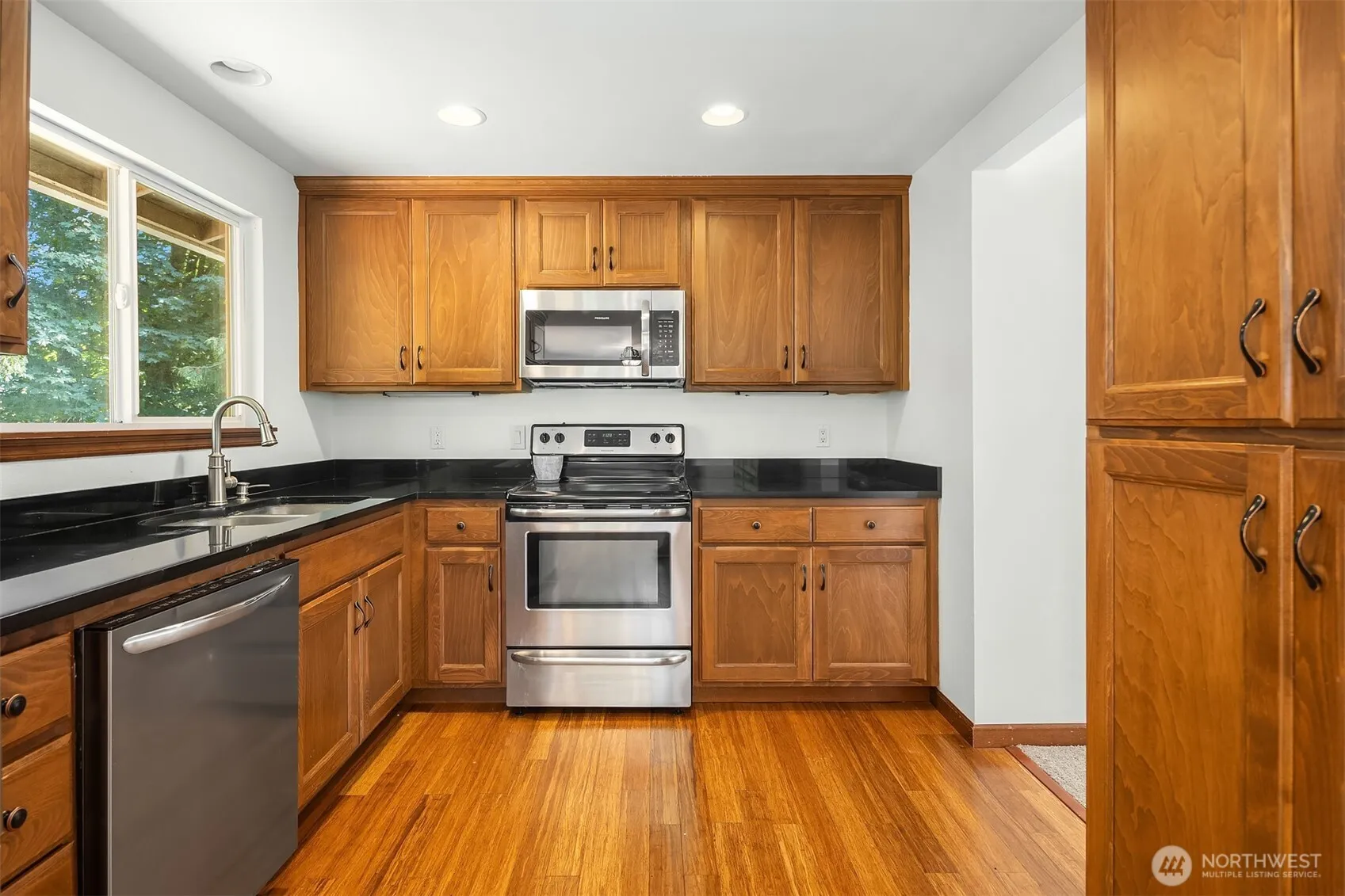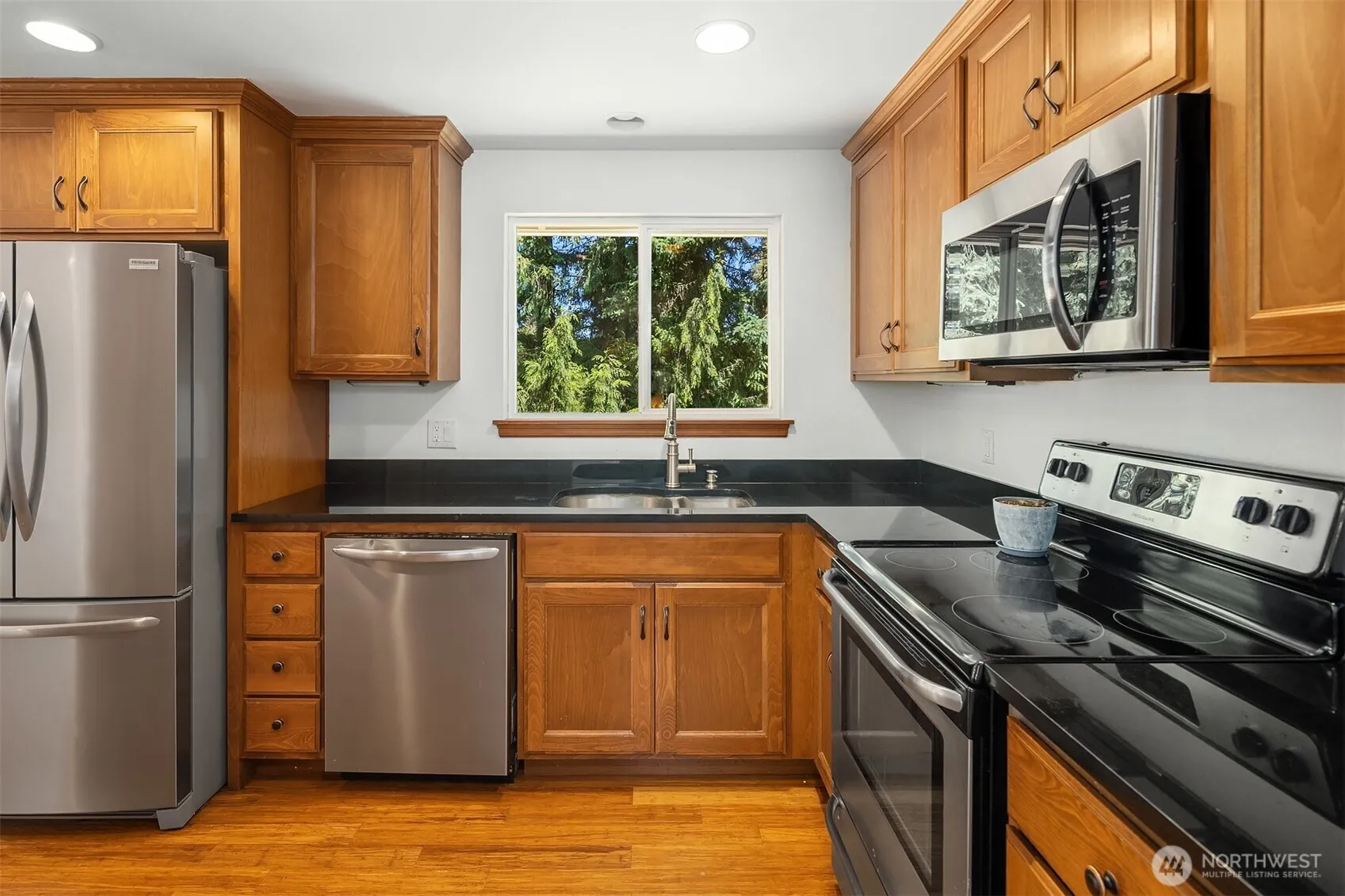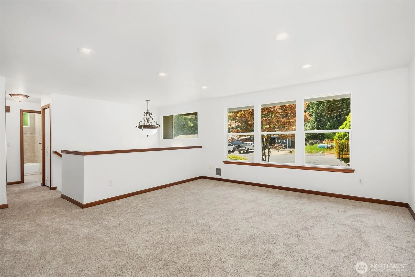 Move-in ready home with fresh paint, new carpet, and a brand-new roof! This spacious 4-bedroom residence sits on a quiet cul-de-sac and offers a versatile floor plan with 2 bedrooms up and 2 down—ideal for multi-generational living, guests, or a home office setup. The stylish kitchen features bamboo floors, stainless steel appliances, a pantry wall, and a mix of quartz and Corian counters. Enjoy a light-filled living room, large rec room, and dining area that opens to a deck—perfect for entertaining. Step outside to a fully fenced yard with a fire pit, ready for summer gatherings. Both bathrooms are updated with classic tile finishes and a clean, modern style.