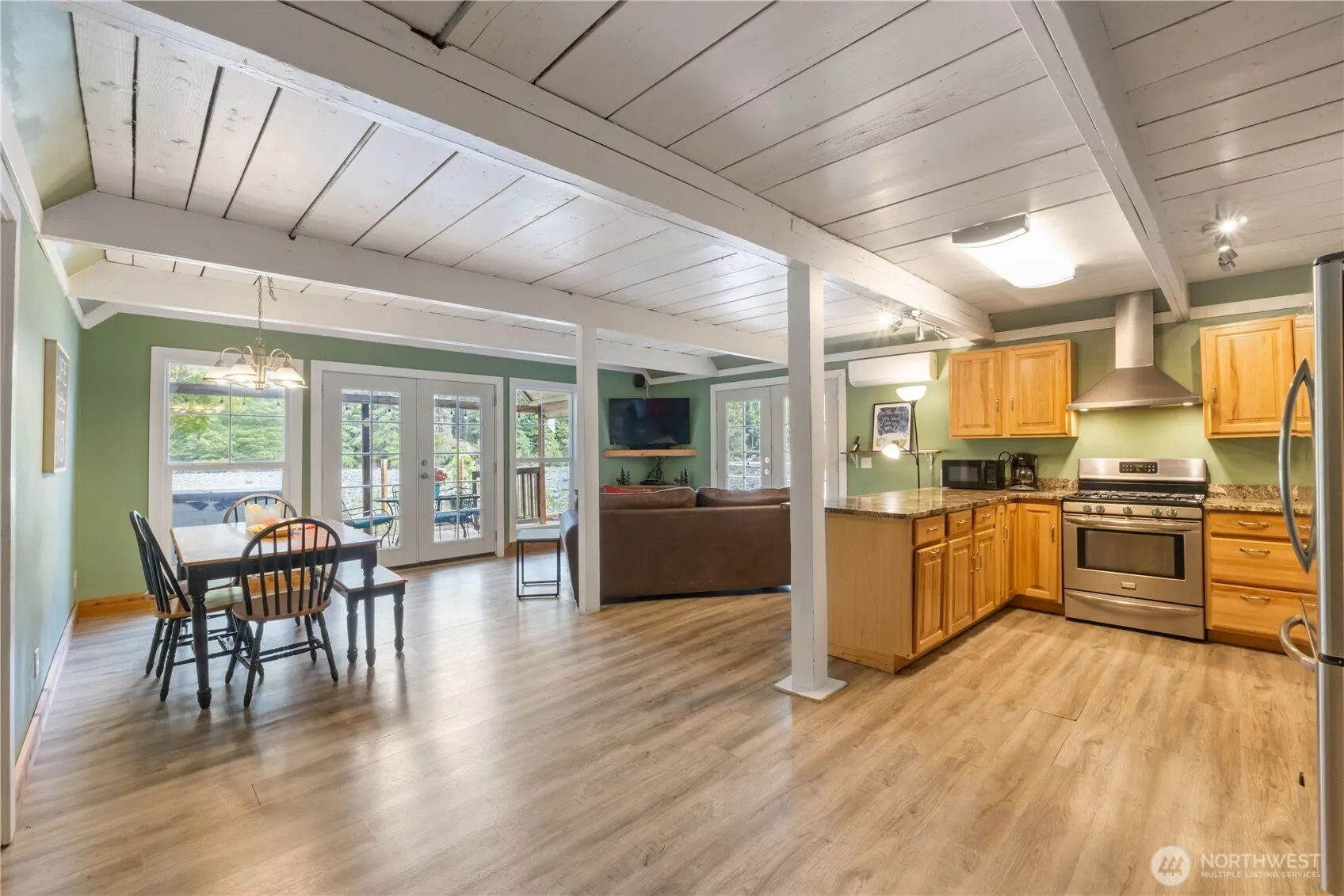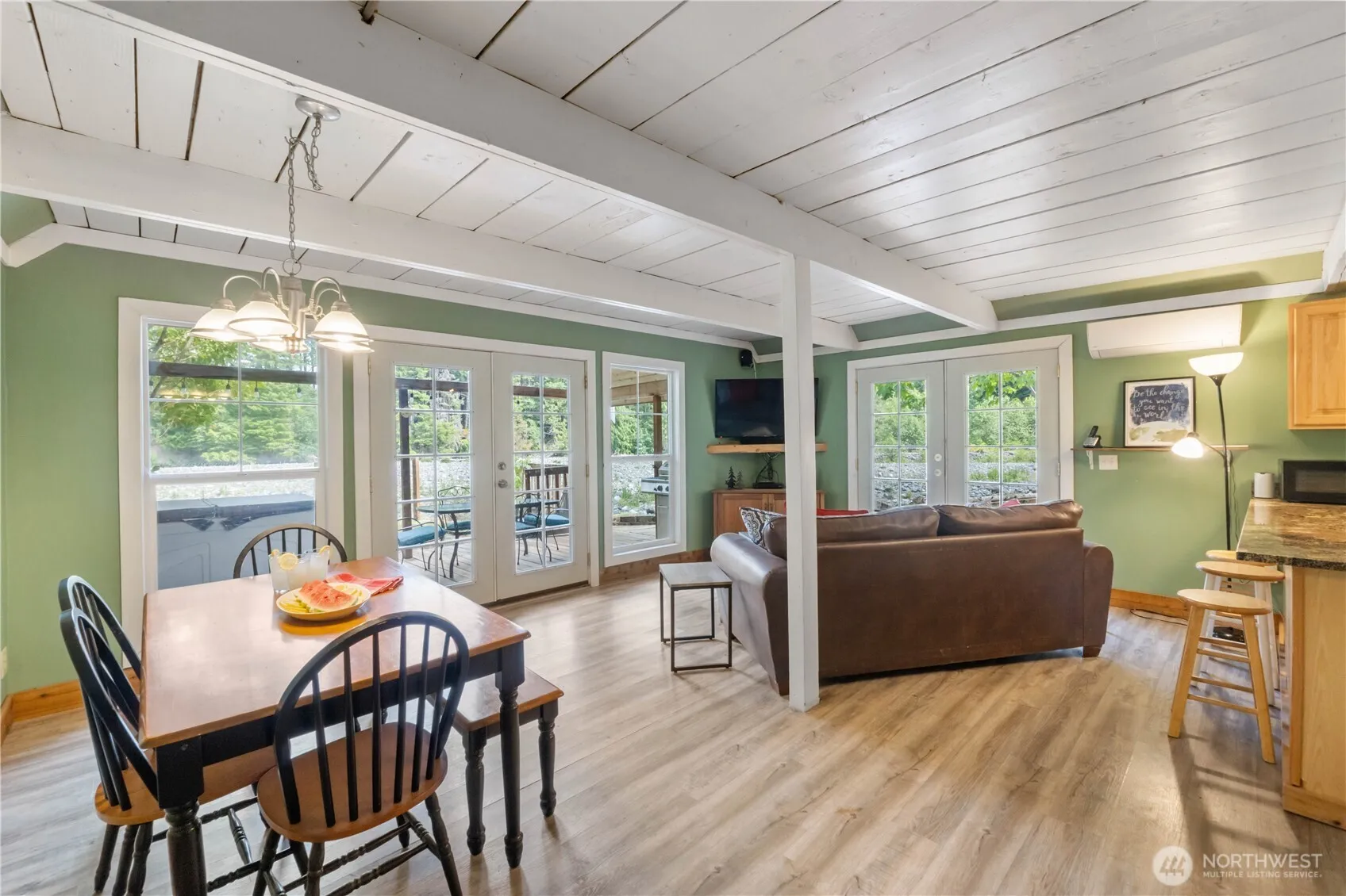 Great new price & time to get in before the Crystal Mtn 25-26 ski season begins. 4.39 level acres in Greenwater, 19 miles to CM Resort. 3 Bed/2 Bath home, positioned on the bank of the White River, has been a popular vacation rental. Generous primary suite & bedroom on main level. Addt’l bedroom, bonus room & nook upstairs, can easily sleep 10. A substantial patio & boardwalk winds thru a private garden, leading to a 148 SF art studio/office w/ garden shed. Tranquility at your doorstep. If you like relaxing to the mesmerizing sound of a river while soaking in a hot tub or chilling out in the mountains after a day on the slopes & trails, then this is the place for you! Partially fenced meadow has power for RV, septic connection. Auto Gen.