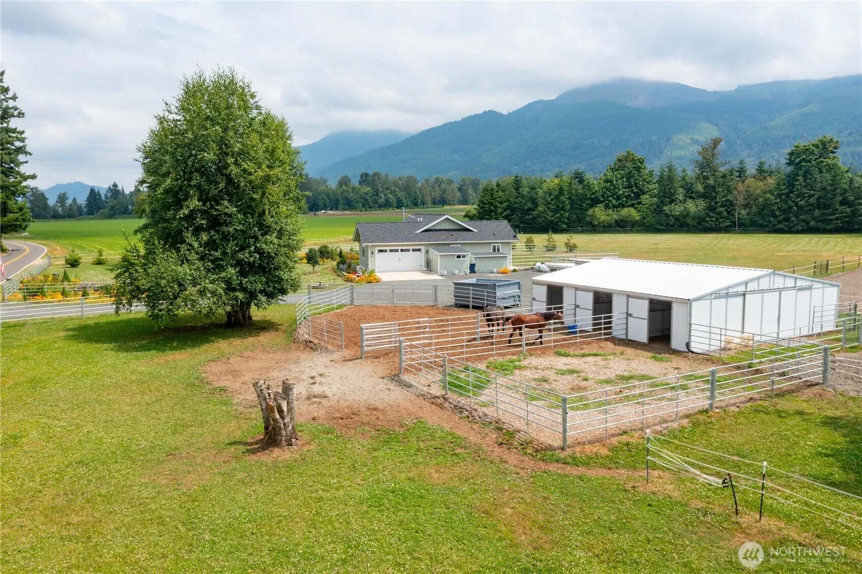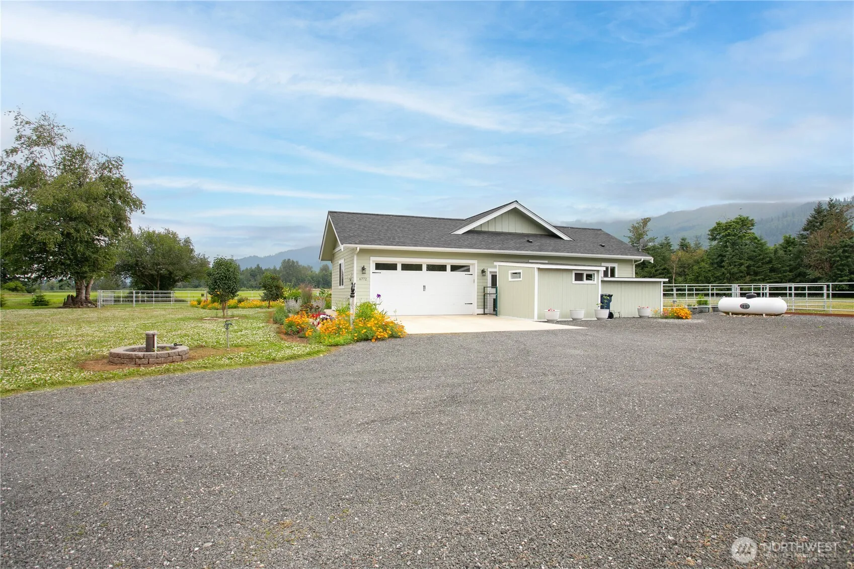 Like-New, single-level home w/3-stall barn on prime, 5 level acres. Built in 2020 by Chuck Handy, this 3BD, 2BA home, offers wide plank LVP flooring, quartz countertops, AC, 50 yr roof & quality wood cabinets, trim, & doors. Gorgeous primary w/large walk-in closet & spa like bath. Open concept living flows seamlessly from kitchen to living area w/wood burning fireplace. Attached 2-car garage + storage sheds. Property has sandy loam soil—ideal for year-round turnout—is fully fenced & cross-fenced. Noble fencing & barn w/hay storage, tack rm & matted stalls, each w/individual runs + detached 12×12 run-in shed. 120’x60′ outdoor arena & multiple pastures. Gated entry, with private, peaceful setting that backs to Sumas Mtn—welcome home!