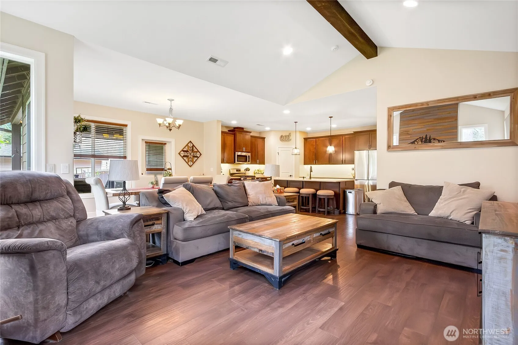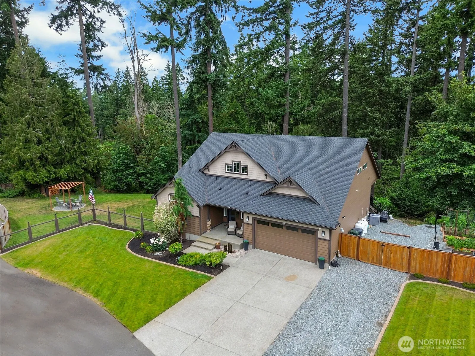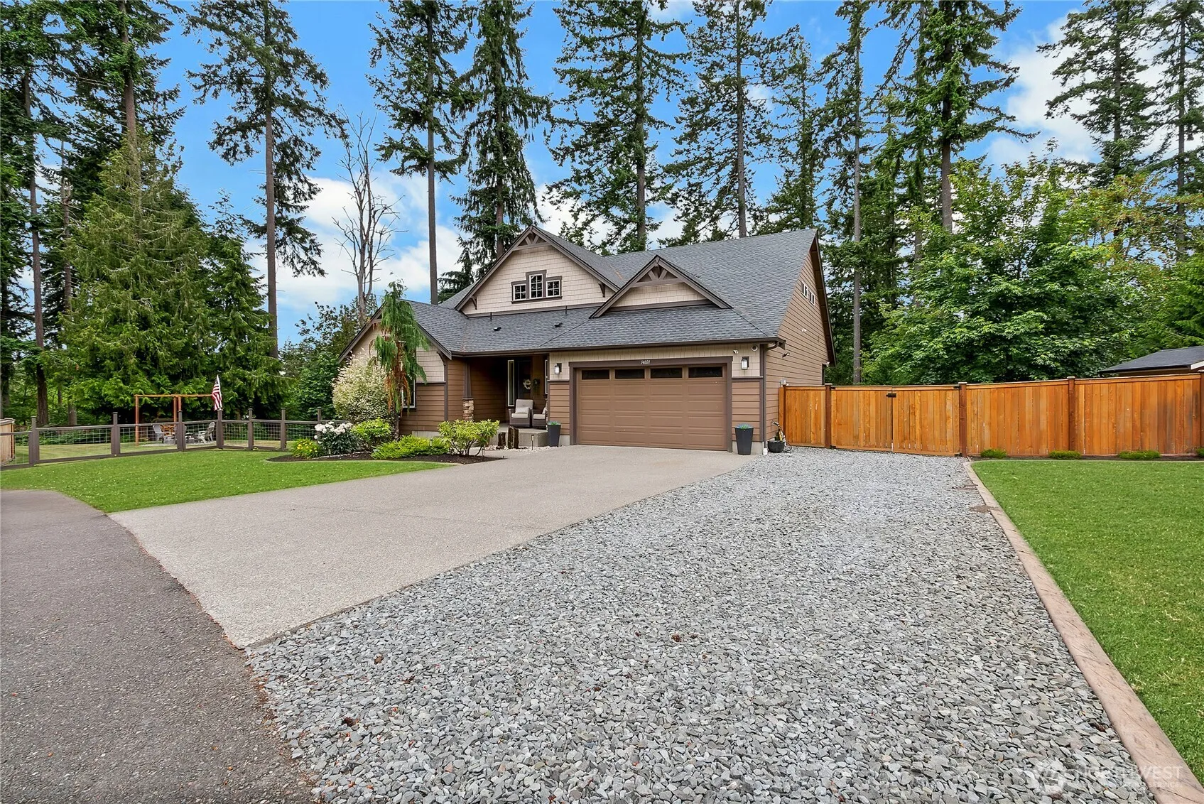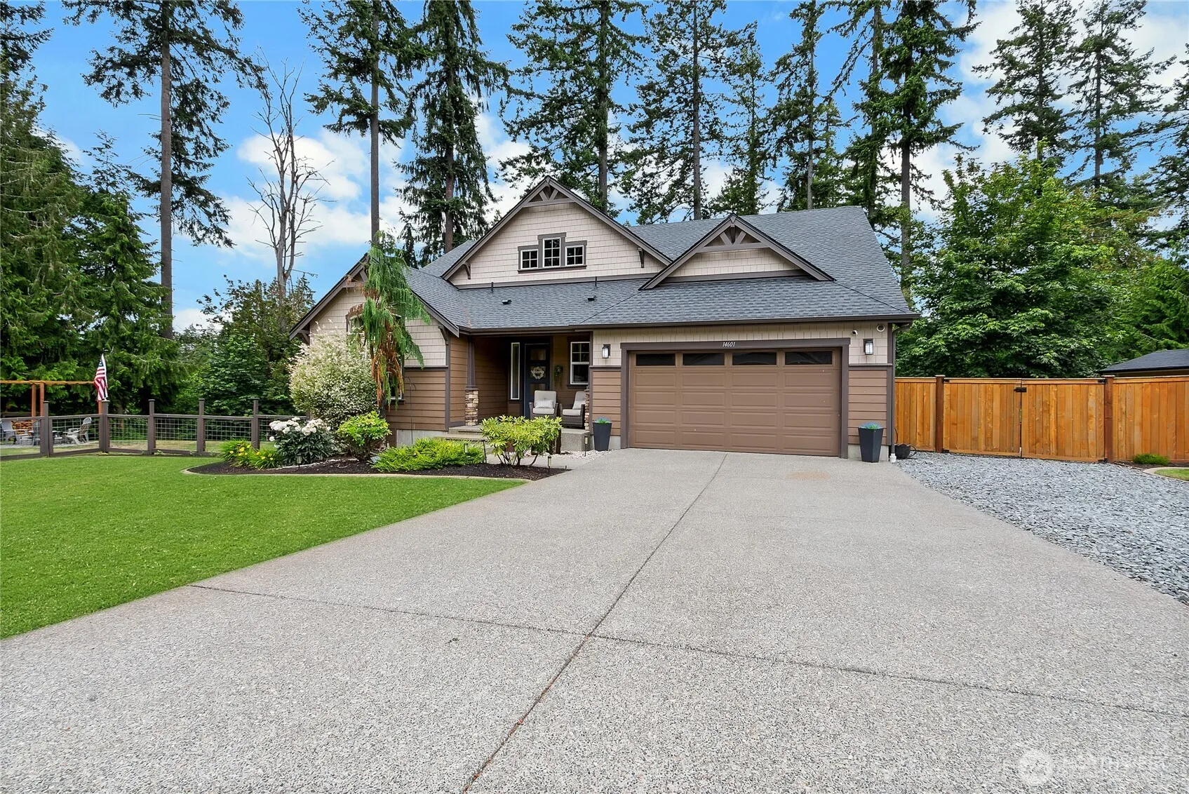 This gorgeous rambler (with a massive loft) is situated in a private, gated community on over an acre of serene, partially forested land. Step inside to be greeted with soaring ceilings, oversized windows, and gorgeous finishes, down to newer flooring, quartz countertops, and newer stainless steel appliances. The open concept layout makes this nearly 2,000sqft home live large, as does the covered back deck, overlooking the lush greenery behind the house. An oversized 3 car garage AND RV parking allow ample room for whatever your heart desires. Situated just minutes from downtown Orting, you can reap the benefits of privacy, without being too far from restaurants, shopping, and everything you want in a small town!