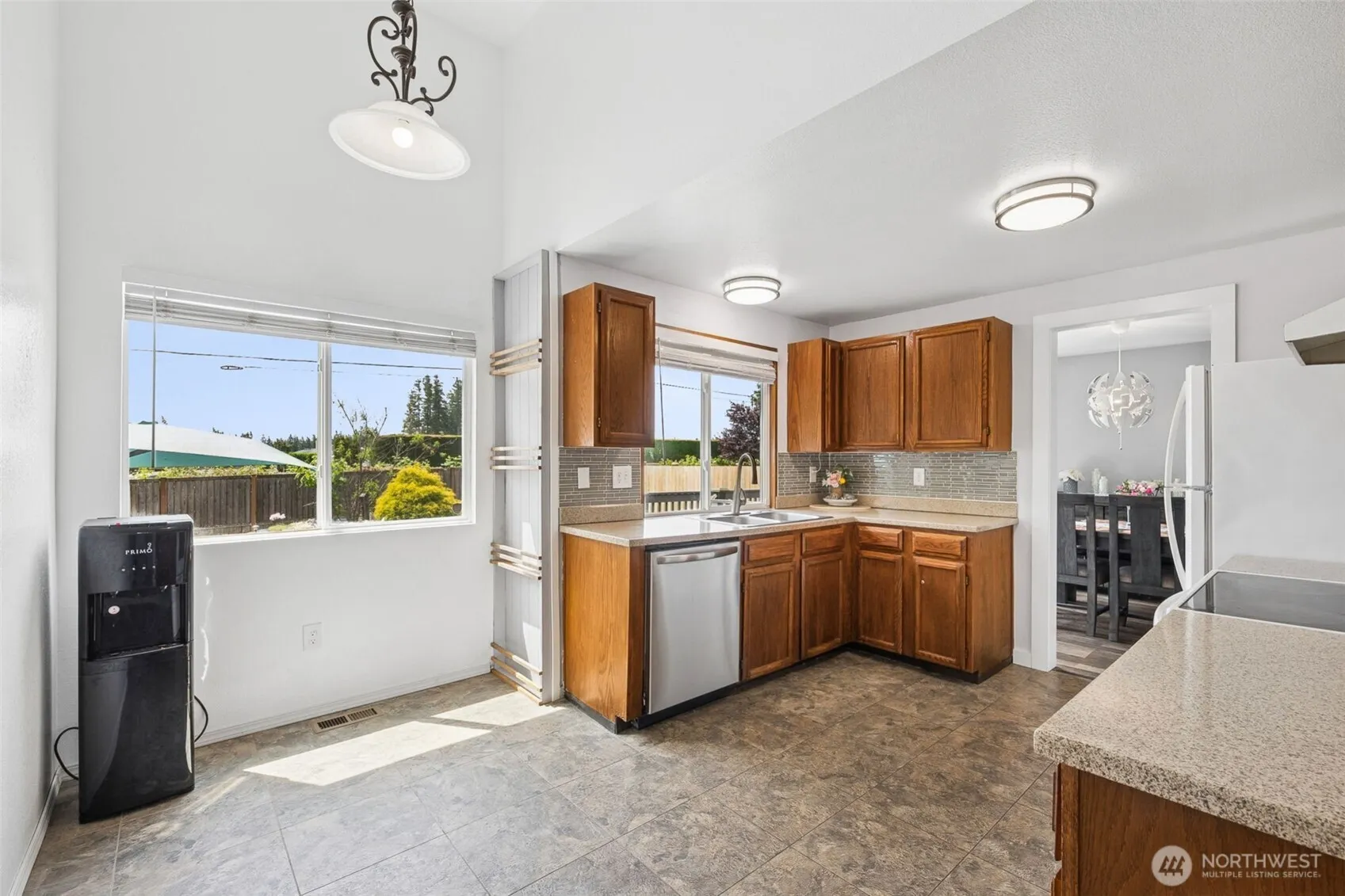 Welcome to this beautifully maintained tri-level home in the desirable Cherokee Bay community! Tucked in a quiet neighborhood, this 3-bedroom gem features vaulted ceilings, a cozy fireplace, and natural light throughout. Enjoy the updated kitchen, spacious layout, and a large fenced backyard perfect for entertaining—complete with a mountain view and double-gated RV parking. Downstairs offers a dedicated office and bonus room, ideal for guests or hobbies. Solar panels (2019, paid off), roof, and windows (2019) provide efficiency and peace of mind. Community perks include private lake access, clubhouse, park, and sport courts—all within the Tahoma School District! This home has it all!!