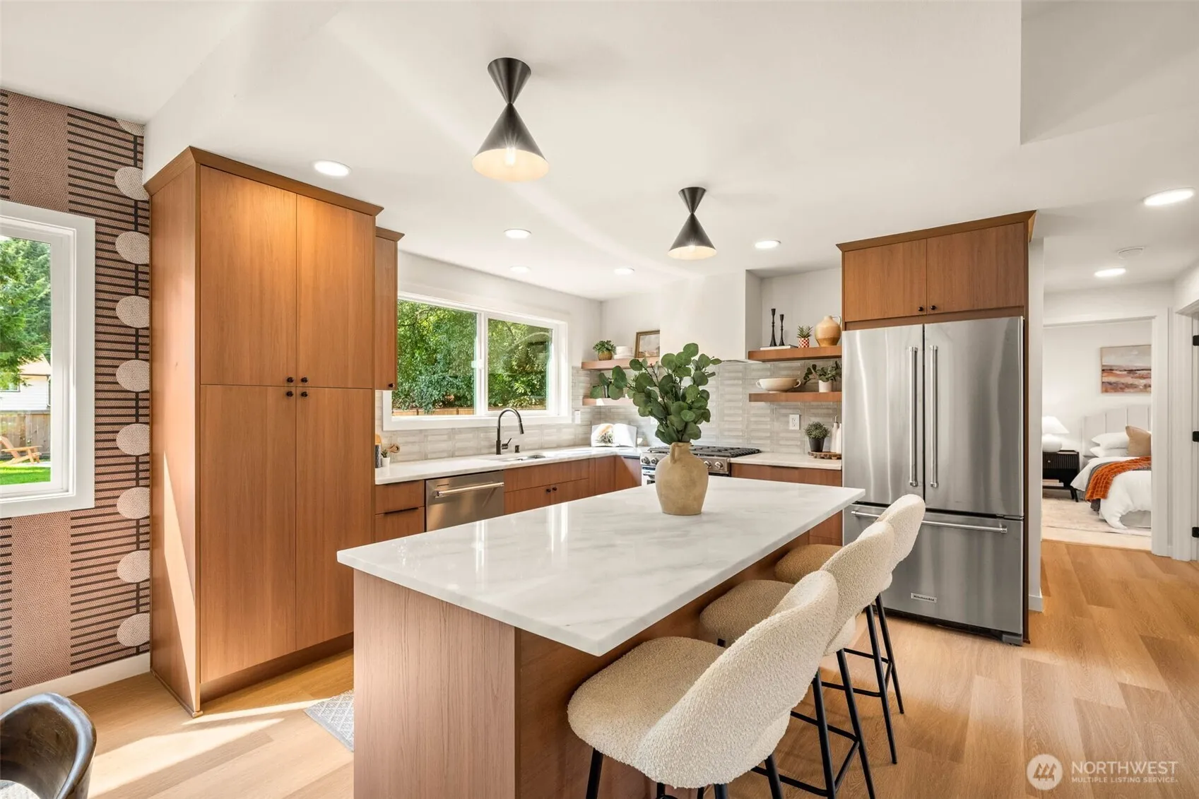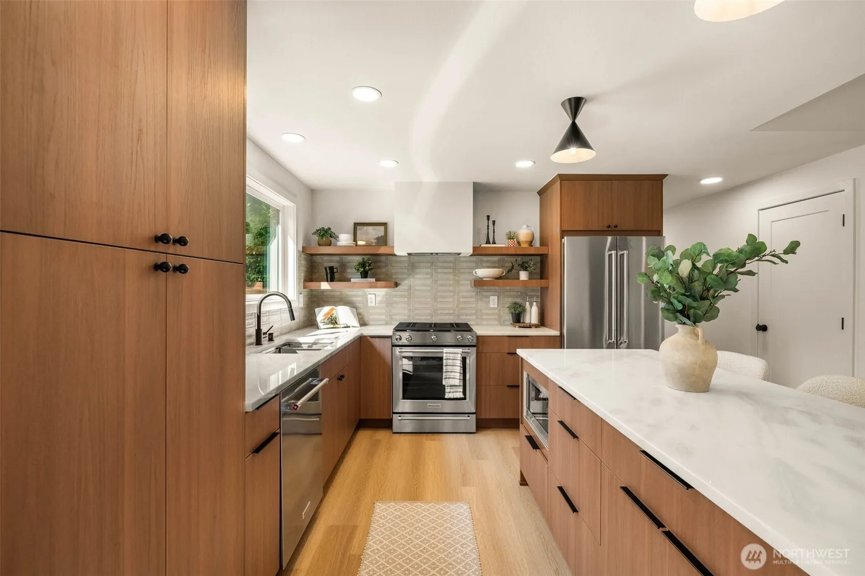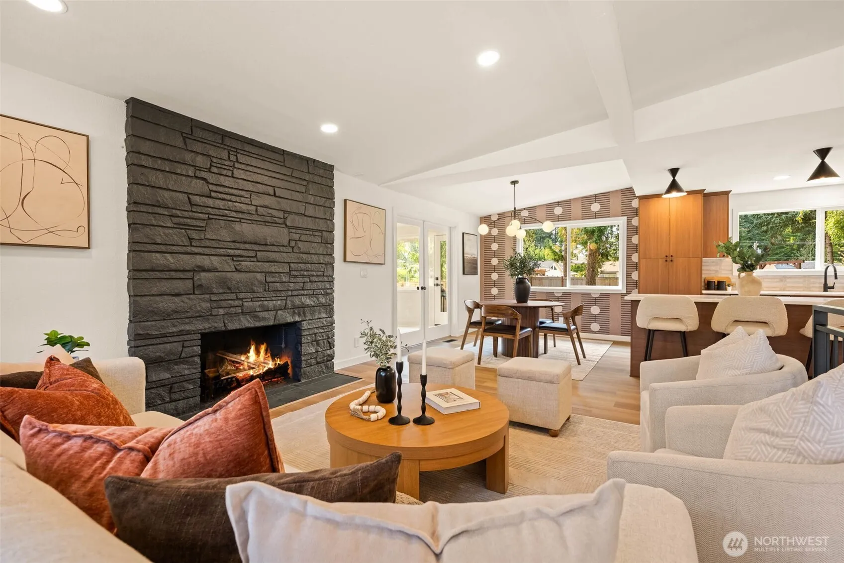 Stunning mid-century home in Edmonds’ Perrinville neighborhood. This spacious 4 bedroom, 2.75 bath home offers timeless mid-century charm with modern updates. Enjoy a bright upper-level primary suite with a huge walk-in shower, plus brand-new gas furnace and tankless water heater, fully permitted plumbing and electrical. The lower level features a cozy living room with fireplace, two additional bedrooms, and direct garage access, perfect for multi-generational living. A versatile sunroom/office opens to a 9,500 square foot fully fenced backyard. Exposed brick, sleek black windows, and thoughtful upgrades make this home a true standout.
