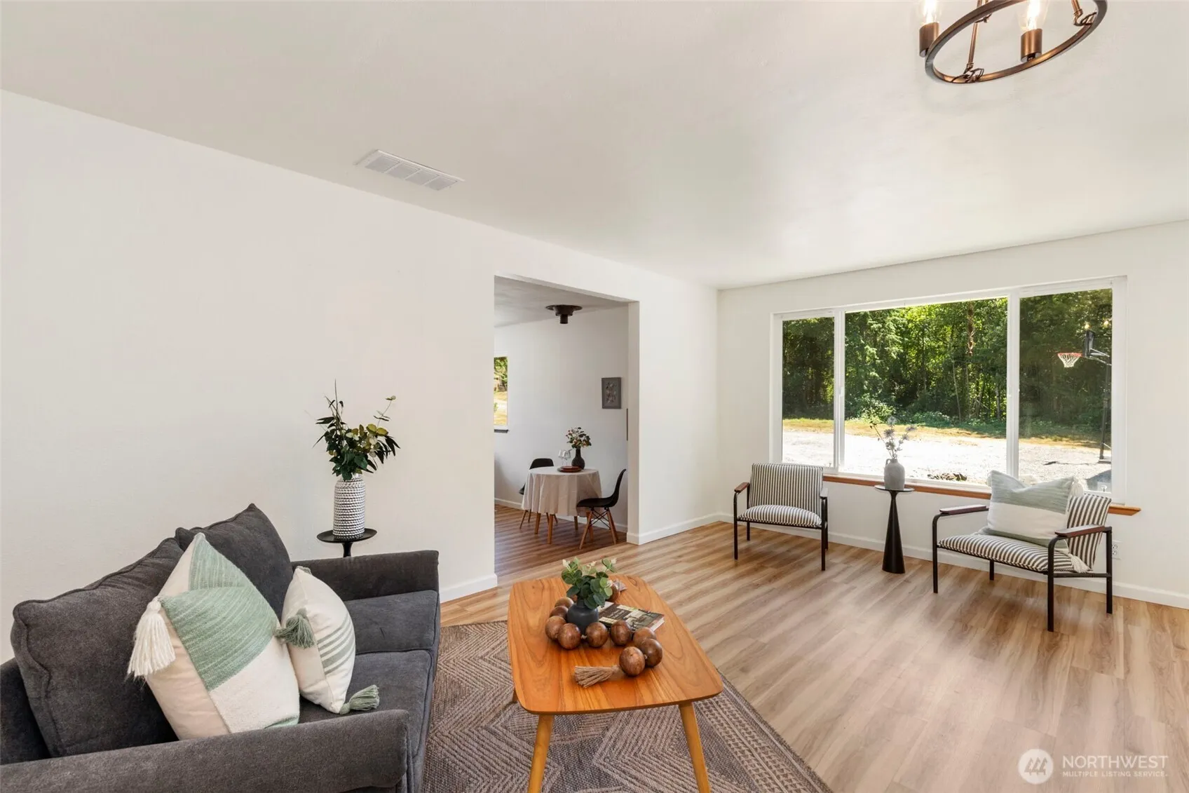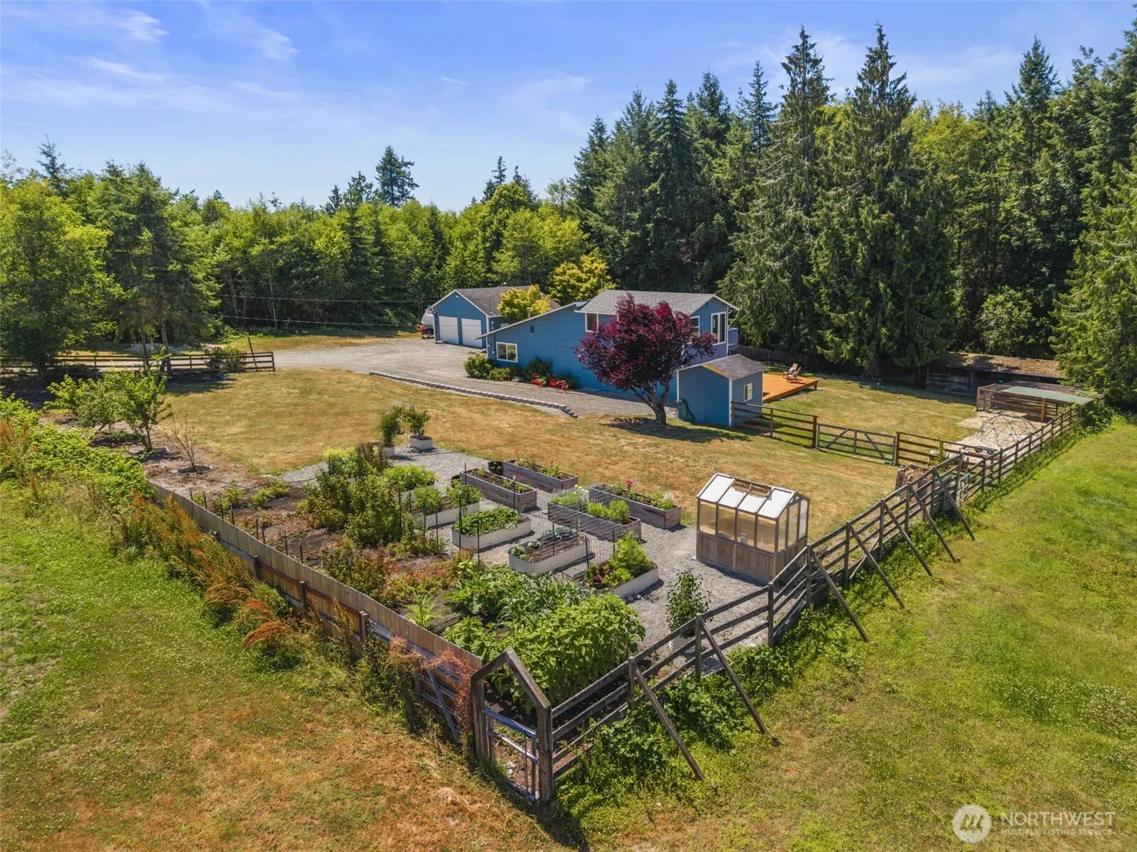 Spacious 2508 sqft Kingston home on just under one acre! Multiple living areas with low maintenance laminate floors, cozy fireplace and built-in cabinets. Large main level primary bedroom with 3/4 bath and walk-in closet. Kitchen with newer SS appliances and quartz counters with slider leading to the huge new deck. Main floor guest bedroom with attached 1/2 bath, office, 3/4 bathroom and bonus room. Upstairs large private bedroom with full bath and slider leading to the balcony. The level .92 acre lot features raised garden beds, stable, chicken coop, storage sheds, hot tub and fire-pit. Oversized detached garage, RV/boat parking, plus new Heat Pump! Great location just minutes to shopping dining and easy access to Kingston Ferries.