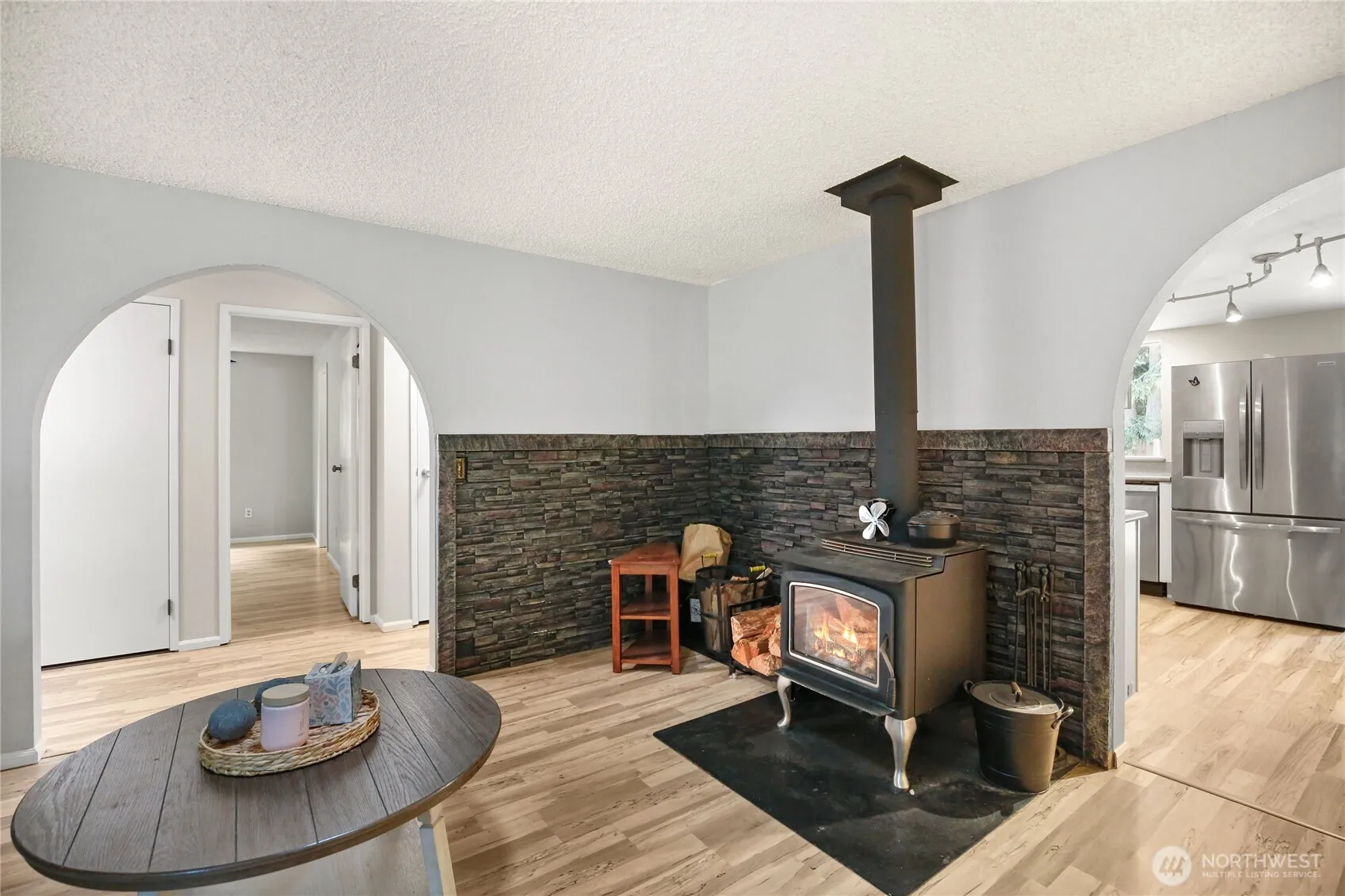 This charming single-level 4-bed, 2-bath home offers both formal and informal living areas, one with a cozy wood stove, the other with access to the deck for extended living space. Enjoy a bright, open kitchen with stainless appliances, a breakfast bar, and abundant counter space. The split-bedroom layout provides privacy, with the primary suite featuring its own bath. Fresh paint and low-maintenance flooring flow throughout. All appliances included in this move in ready home. Relax on the large deck overlooking a tree-lined, private backyard. Nestled in a quiet, established neighborhood near Indianola, White Horse Golf Course, and just minutes to Kingston ferries for easy access to Seattle or Edmonds.