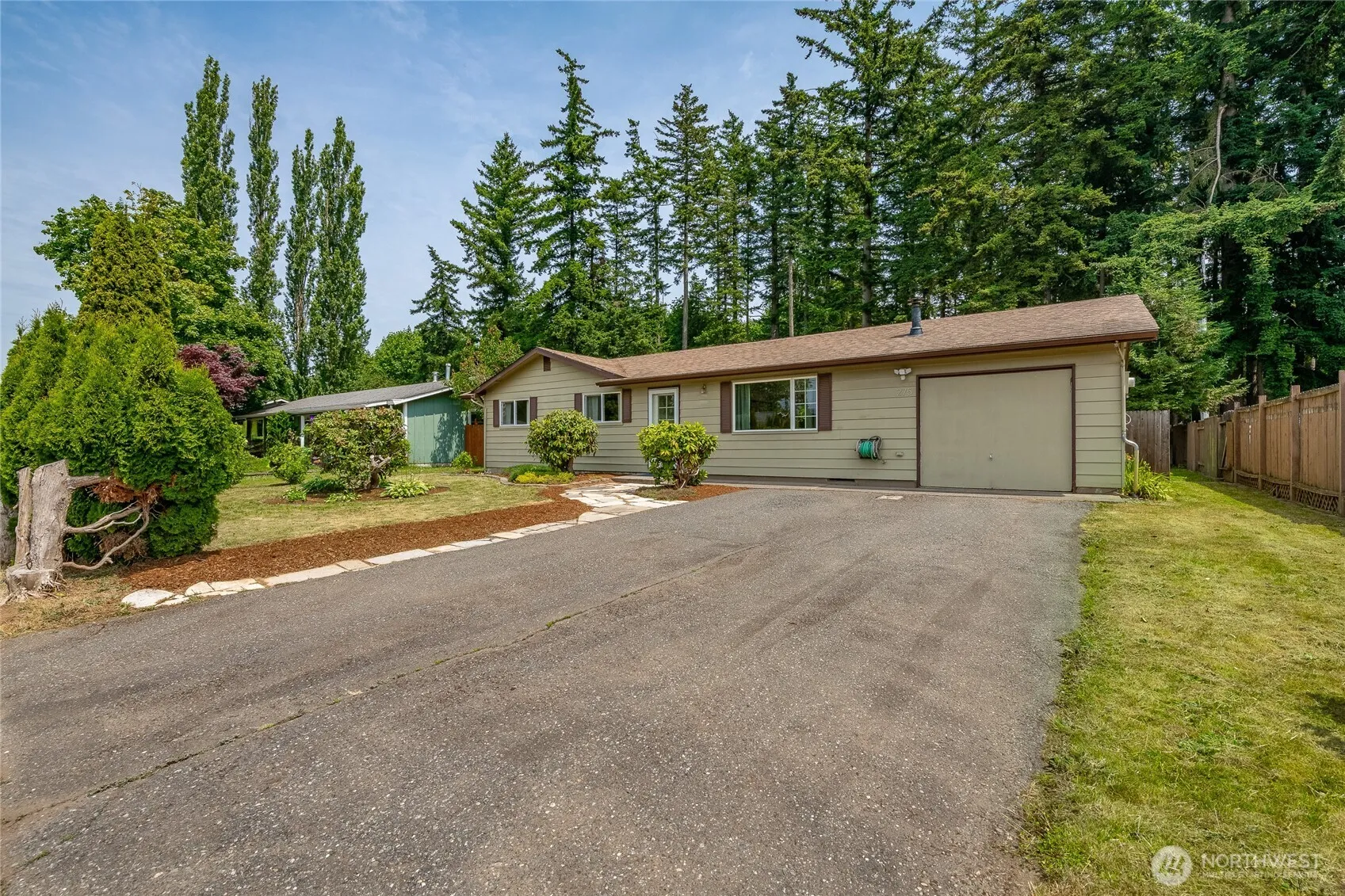 This charming single-level home is perfectly located between Lynden and Bellingham. You will appreciate the size and layout, situated in a friendly cul-de-sac. Be welcomed into the living and dining room space with 3 bedrooms and an oversized updated bathroom. The light and bright kitchen has white appliances and granite countertops. There is a bonus flex room for storage or a potential pantry. Delightful landscaping with stone pavers, flowering shrubs, rose bushes, plum trees, and delicious loaded cherry trees. Enjoy the privacy of the fenced backyard with a patio perfect for barbecuing and entertaining on warm summer days. Large shed for extra storage or hobbies, plus a 1-car garage. Whether for yourself or investment, this one’s a cutie!