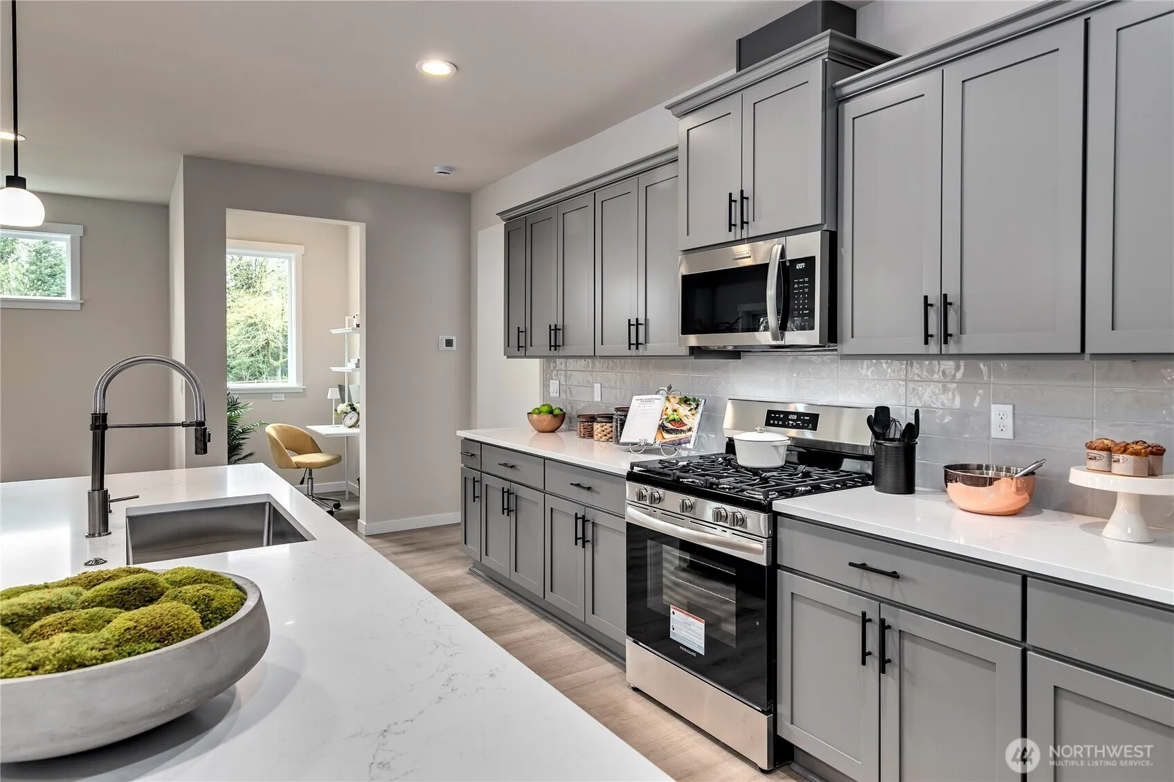 Hillsdale Model Home! Minutes to Silverdale, Bangor, Puget Sound Shipyard. Central Kitsap Schools including the neighboring Silverdale Elementary w/community gate access & recently built CK Middle & High. Home features quartz counters, luxury vinyl plank flooring, soft close cabinets, fully landscaped yard w/sprinkler system, fenced rear yard, heat pump providing year round heating & cooling comfort, and fiber internet! Site Registration Policy: Buyer Broker registered on 1st visit & Broker w/client on 1st or 2nd visit. Estimated closing for December. Home includes fridge, full window case, custom counters, yard sprinkler system. Corner lot with views towards Mt Rainier and Dyes Inlet.