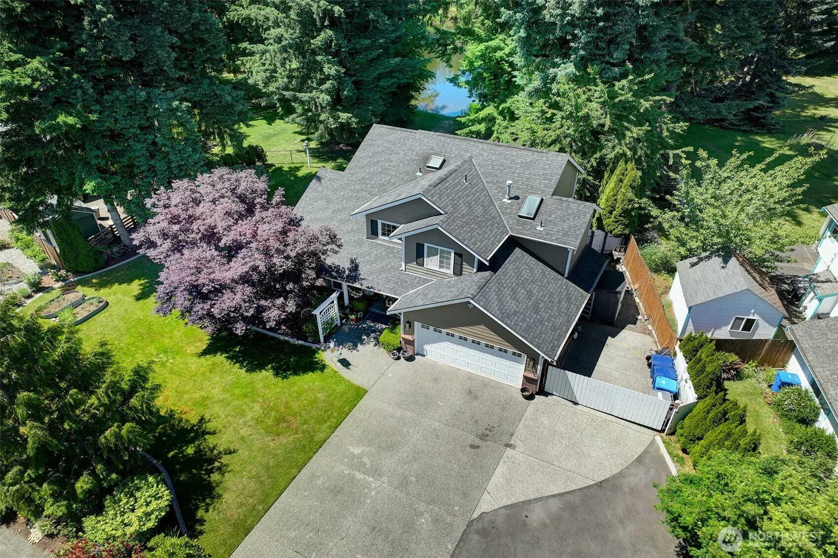 Peaceful oasis nestled along the tranquil shores of Evergreen Pond! Beautifully updated 4-bed, 2.5-bath home on shy 1/3-acre waterfront lot offers serene water & landscape views from nearly every room in the house! Modern farmhouse touches throughout; vaulted ceilings in living/dining room; spacious family room w/gas fireplace. Kitchen features newer stainless appliances, updated countertops & backsplash; Peninsula & breakfast nook for casual meals. Step outside to your own private retreat—an expansive deck with built-in seating and a covered entertainment area, ideal for summer evenings or morning coffee while watching ducks paddle by. Fenced backyard. Beautifully maintained landscape adds a polished touch to the lush, colorful yard.