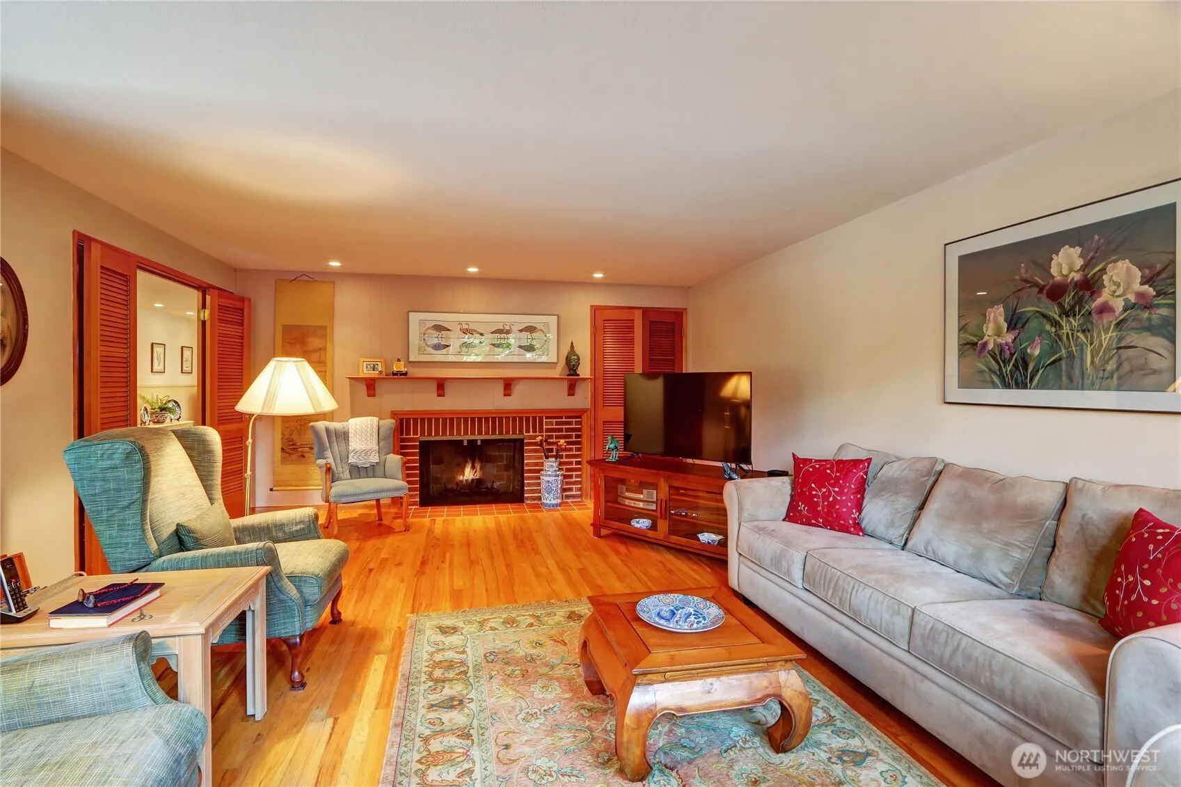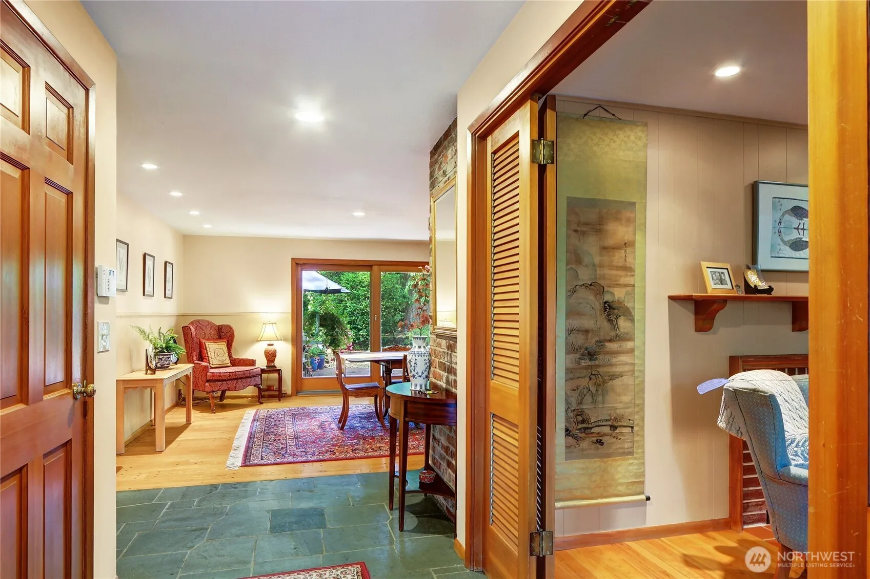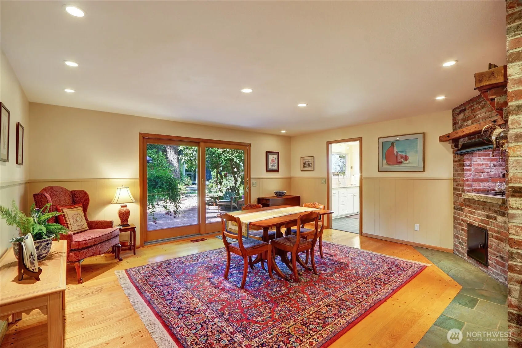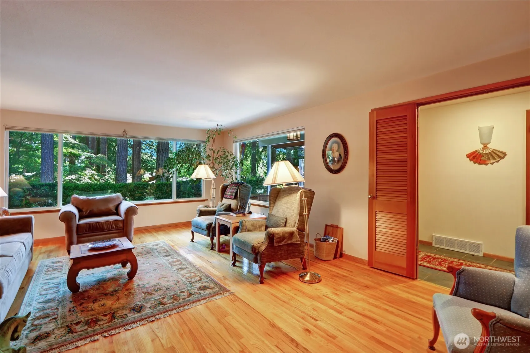Coveted Lake Forest Park! Classic mid-century rambler sited on serene 12,500+ sq ft lot. Gracious one level living with 3 bedrooms, 3 baths, huge 3 car garage (4th bedroom and more potential). Serene end of cul de sac location. Extraordinary grounds are your own private arboretum, including stamped concrete patio and a garden house with covered deck for year round enjoyment. Large living room with paneled walls, fireplace, new picture windows. Bonus room with second fireplace. Eat in kitchen with handy 3/4 bath off it; between garage and garden. Primary bedroom with private bath. Stunning original slate entry and solid wood doors throughout. Lovingly cared for and upgraded over the years with recent roof, windows, flooring, furnace, + more