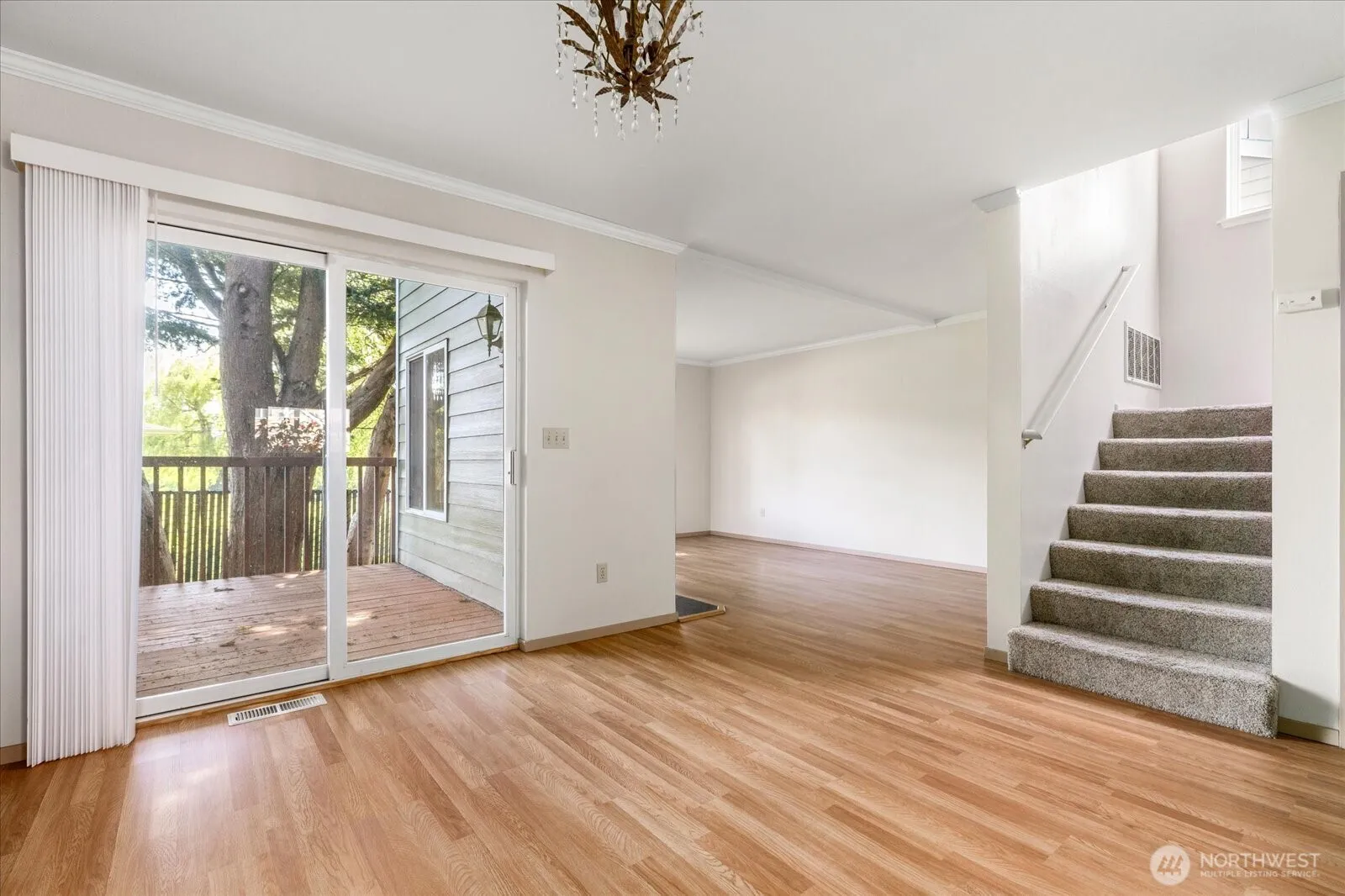 Easy living! Travel? Deployment? Just lock the door & go without worry. This unit is ready to move in & enjoy! Living area offers large windows for plenty of light & view of the treed area behind the unit plus a cozy gas fireplace for cold winter evenings. Kitchen offers plenty of storage & counter space with updated appliances. Enjoy evenings on the private back deck just off the dining area. You will enjoy extra light from the window in the stairwell that is only available in the end unit. Primary suite offers walk-in closet & full ensuite. Other two bedrooms on upper level share a full bath. The one car garage offers laundry hook-ups & all appliances included. Come enjoy comfortable & affordable living!