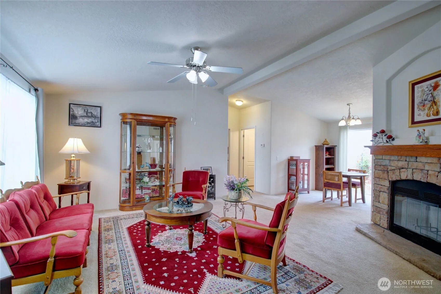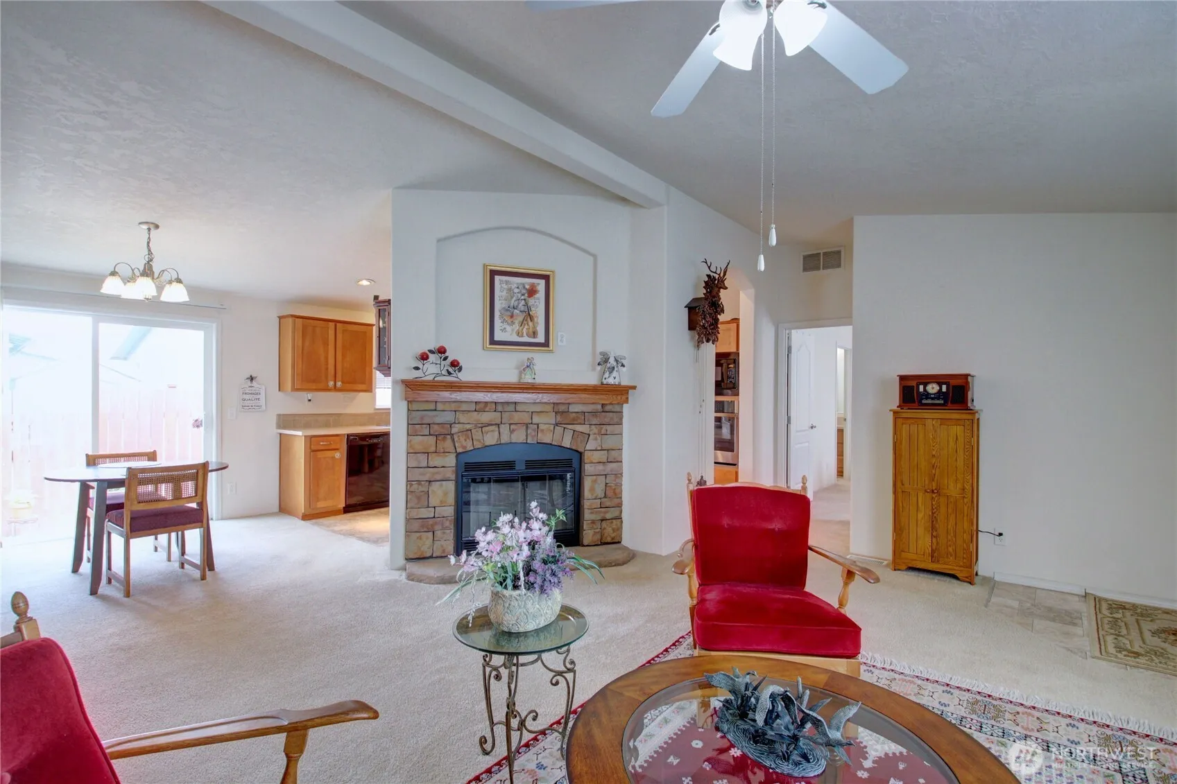Welcome home to Portal Creek 55+ Park!! Step into this well-maintained and beautifully landscaped home. 3 bedrooms, 2 bathrooms. All bedrooms have walk in closets. Vaulted ceilings throughout help create an open living concept – Cozy living room w/wood burning fireplace. Kitchen includes brand new oven, dishwasher, glass cooktop, microwave & fridge. All appliances included. Master suite w/ walk-in closet and full bath w/grab bars. Master on one end, 2 bedrooms on the other. Finished 2 car garage w/ramp to house & exterior door. Back yard patio and gravel area fully fenced is perfect for dog run. Fenced yard for maximum privacy. Gardeners delight w/ beautiful plants, trees and flowers.